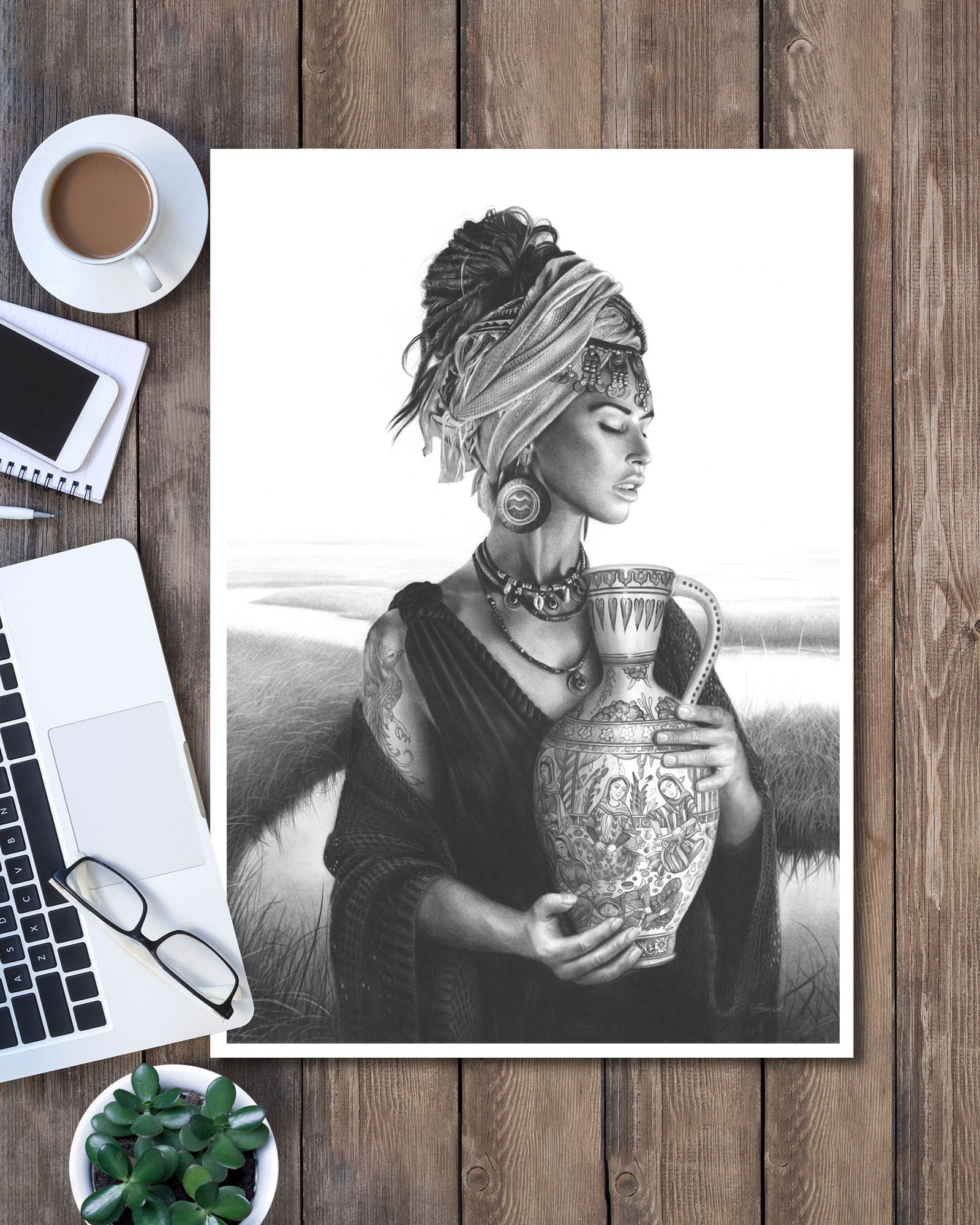 Archival print on cotton art paper. Charcoal and pencil drawing of a woman representing Aquarius in the signs of the Zodiac.