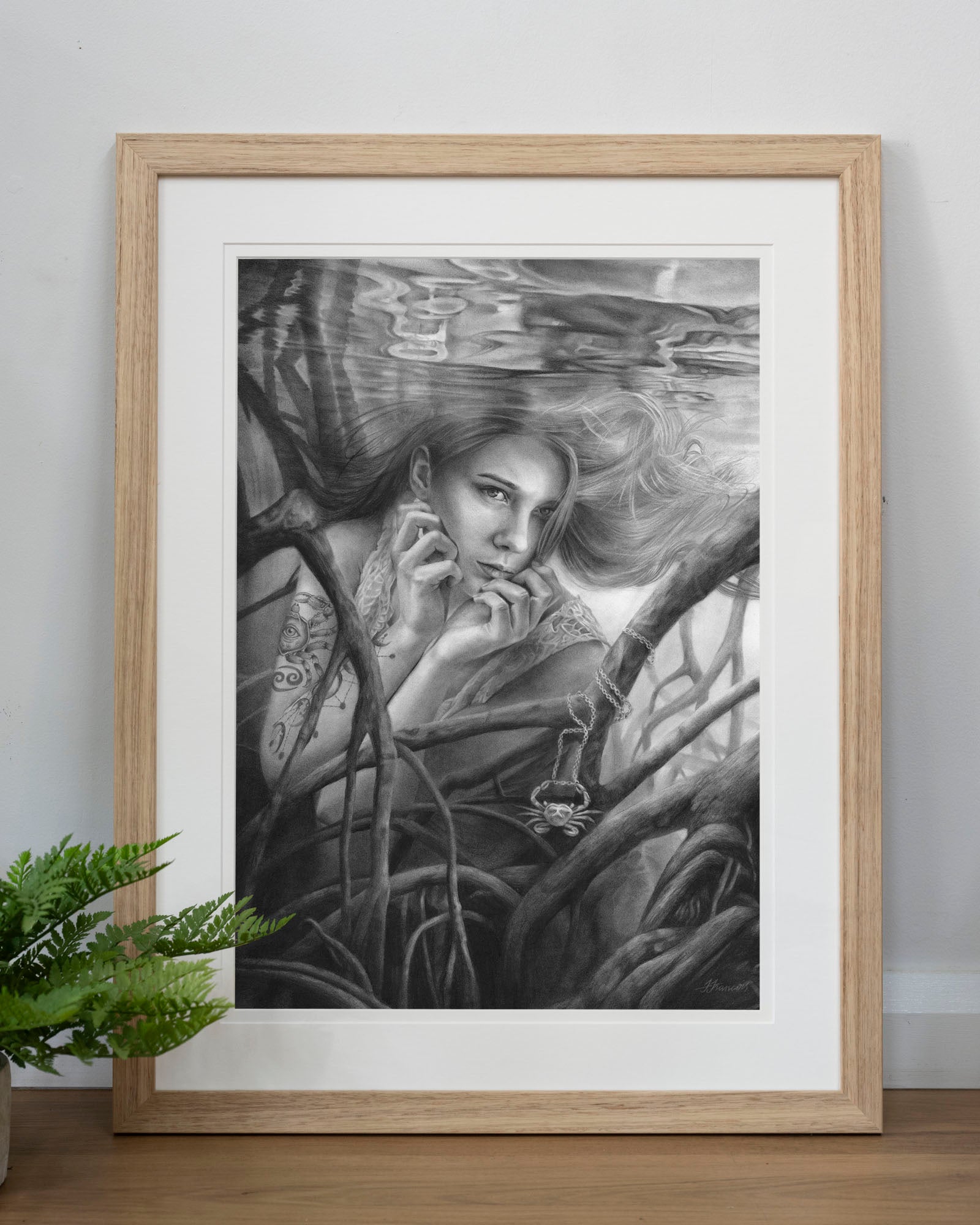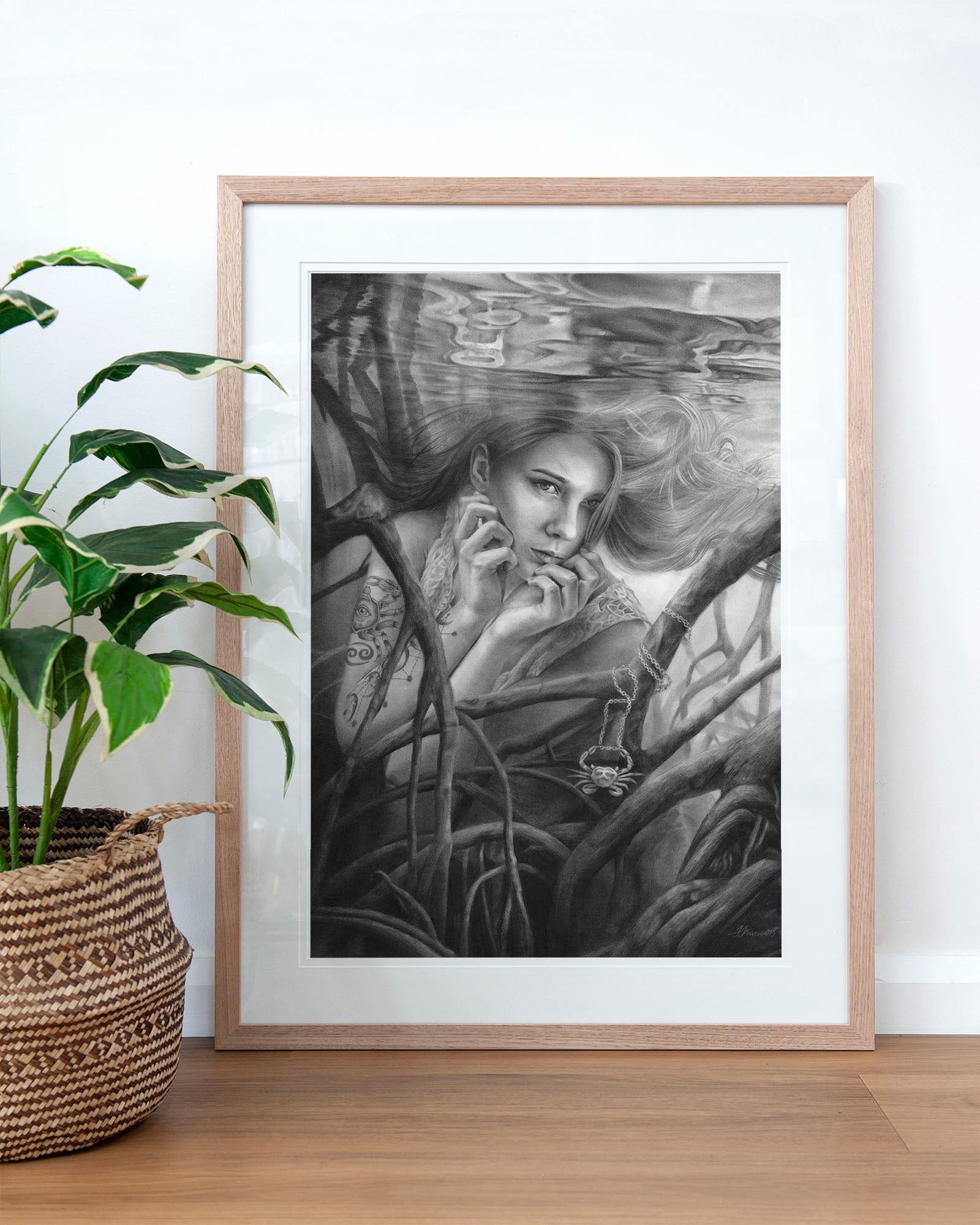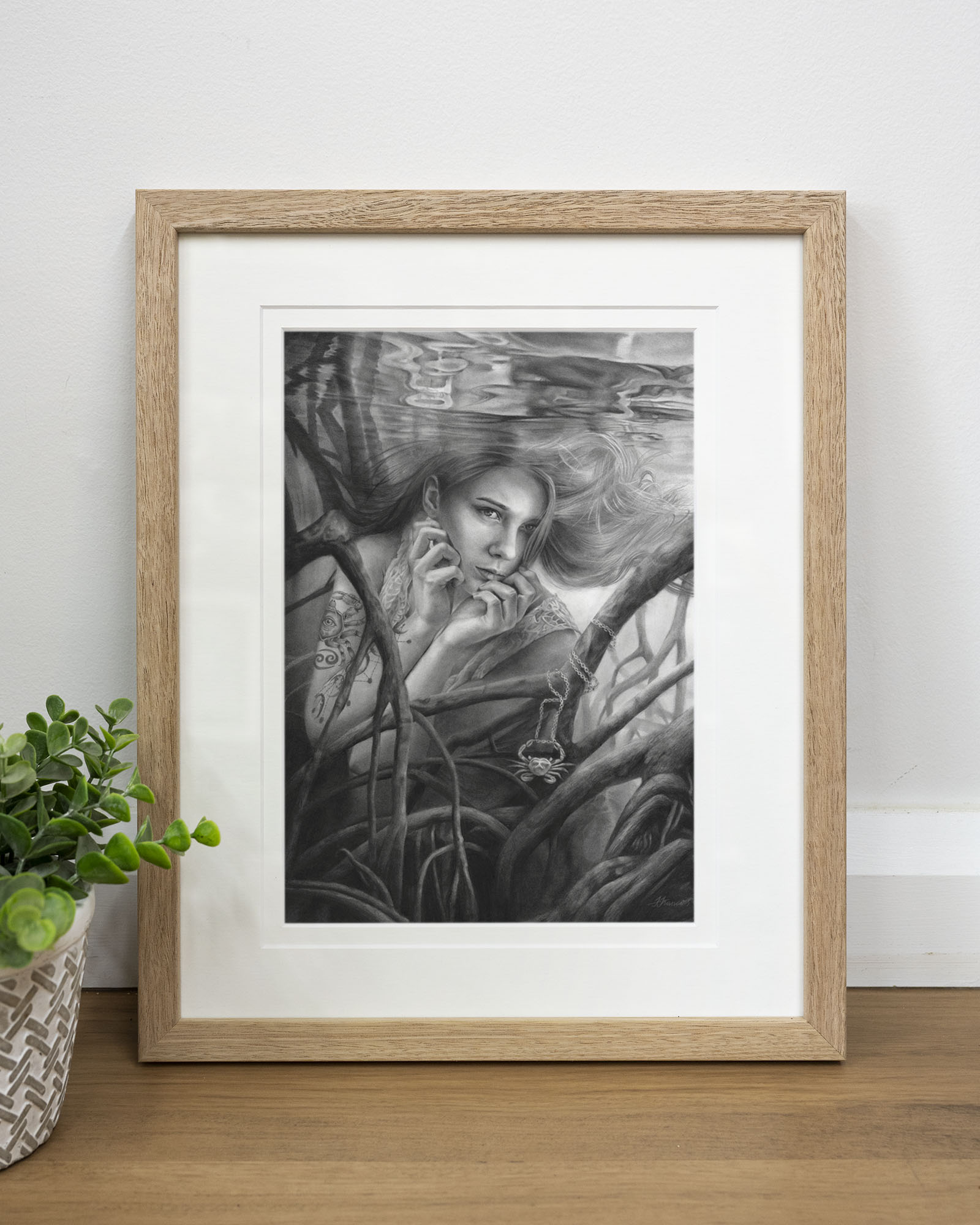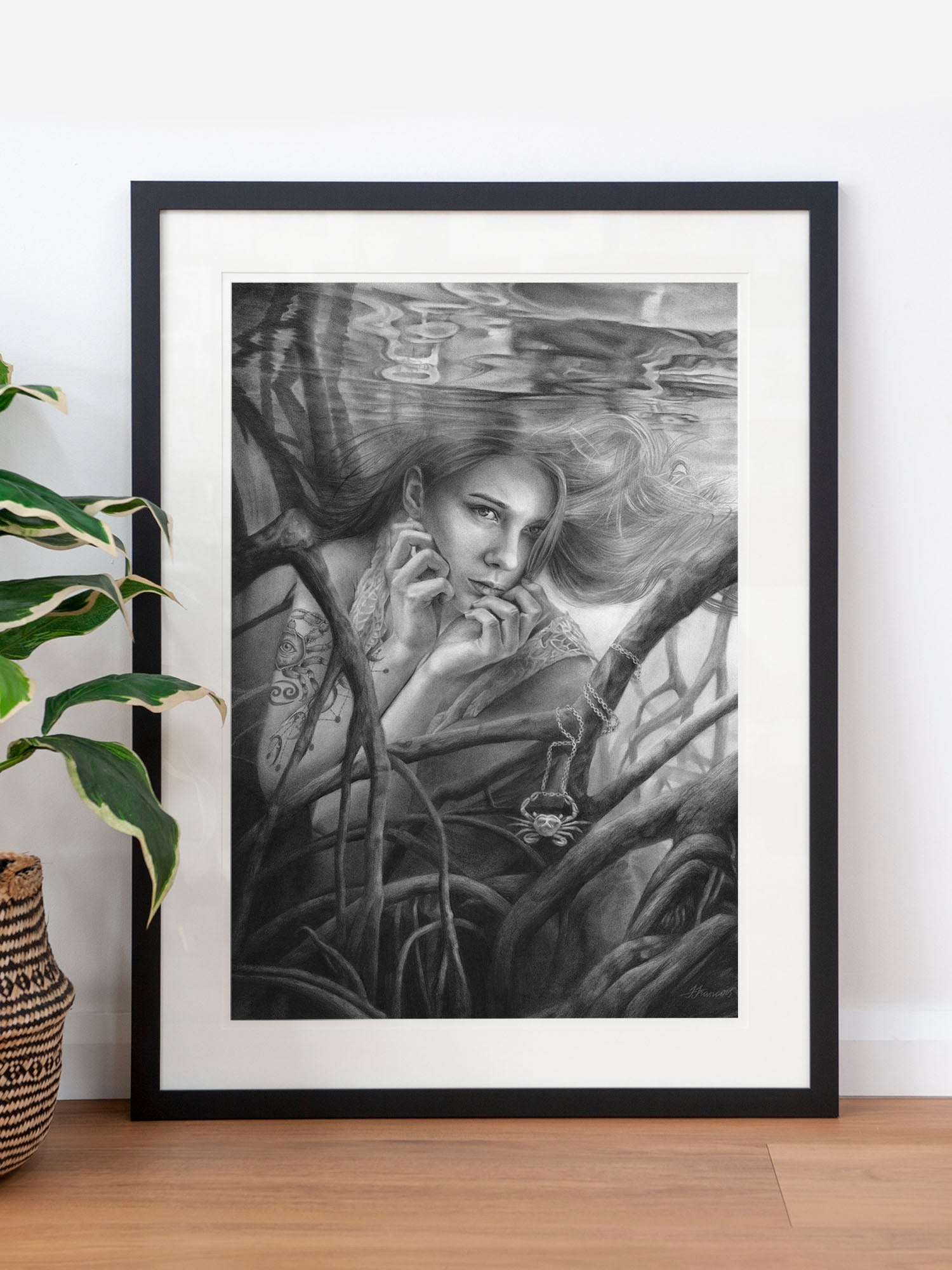 Archival print on cotton art paper. Charcoal drawing of a woman representing Cancer in the signs of the Zodiac.