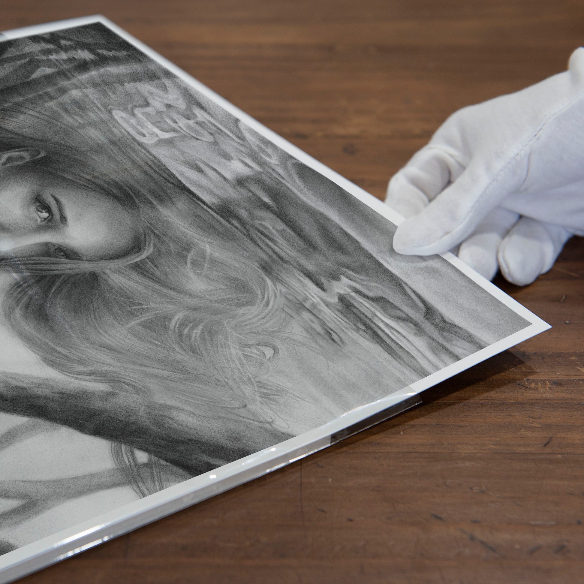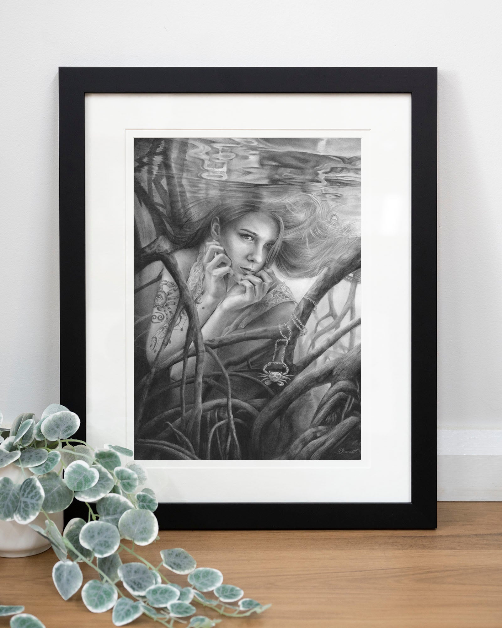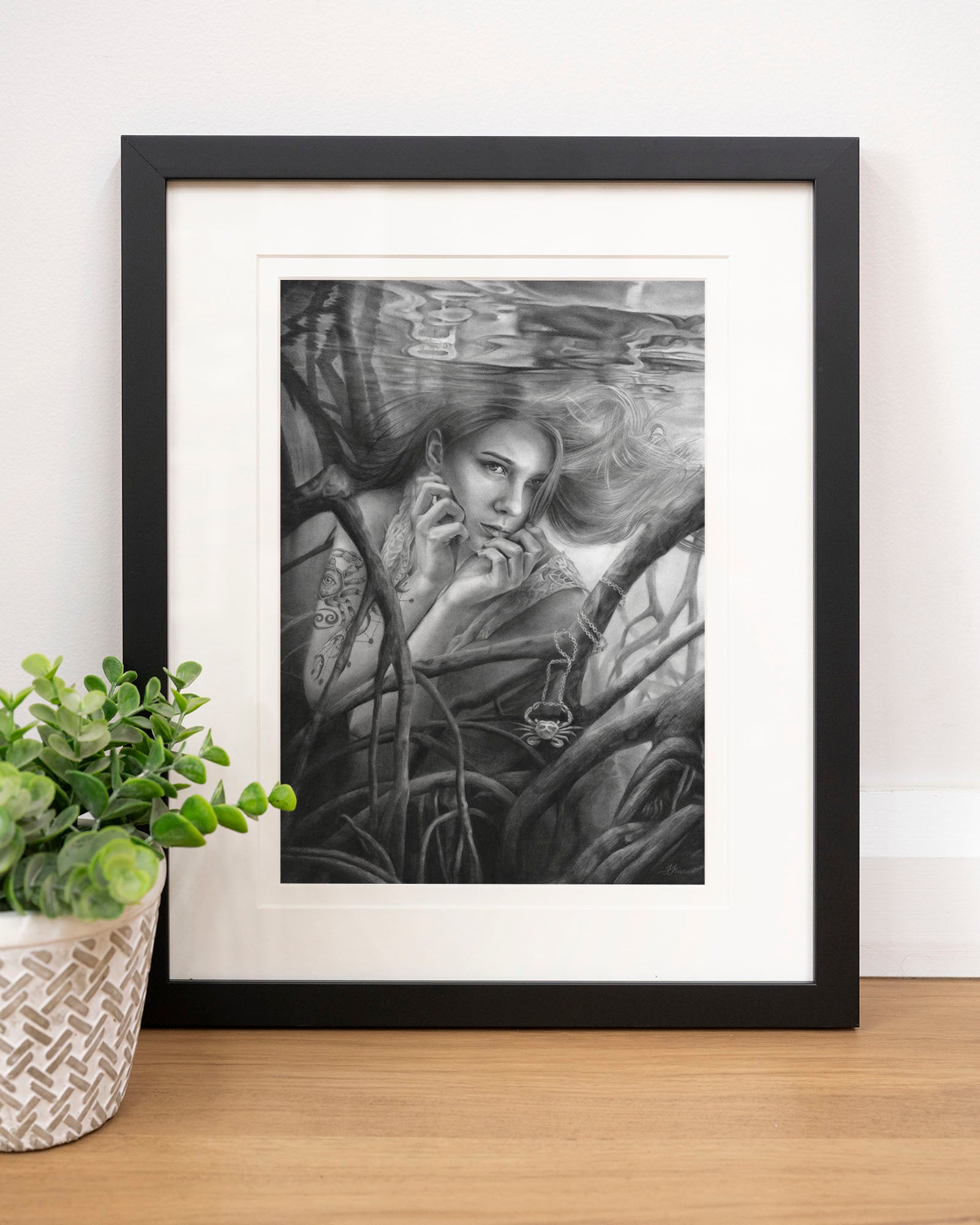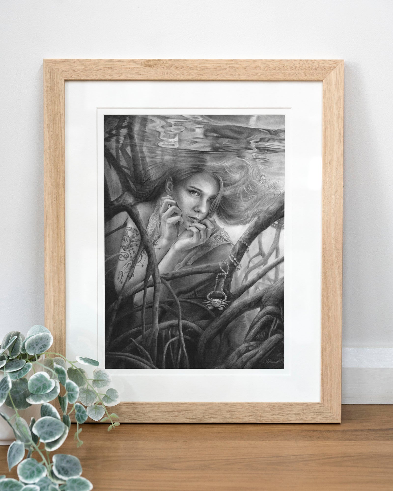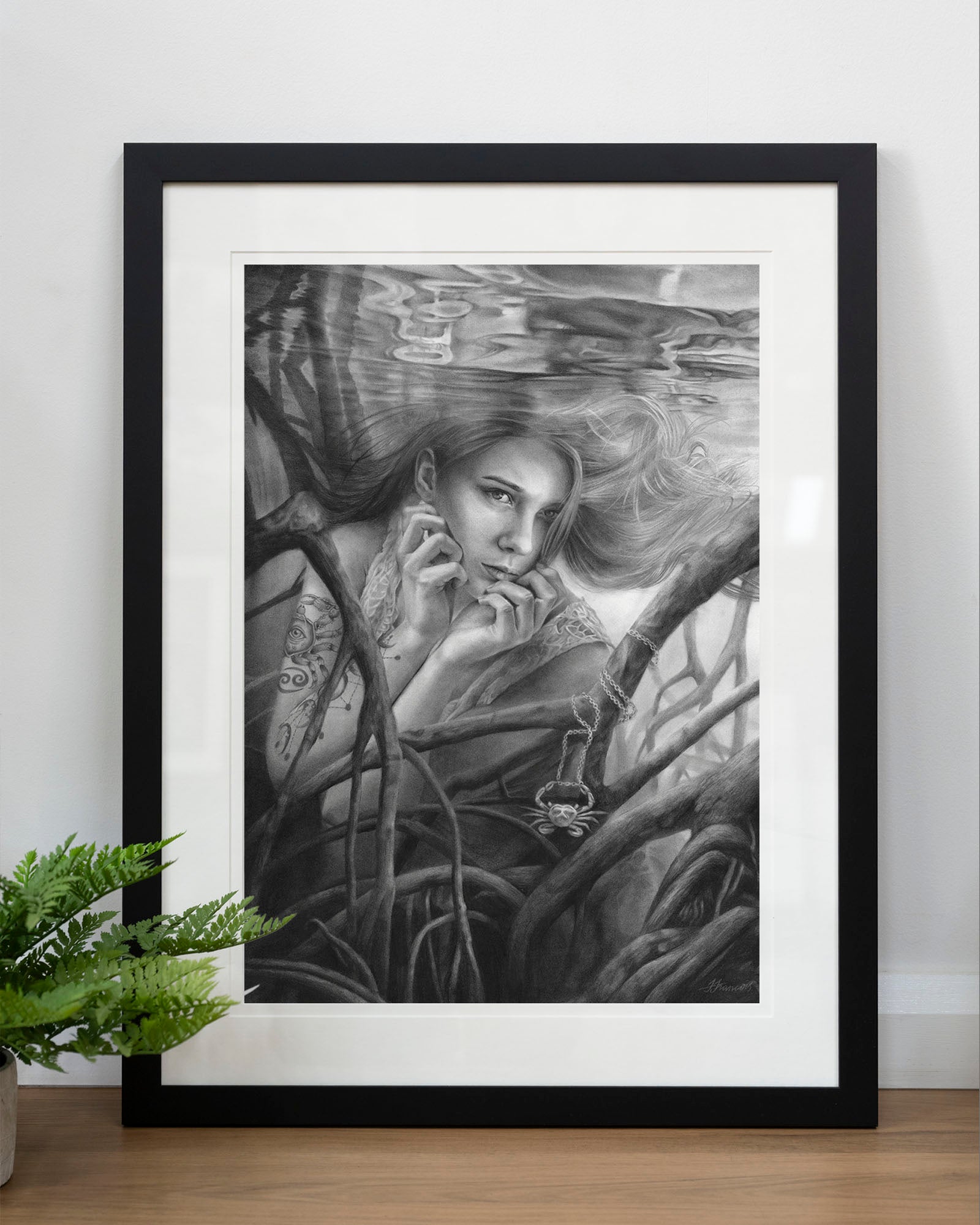 Archival print on cotton art paper. Charcoal drawing of a woman representing Cancer in the signs of the Zodiac.