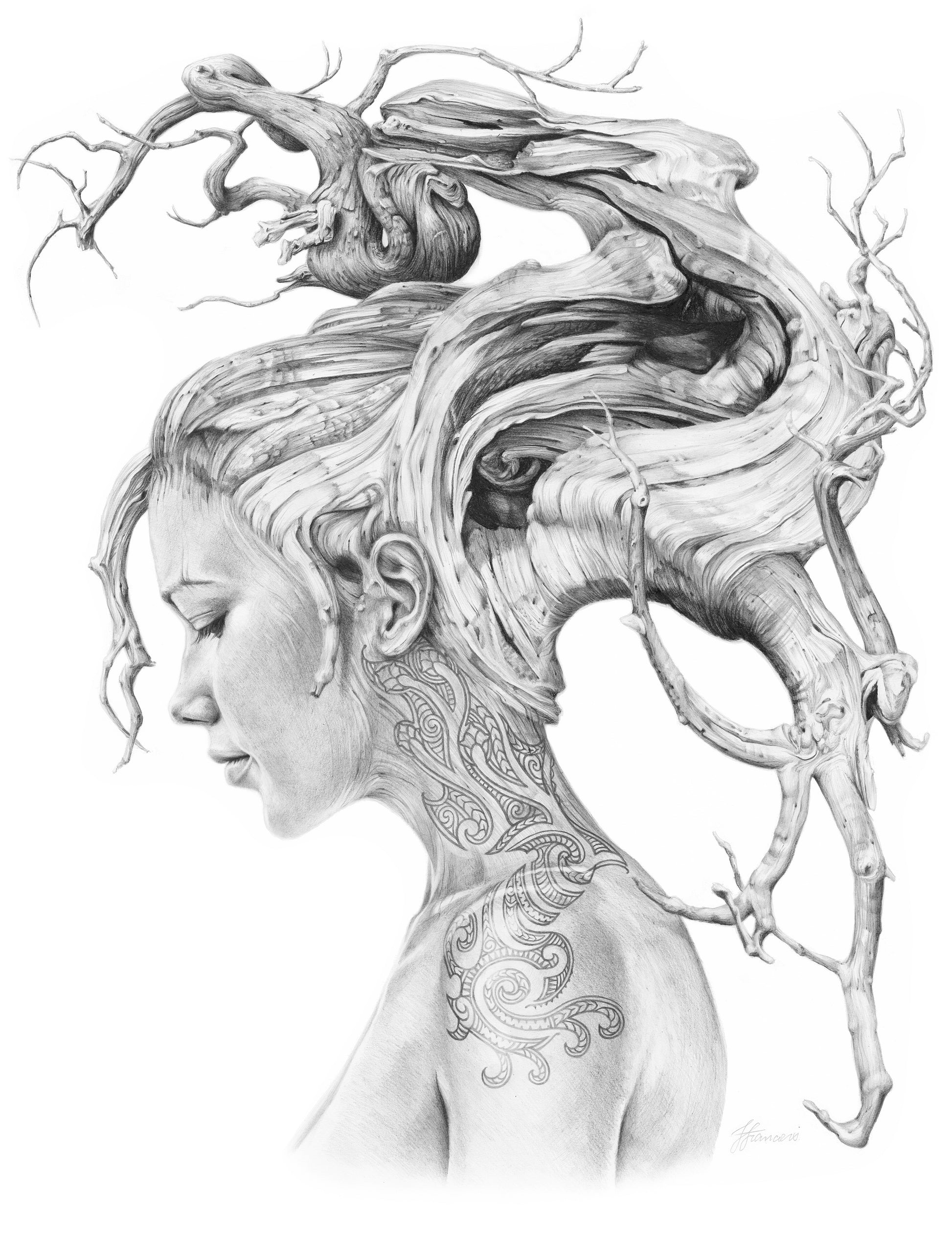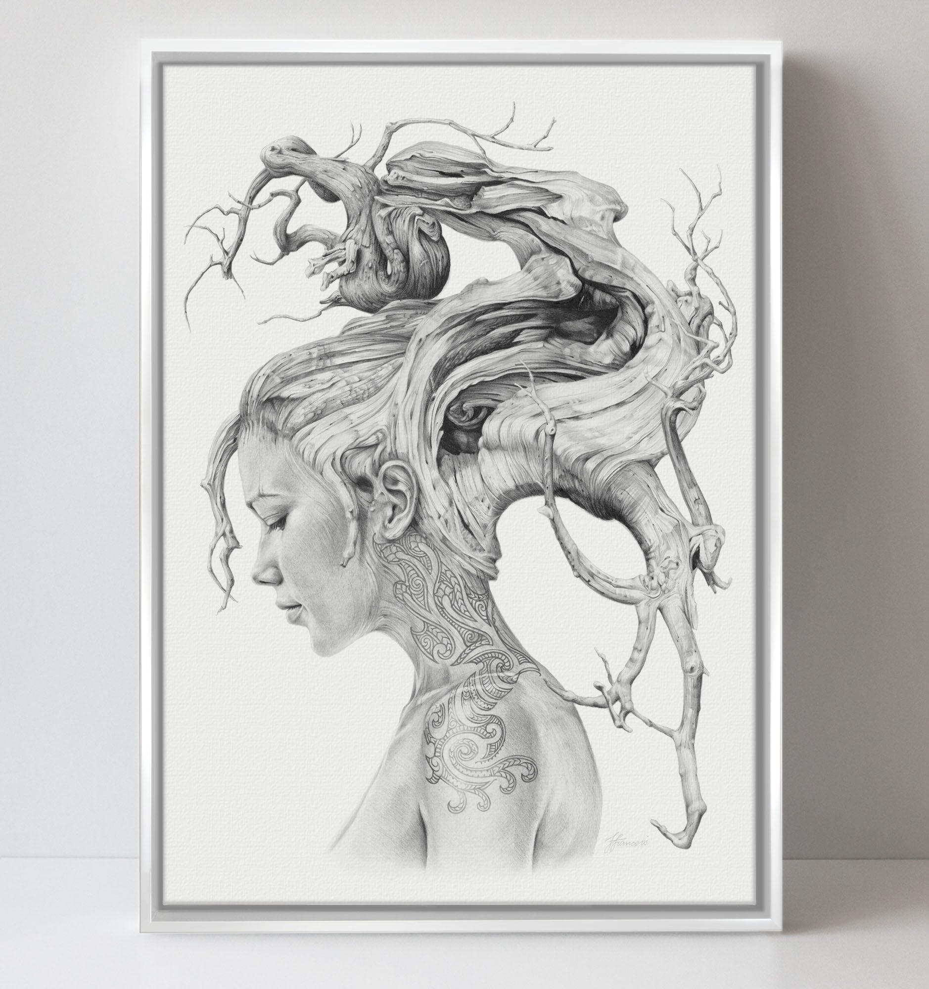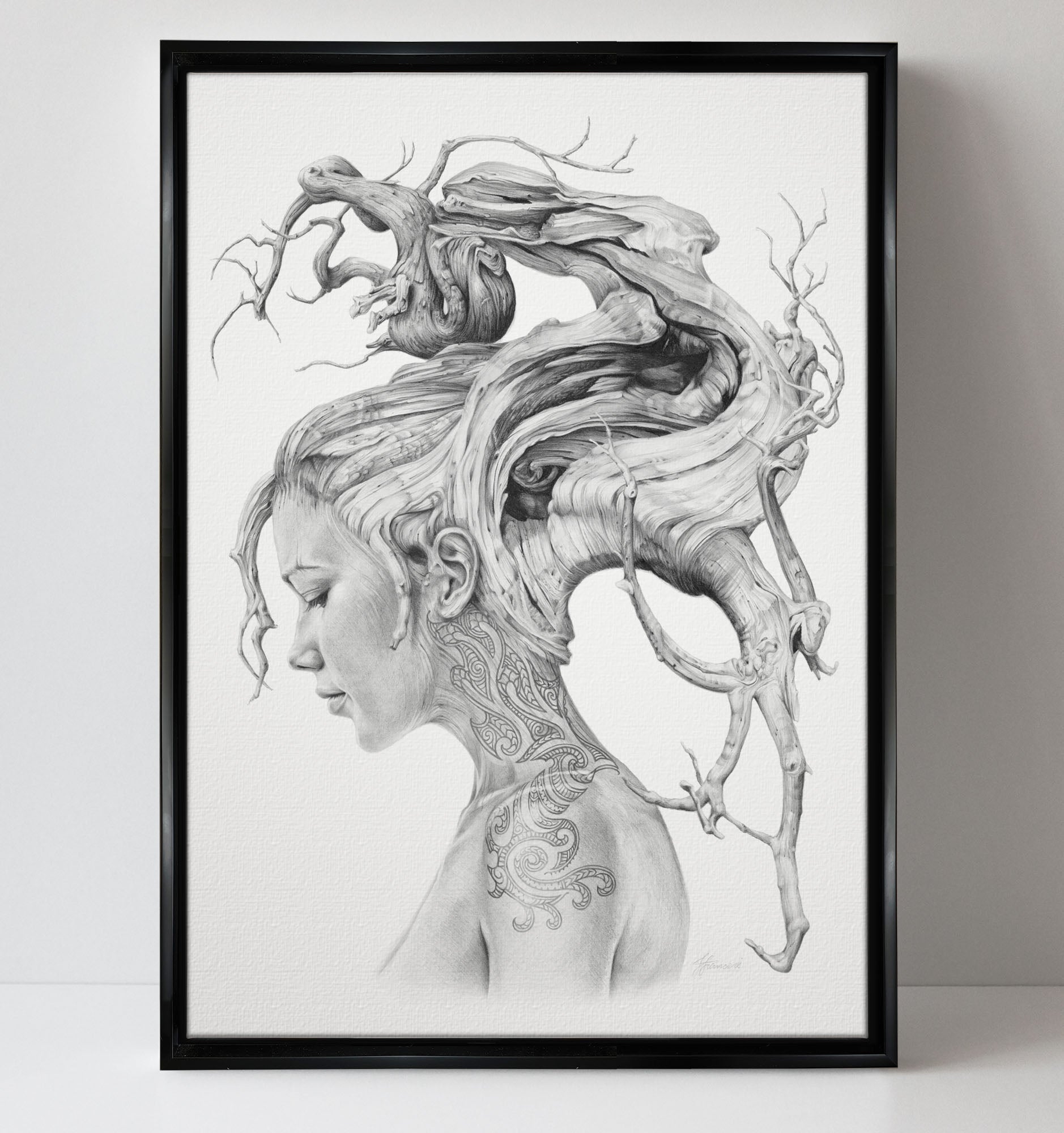 Pencil drawing of a woman in a peaceful meditative pose with twisted driftwood for hair.