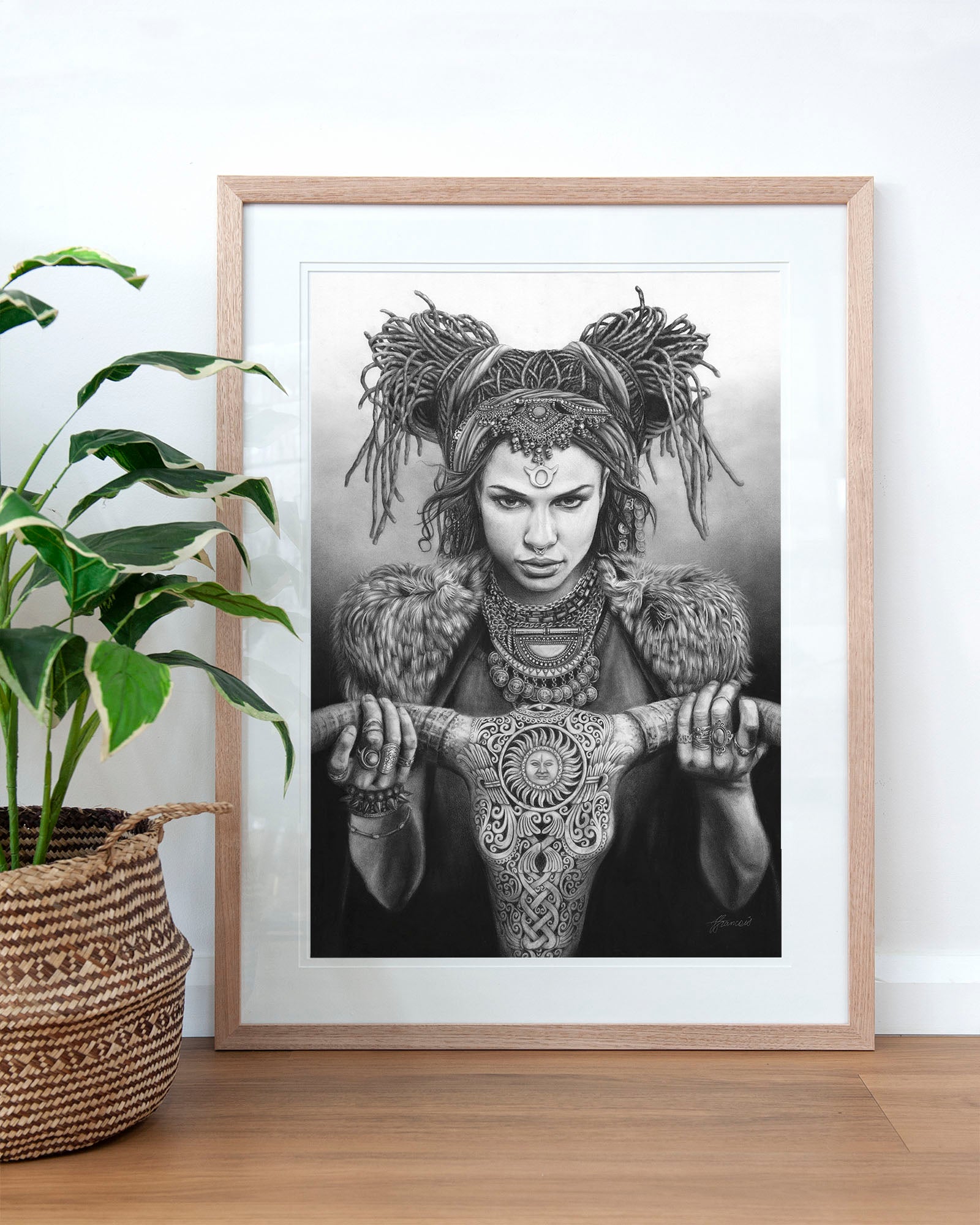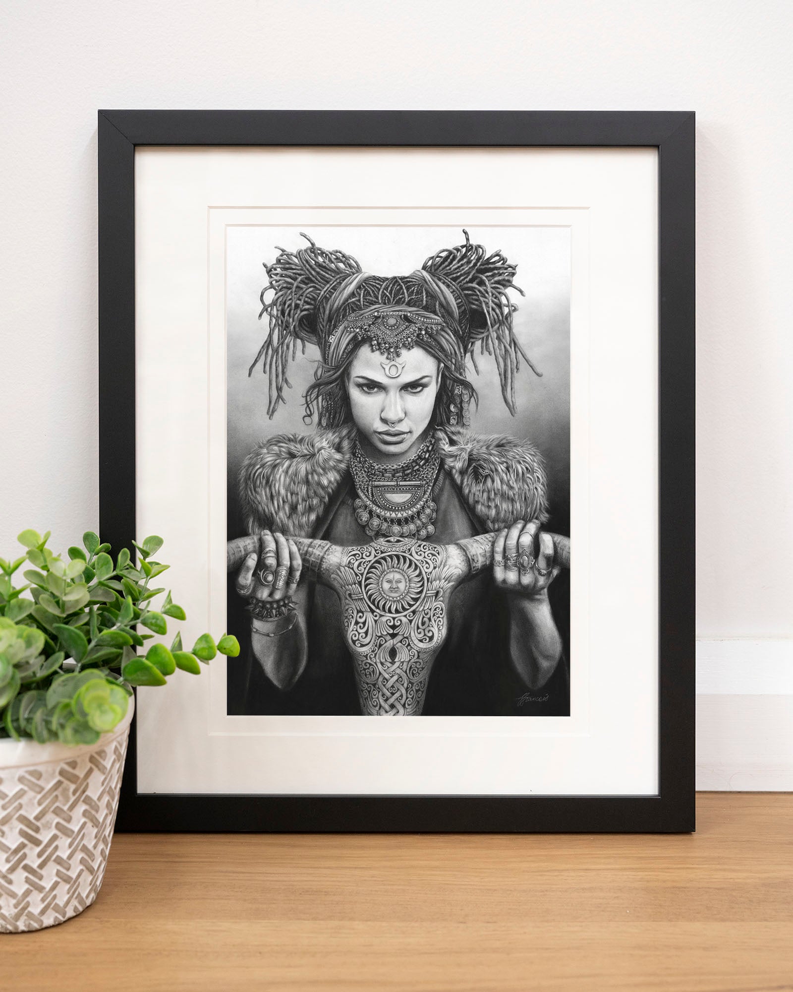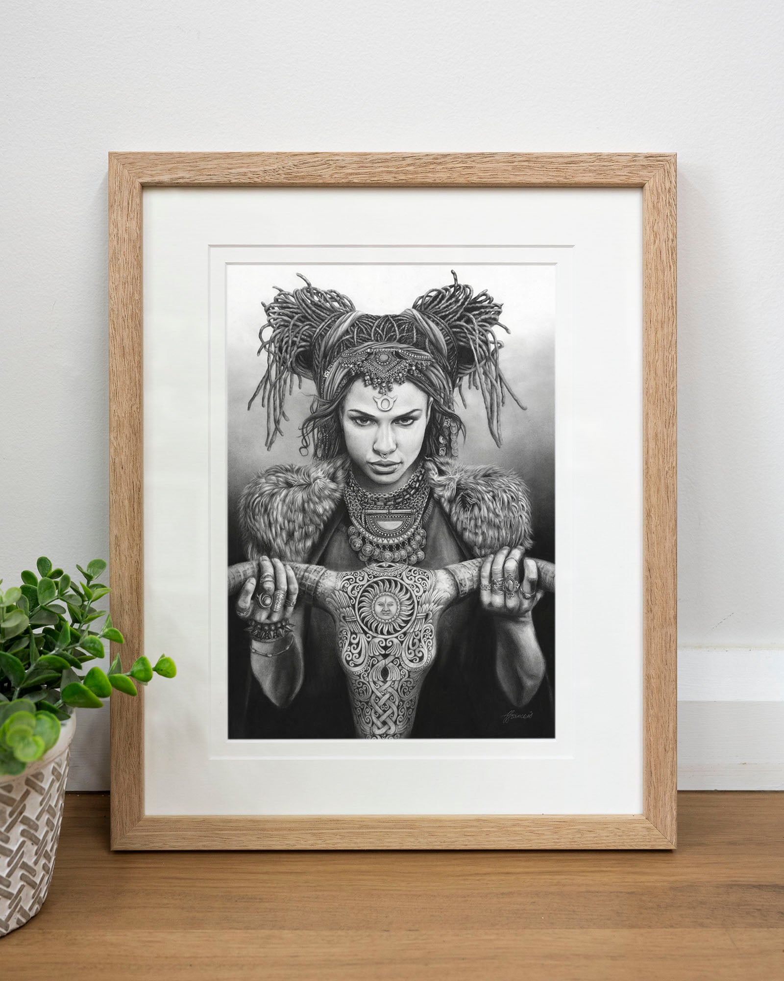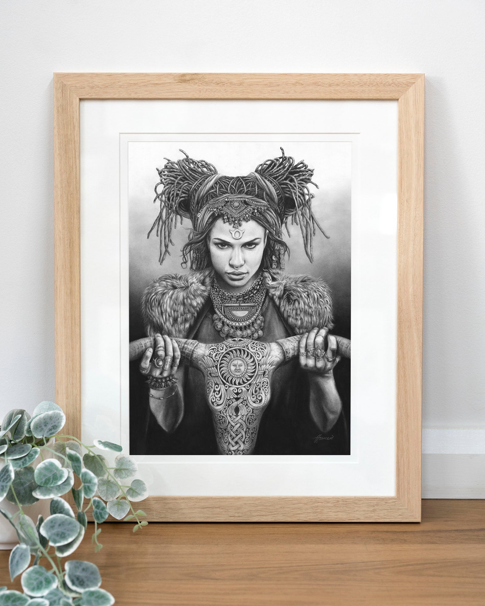 Archival print on cotton art paper. Charcoal and pencil drawing of a woman representing Taurus in the signs of the Zodiac.