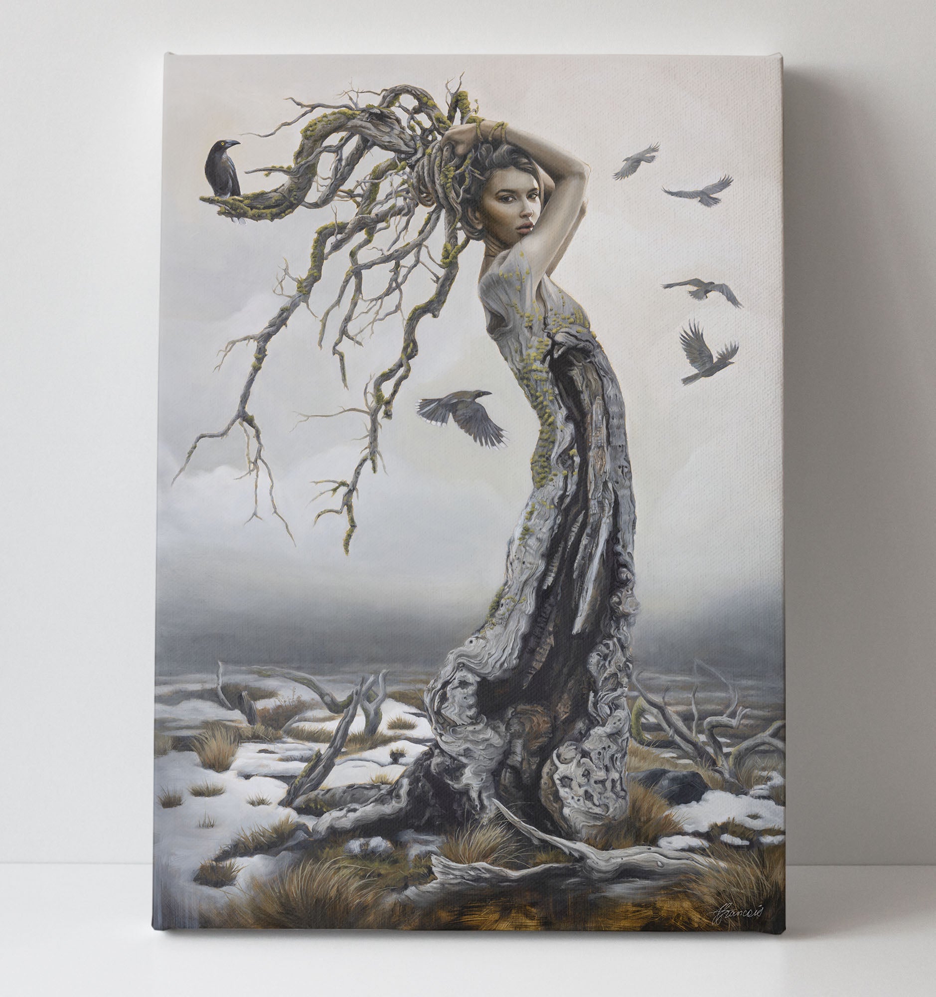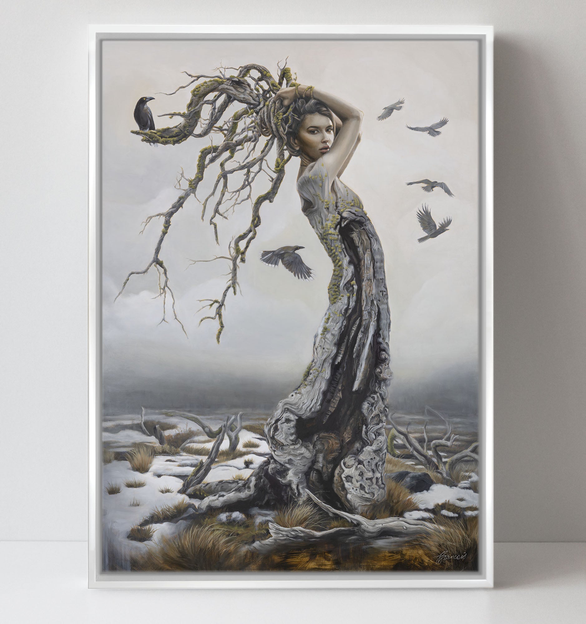Oil painting of an endangered tree, Miena Cider Gum, personified as a beautiful woman surrounded by Currawongs