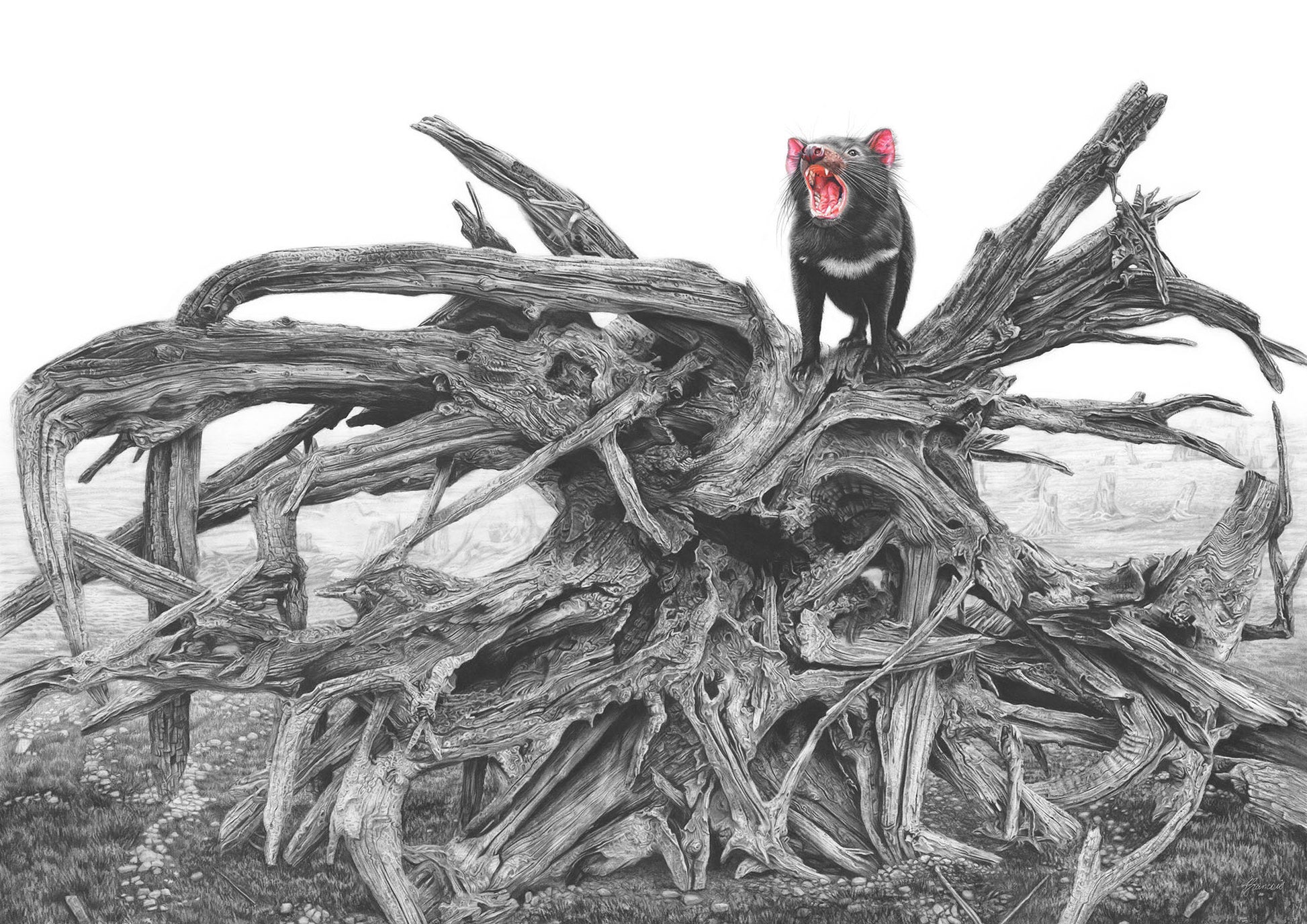 Glossy greeting card featuring 'Devil's Advocate' charcoal and colour pencil drawing. Folded card is 11.5 x 18cm, blank inside and comes with envelope sealed in a clear cello bag.