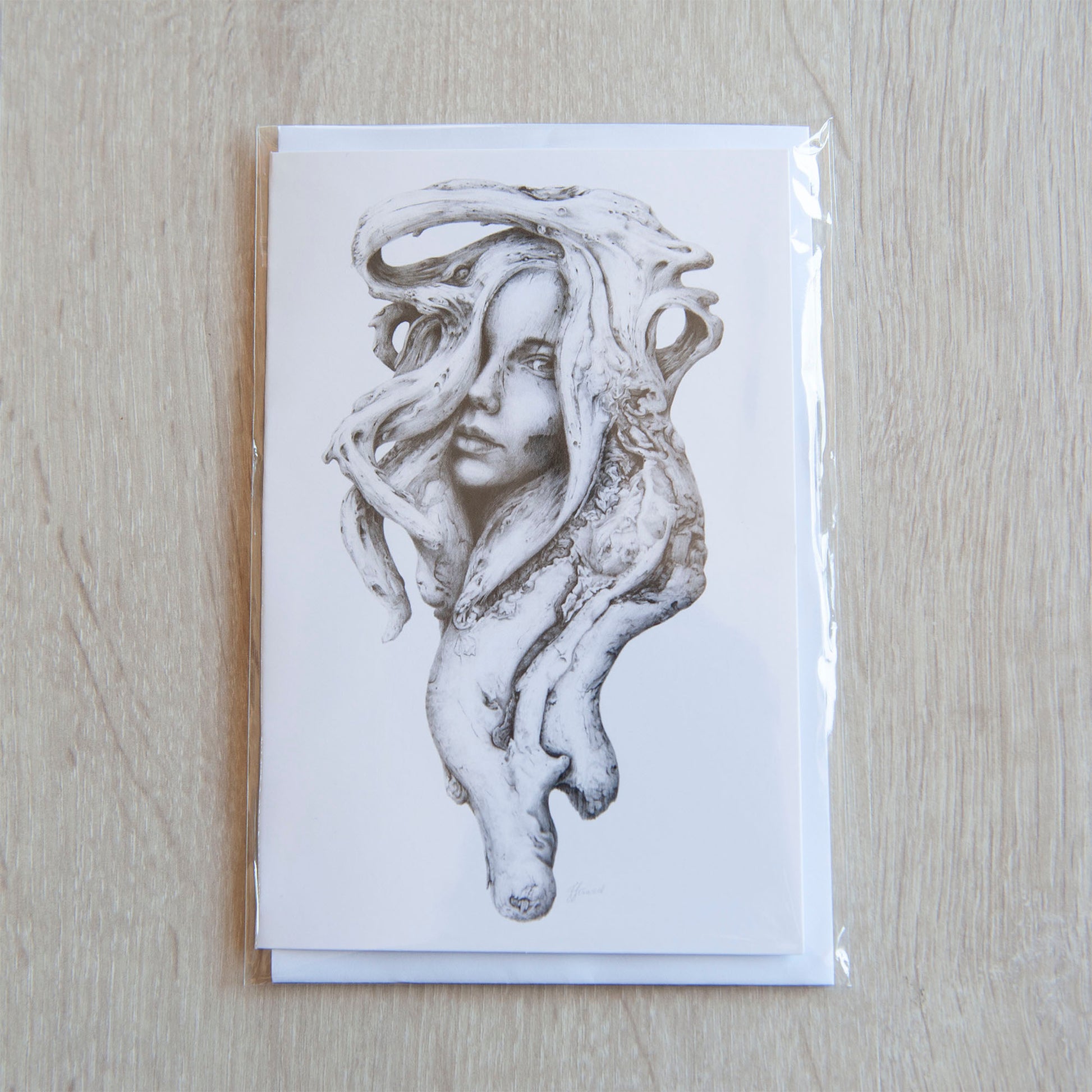 Glossy greeting card featuring 'Driftwood Souls 1' graphite pencil drawing. Folded card is 11.5 x 18cm, blank inside and comes with envelope sealed in a clear cello bag.