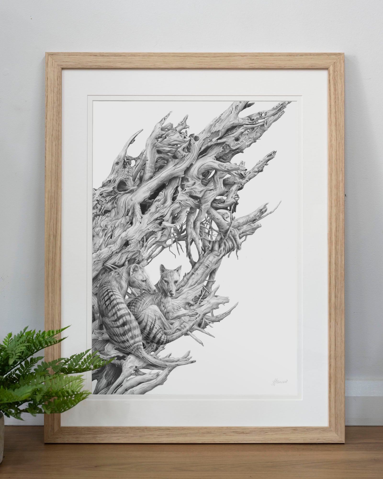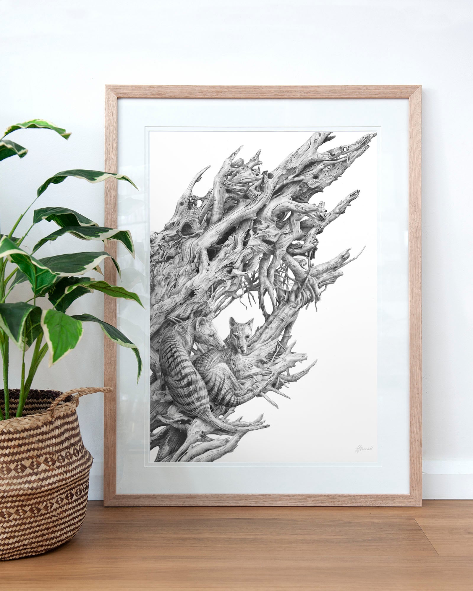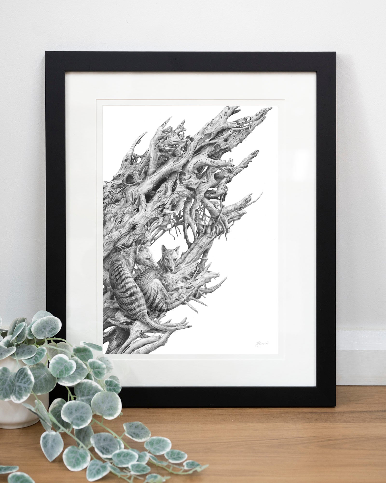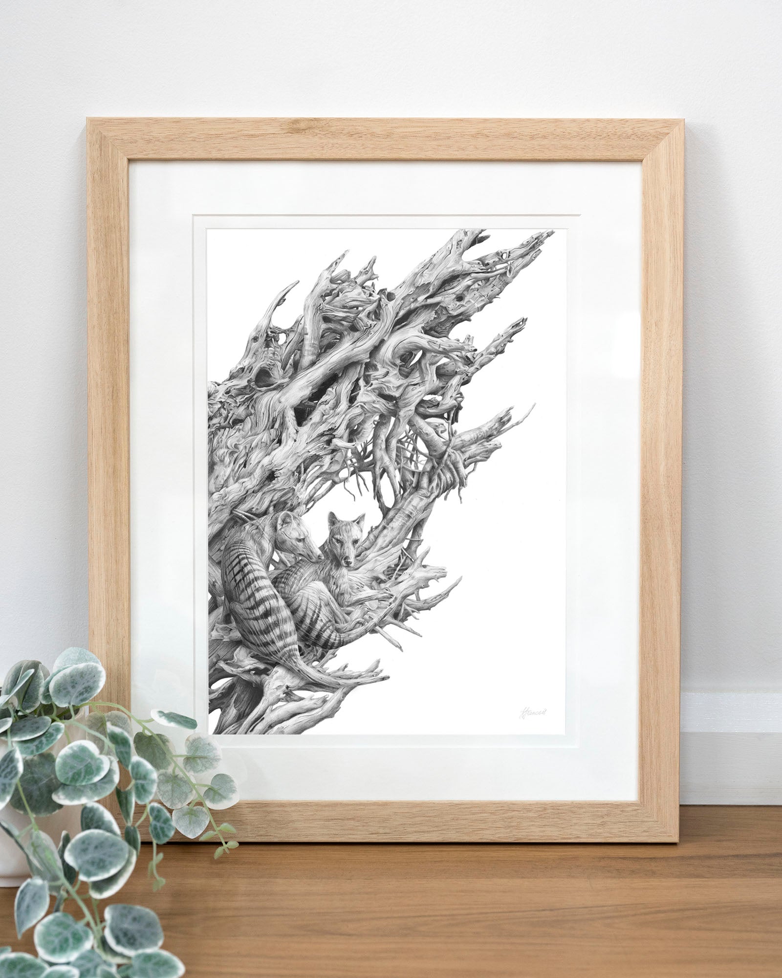 Archival print on cotton art paper. Detailed pencil and charcoal drawing of a driftwood hull with the extinct Tasmanian Tiger hidden within the gnarled surface.