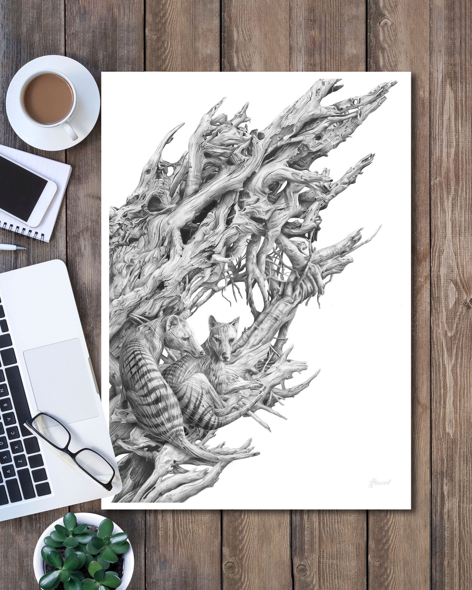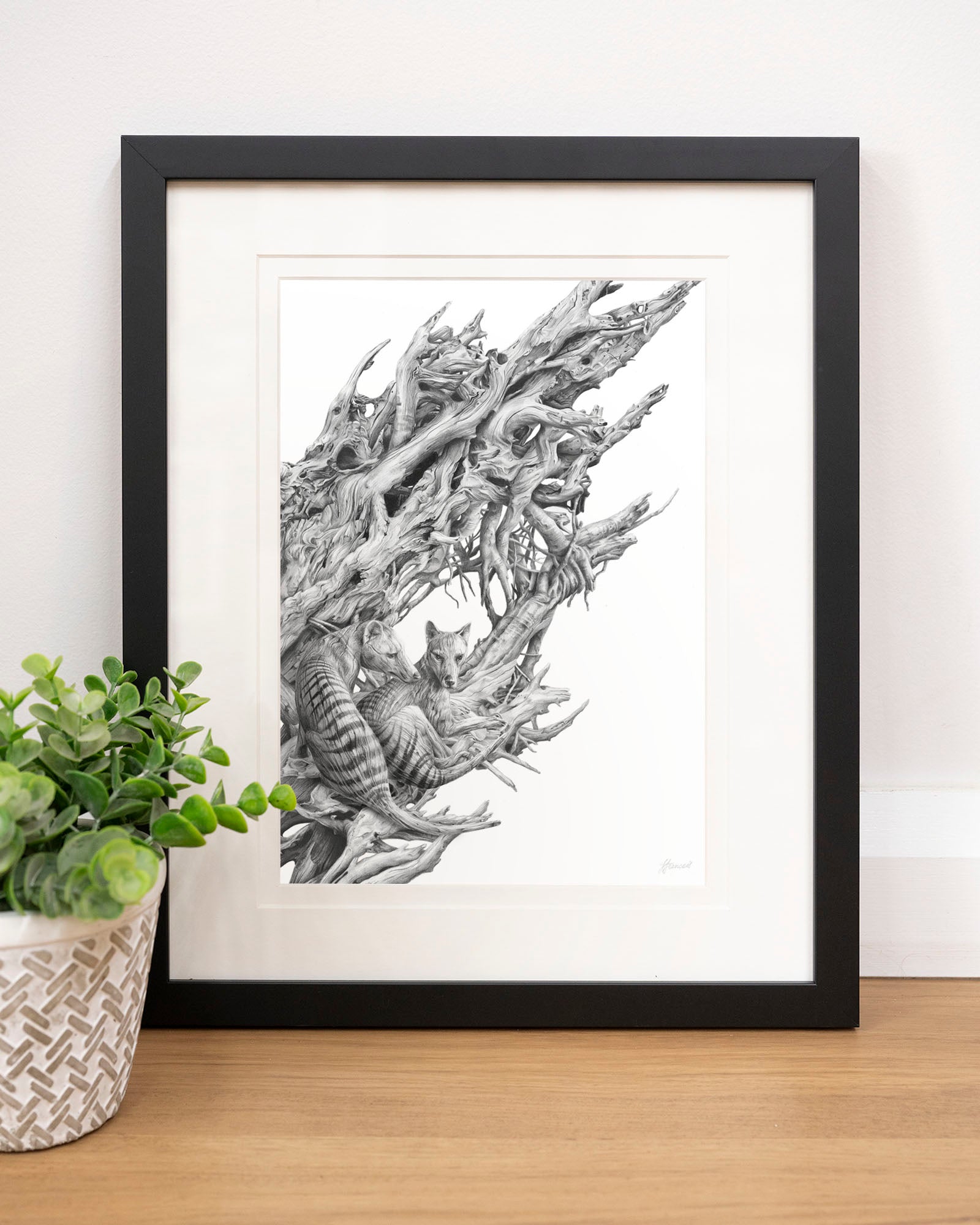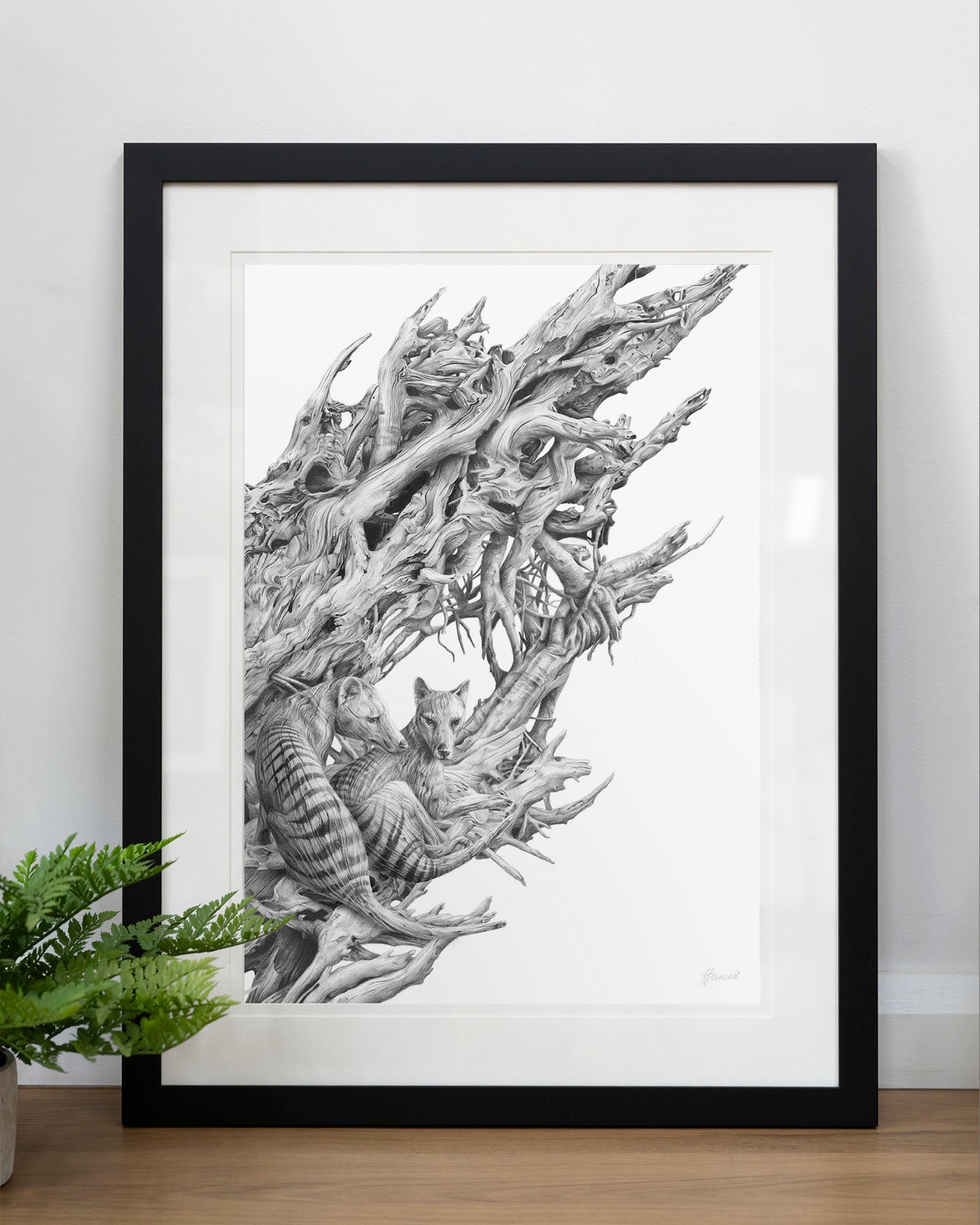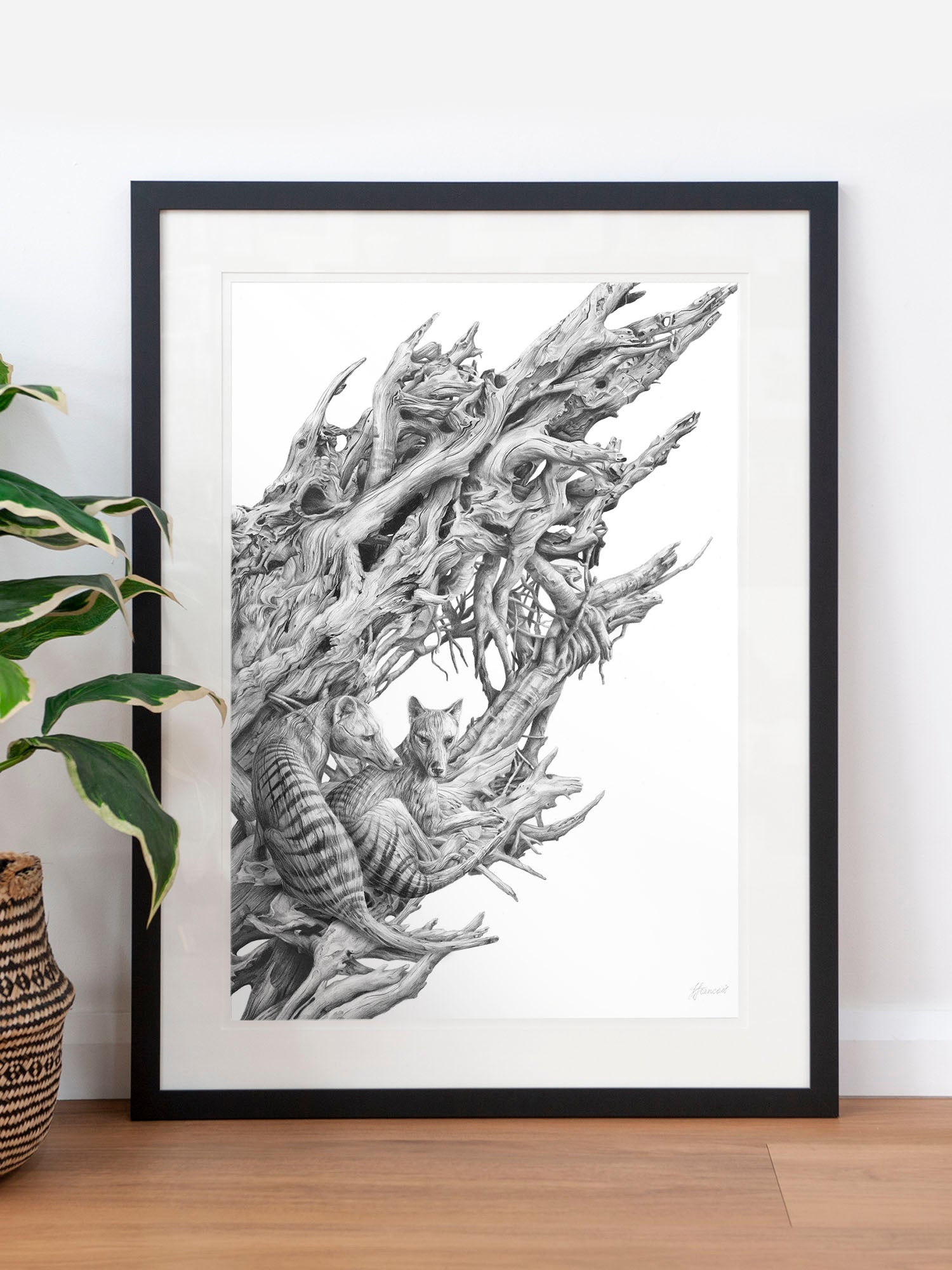 Archival print on cotton art paper. Detailed pencil and charcoal drawing of a driftwood hull with the extinct Tasmanian Tiger hidden within the gnarled surface.