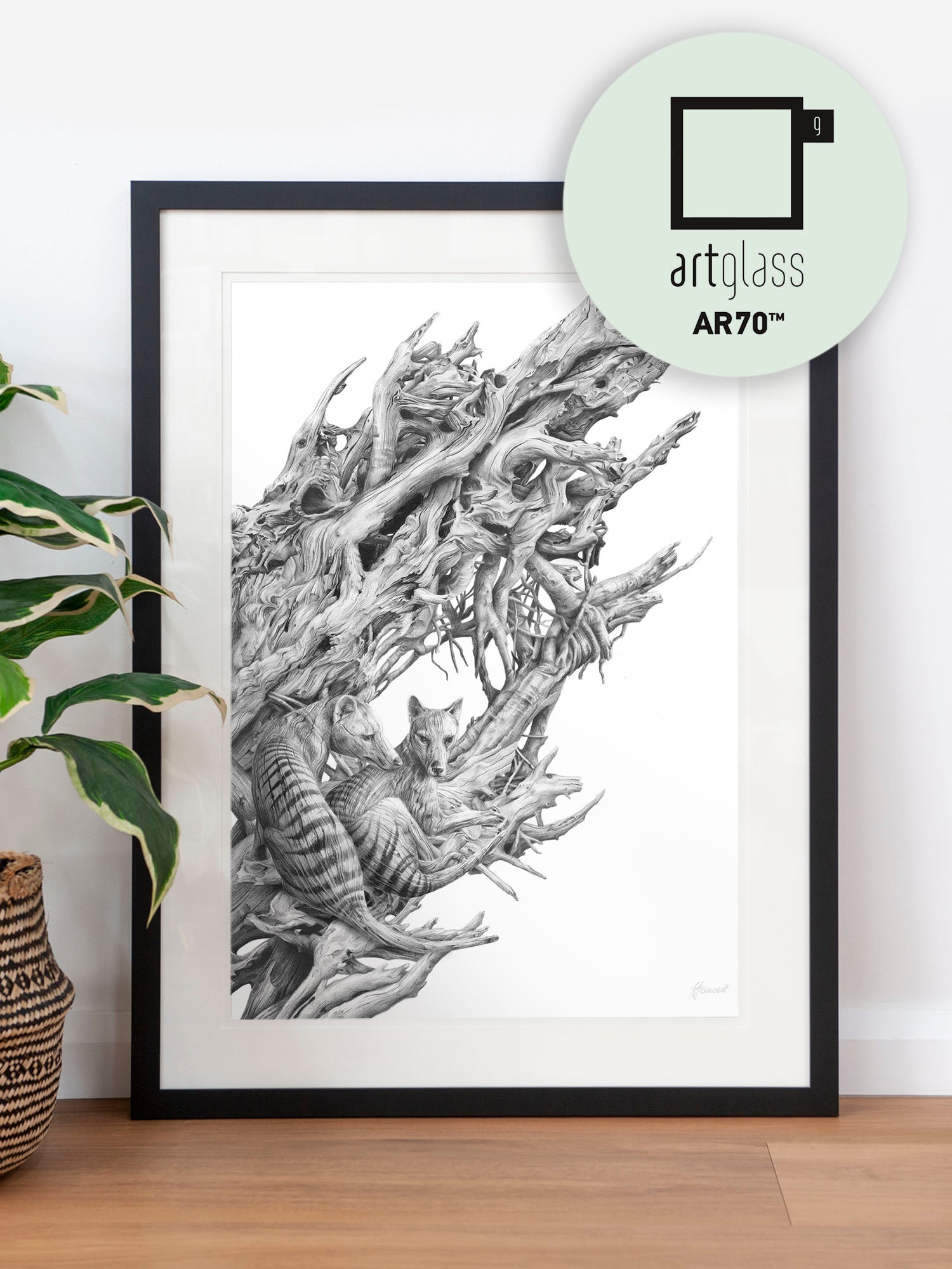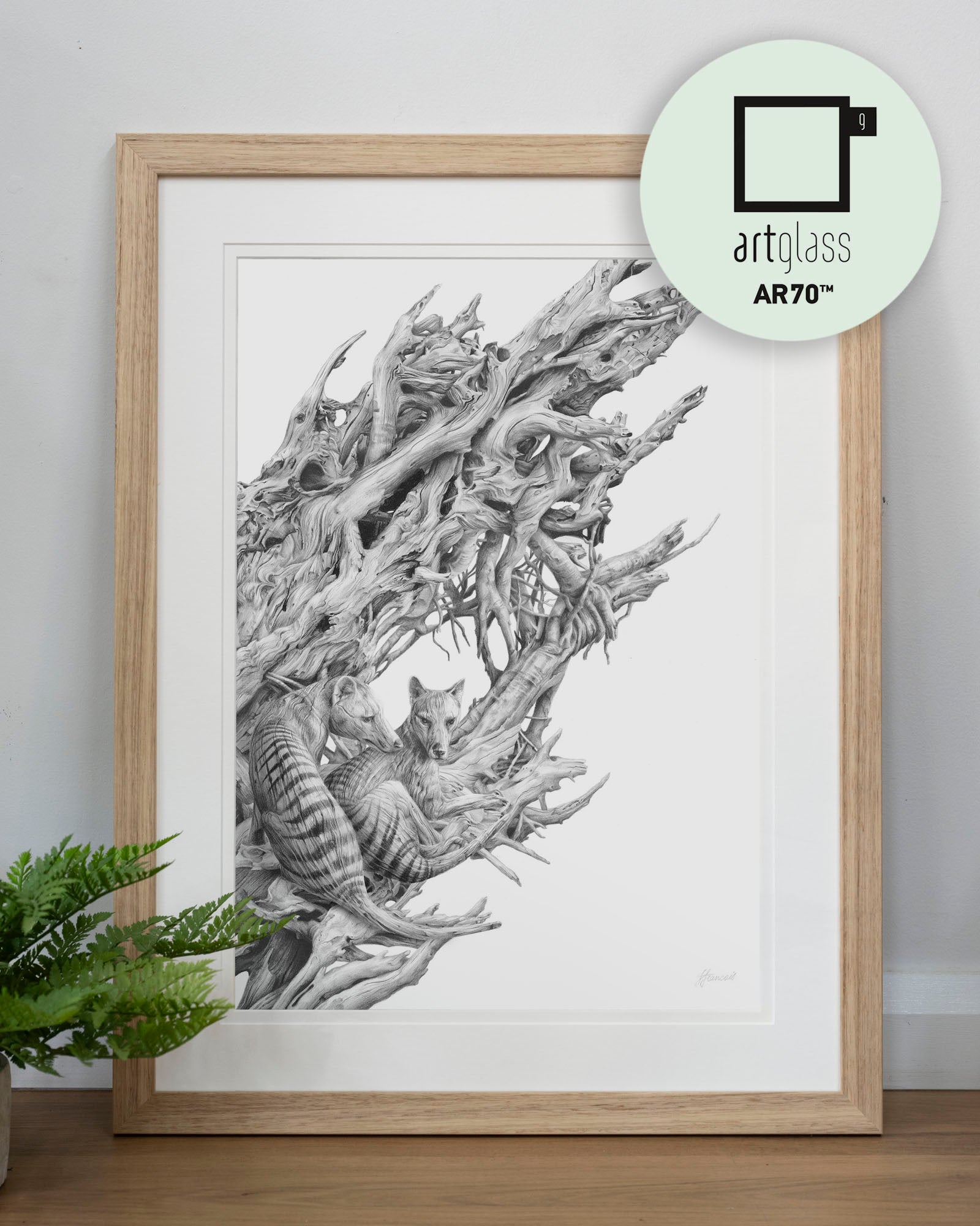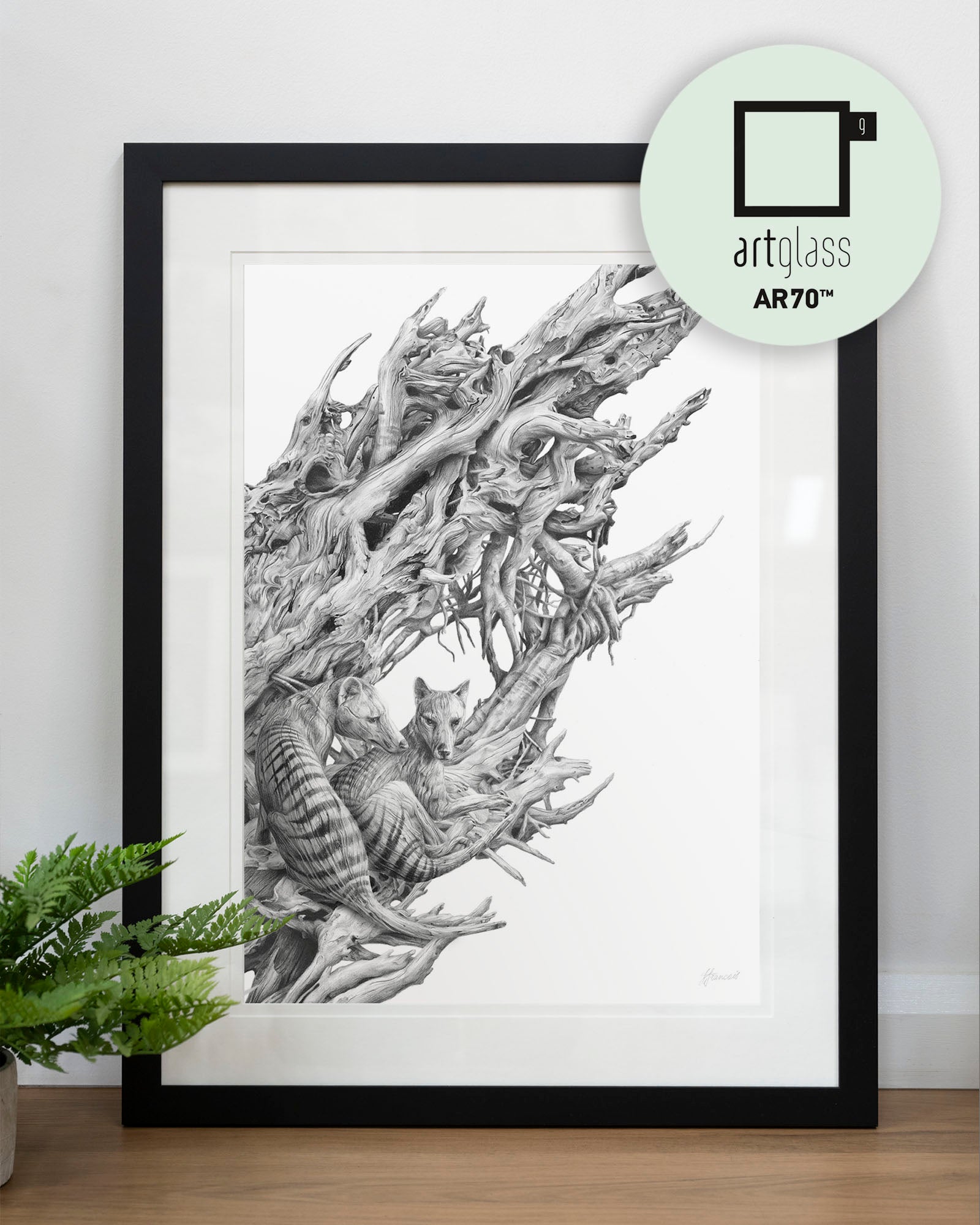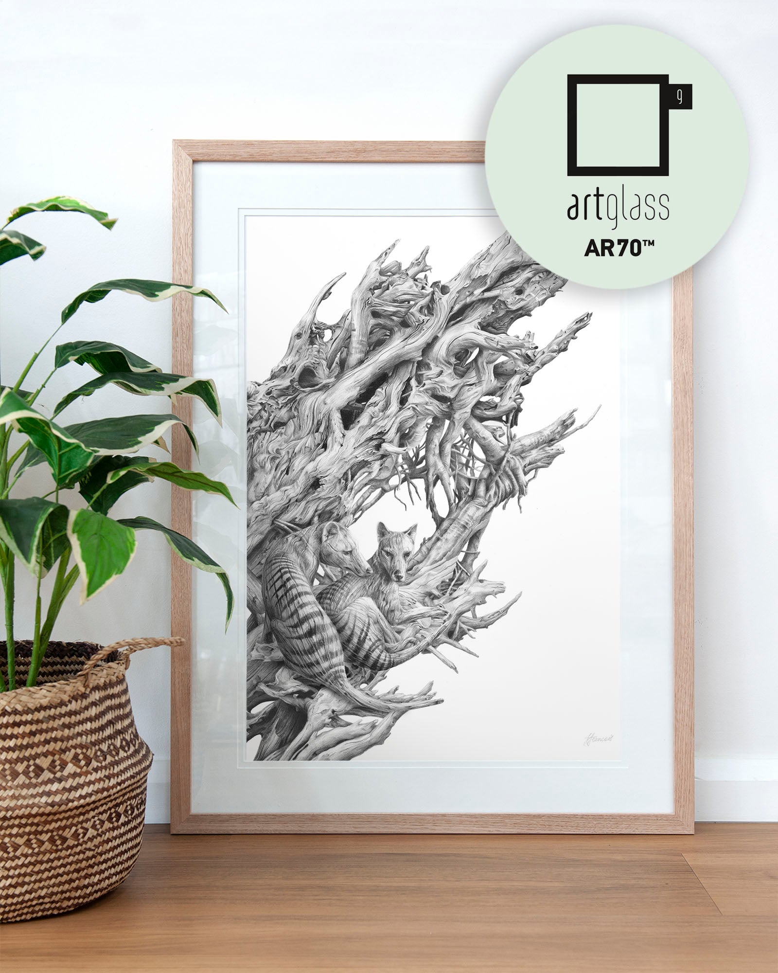 Archival print on cotton art paper. Detailed pencil and charcoal drawing of a driftwood hull with the extinct Tasmanian Tiger hidden within the gnarled surface.