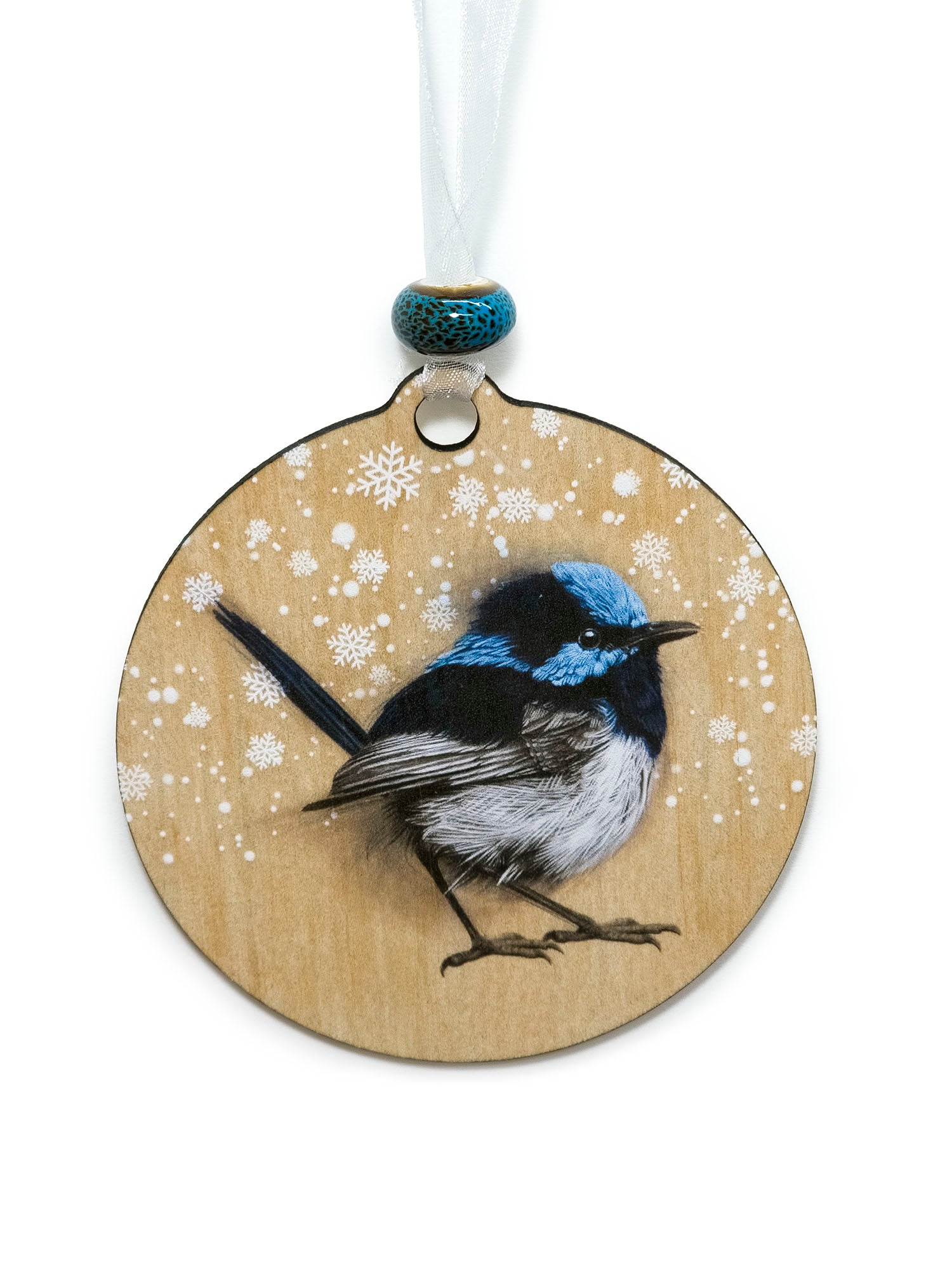 Wooden Christmas ornament featuring a print of the 'Fairy Wren' drawing by Fiona Francois. Decoration includes white chiffon ribbon and ceramic bead.