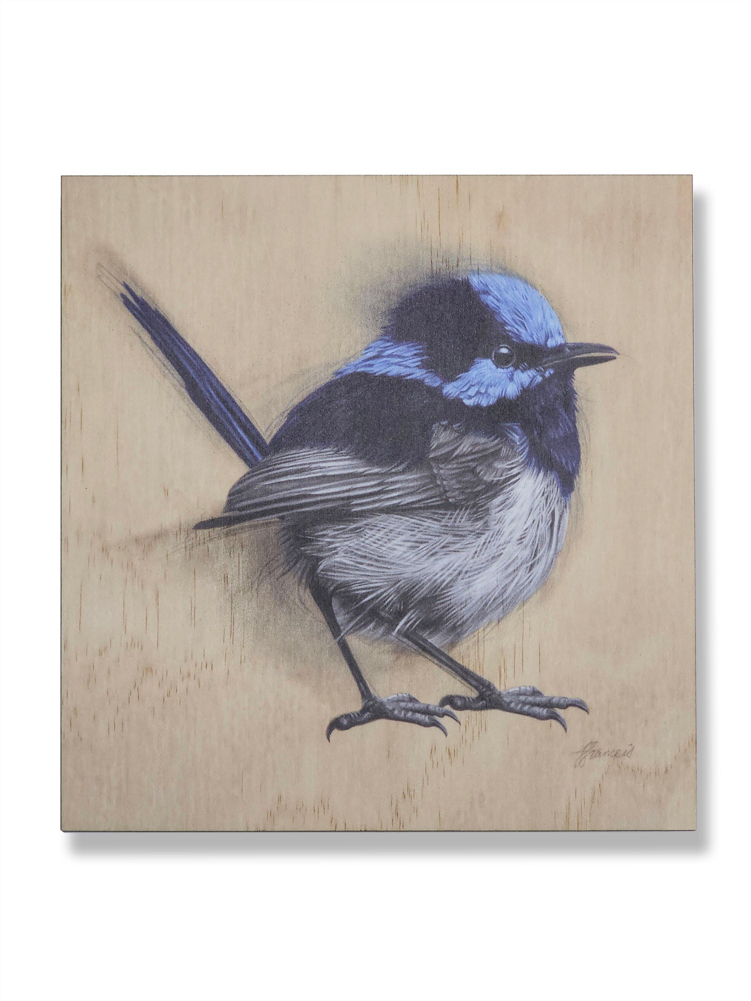 Small wood print featuring 'Fairy Wren' drawing by Fiona Francois.