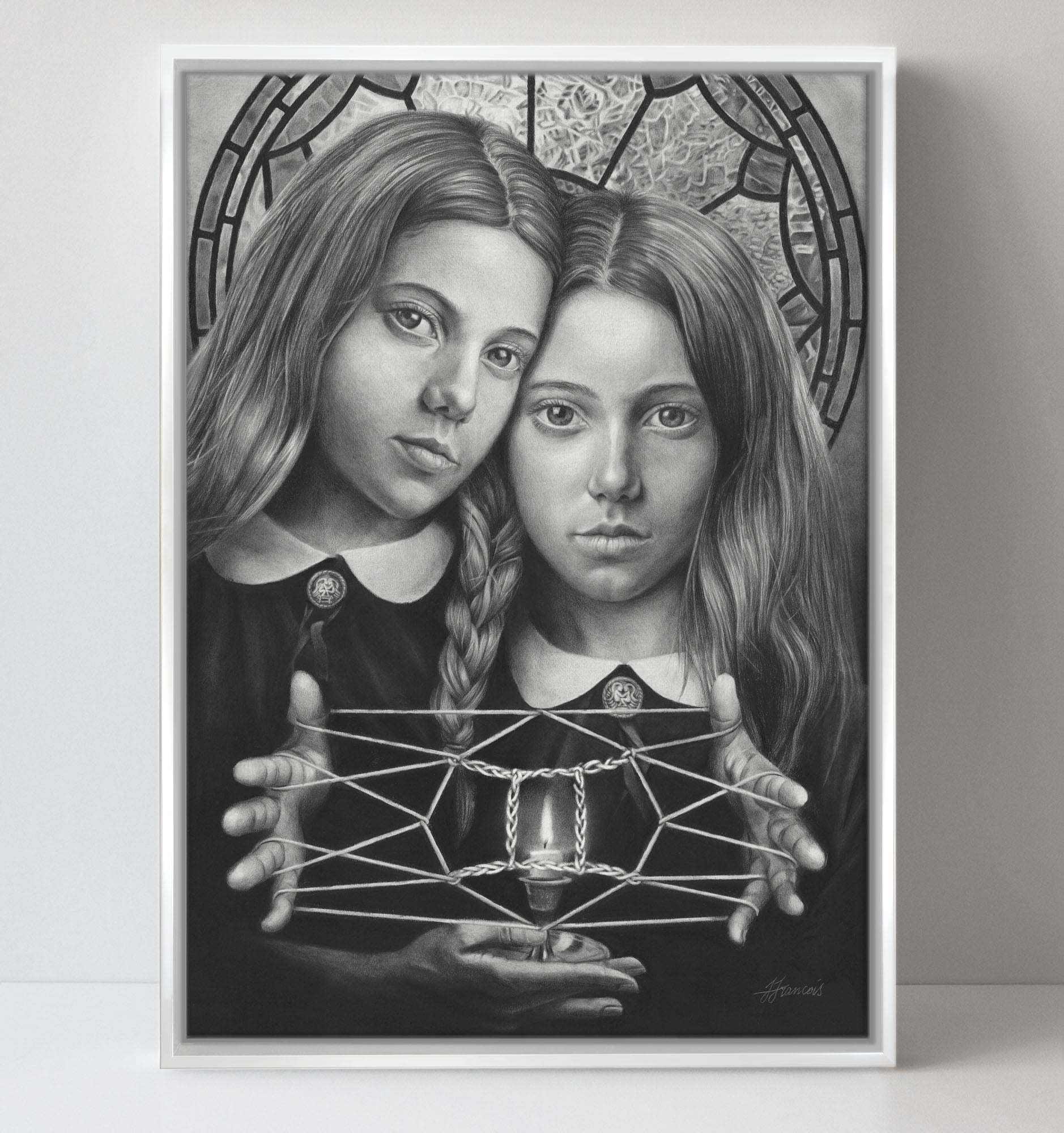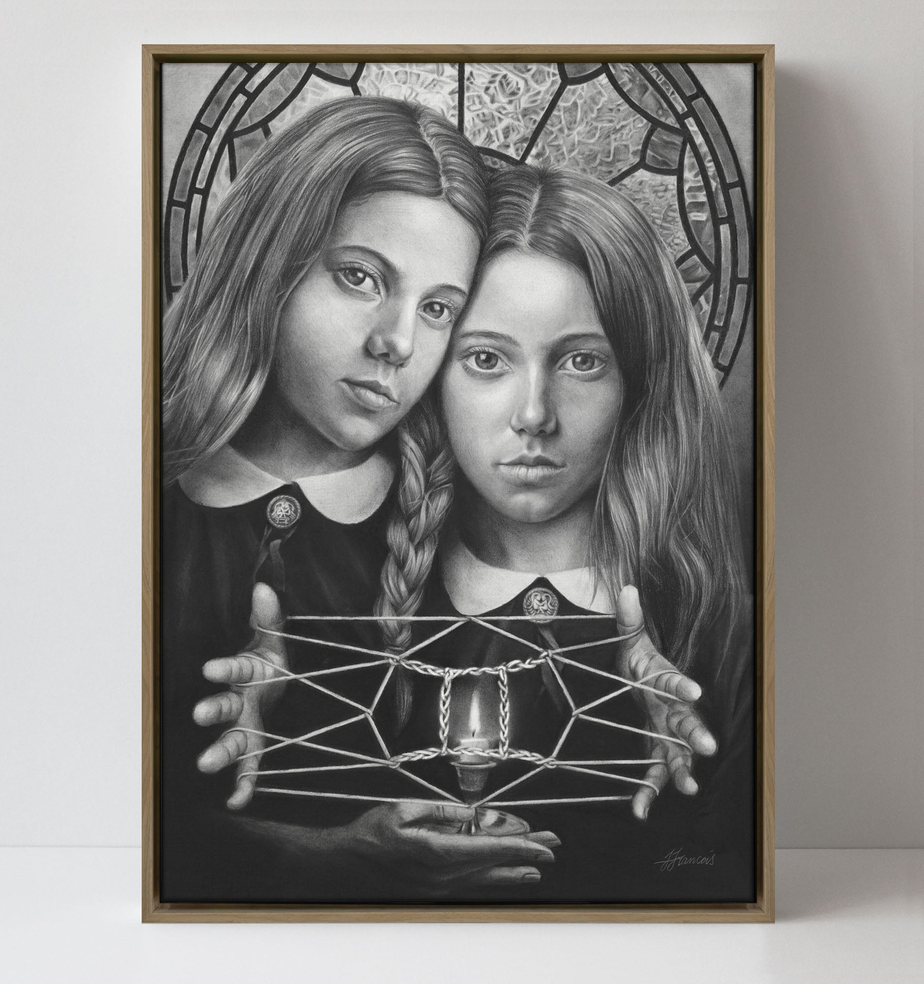 Third in the Zodiac series. Charcoal and pencil drawing of twins personifying the Gemini attributes.