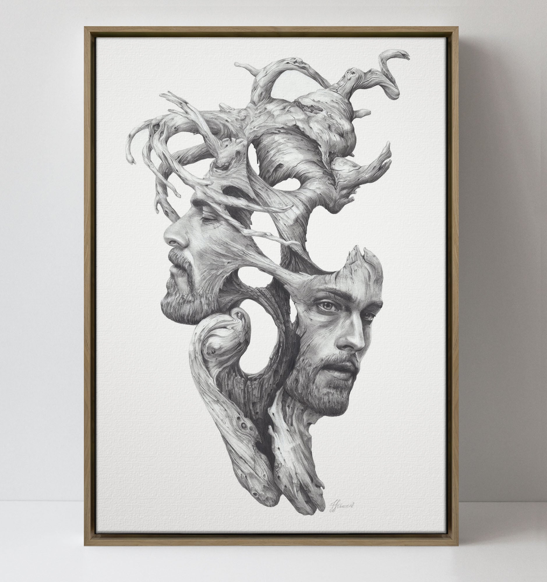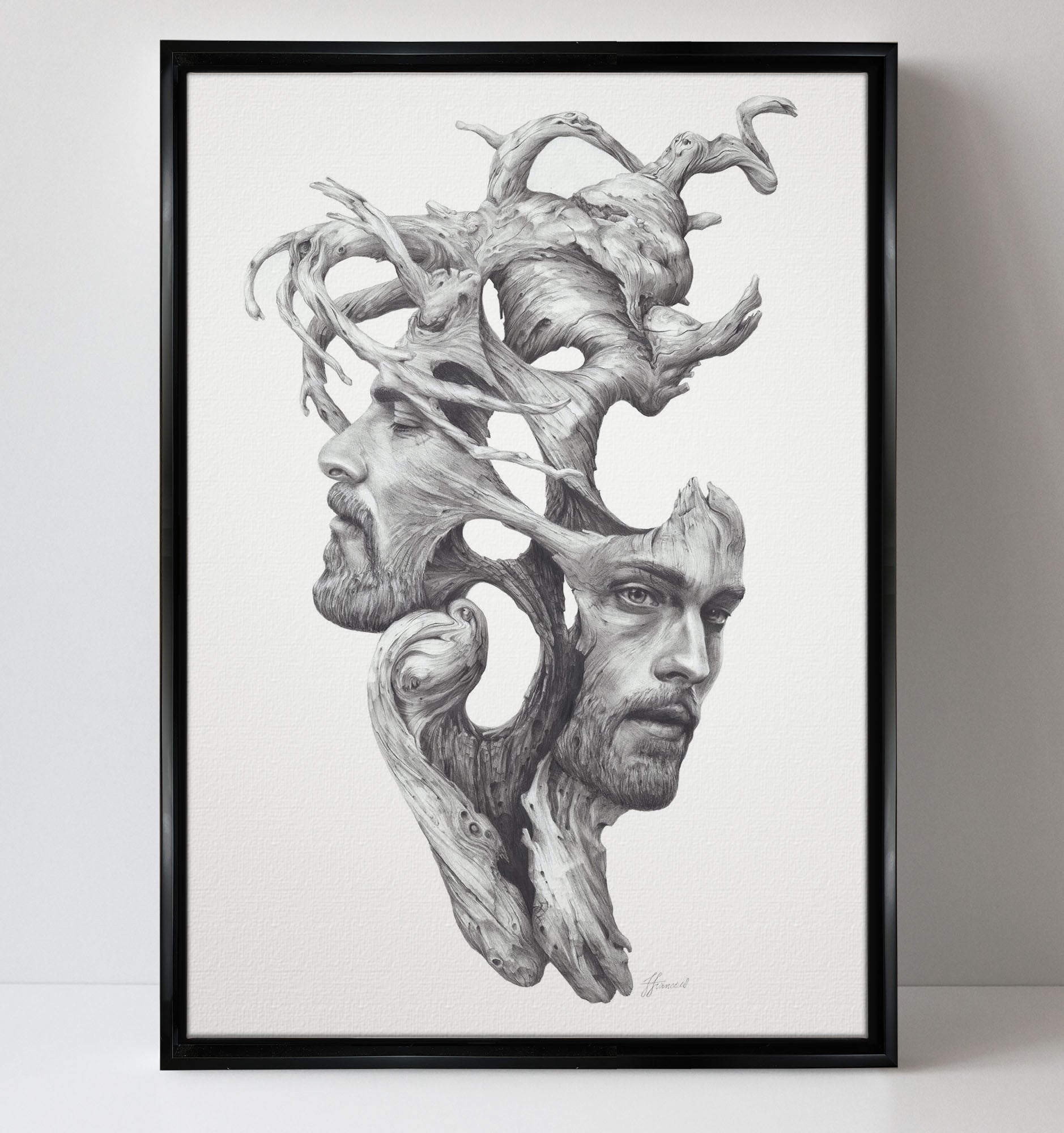 Detailed pencil and charcoal drawing of a fantasy driftwood sculpture with two faces emerging from the wood.