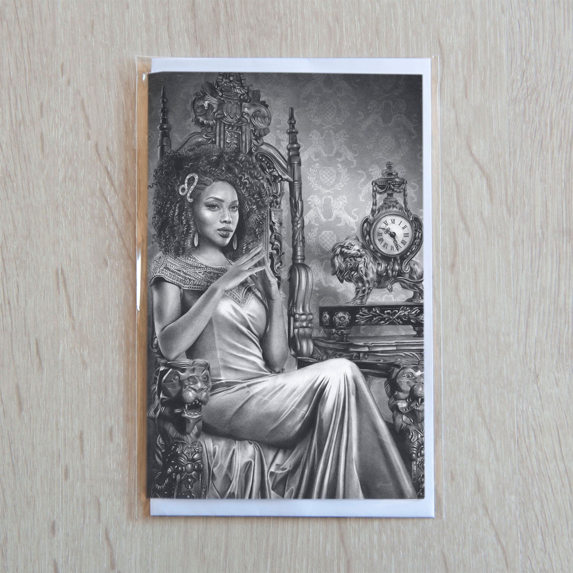 Glossy greeting card featuring 'Leo' graphite pencil drawing of the Zodiac series. Folded card is 11.5 x 18cm, blank inside and comes with envelope sealed in a clear cello bag.