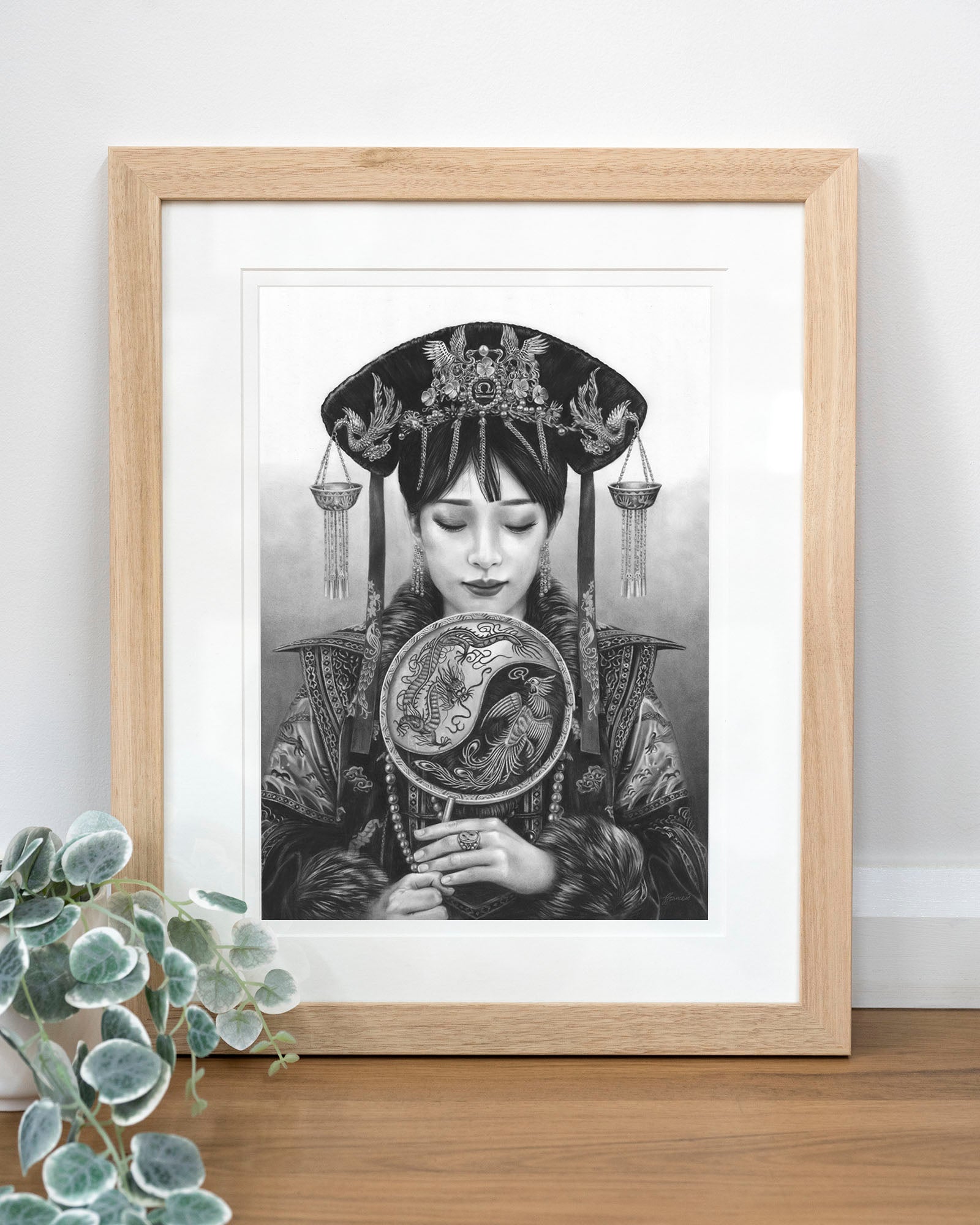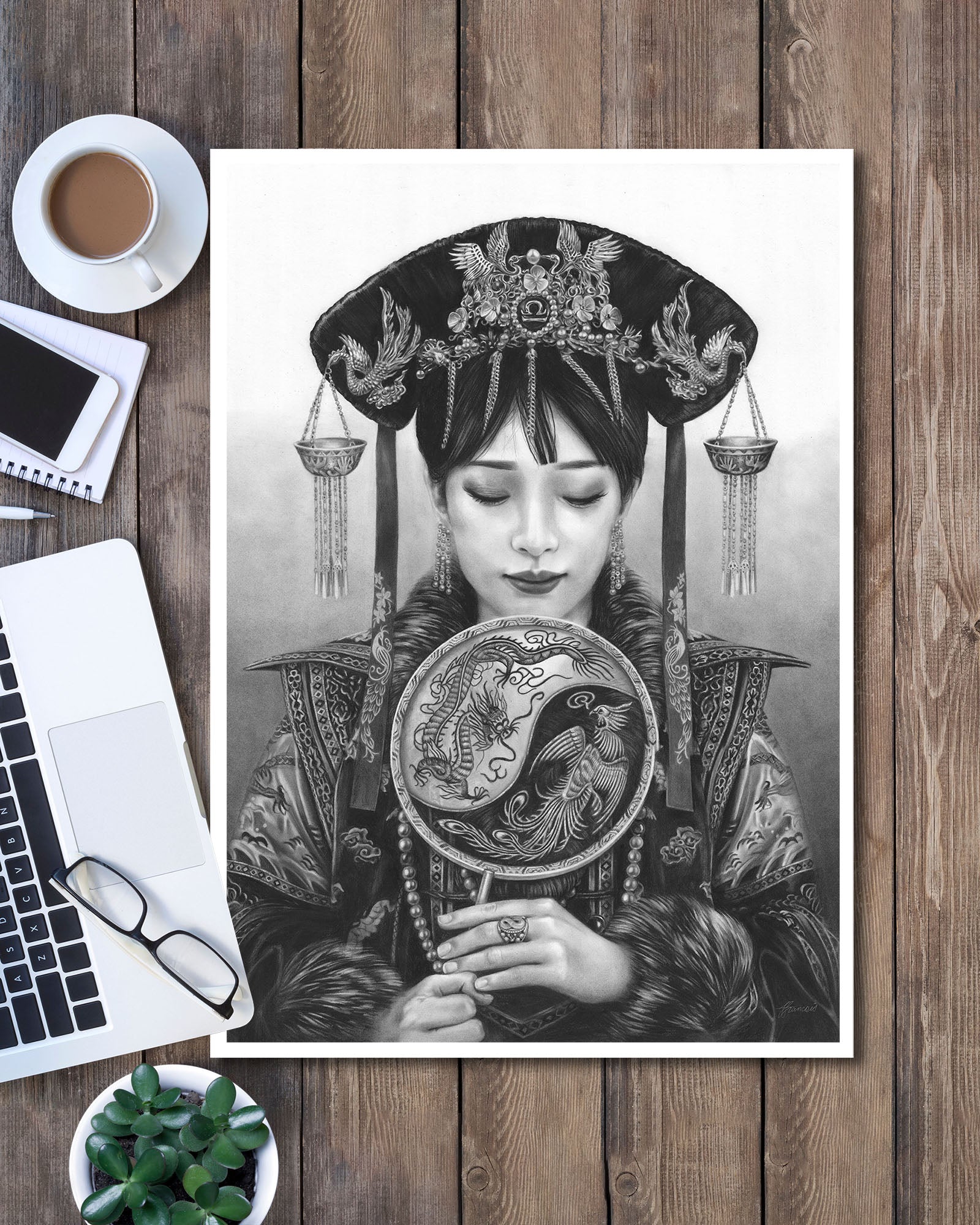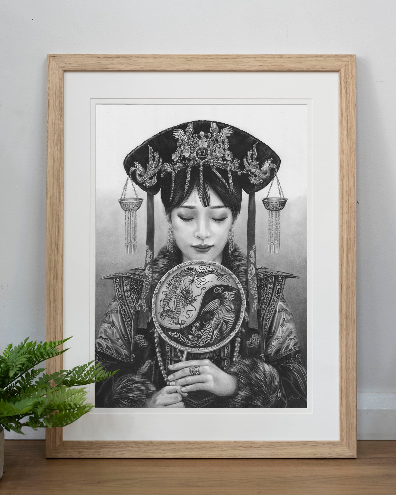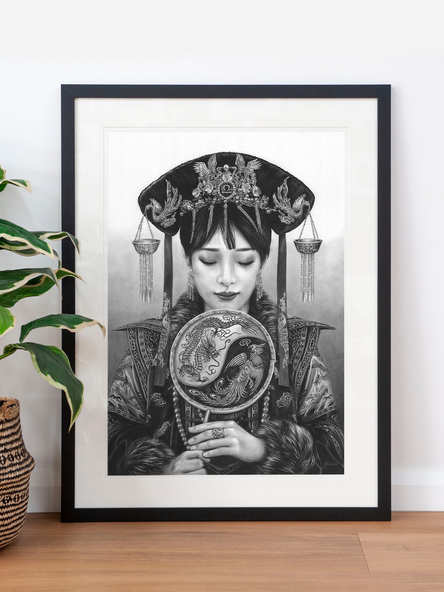 Archival print on cotton art paper. Charcoal and pencil drawing of a woman representing Libra in the signs of the Zodiac.