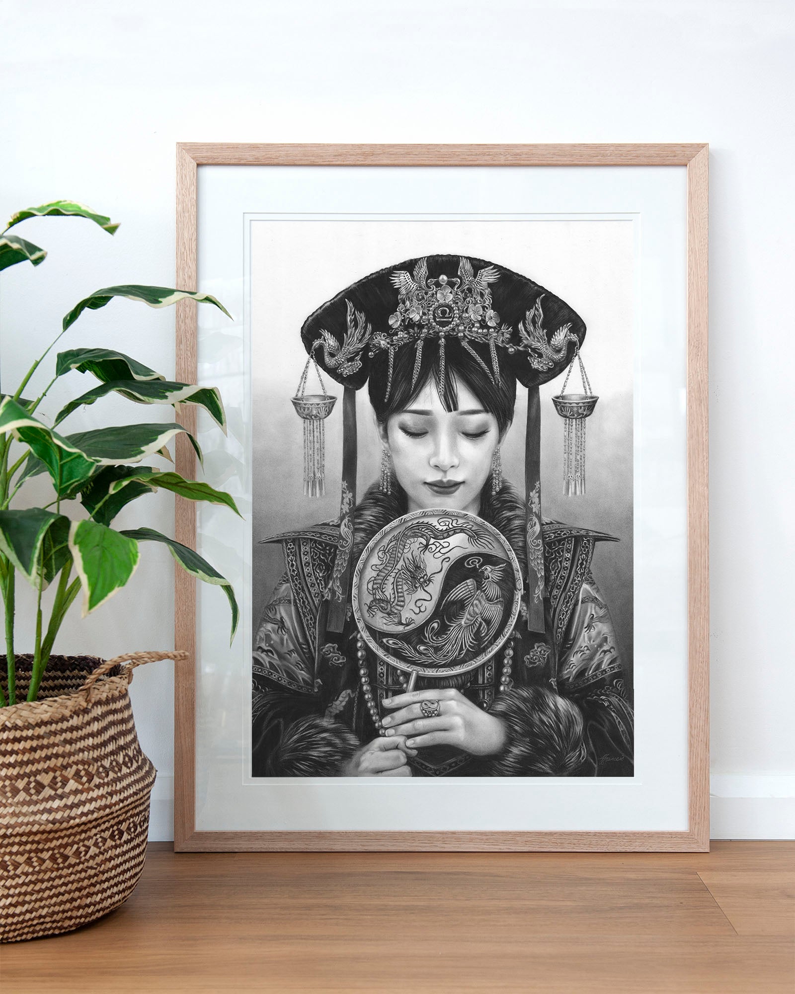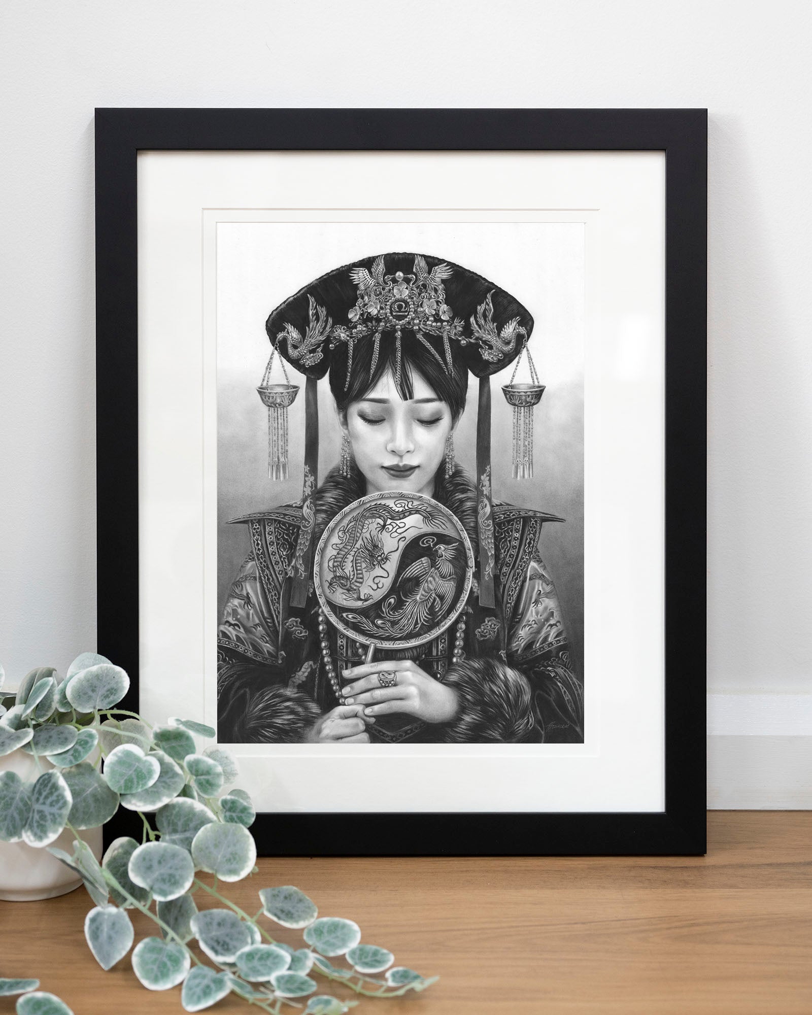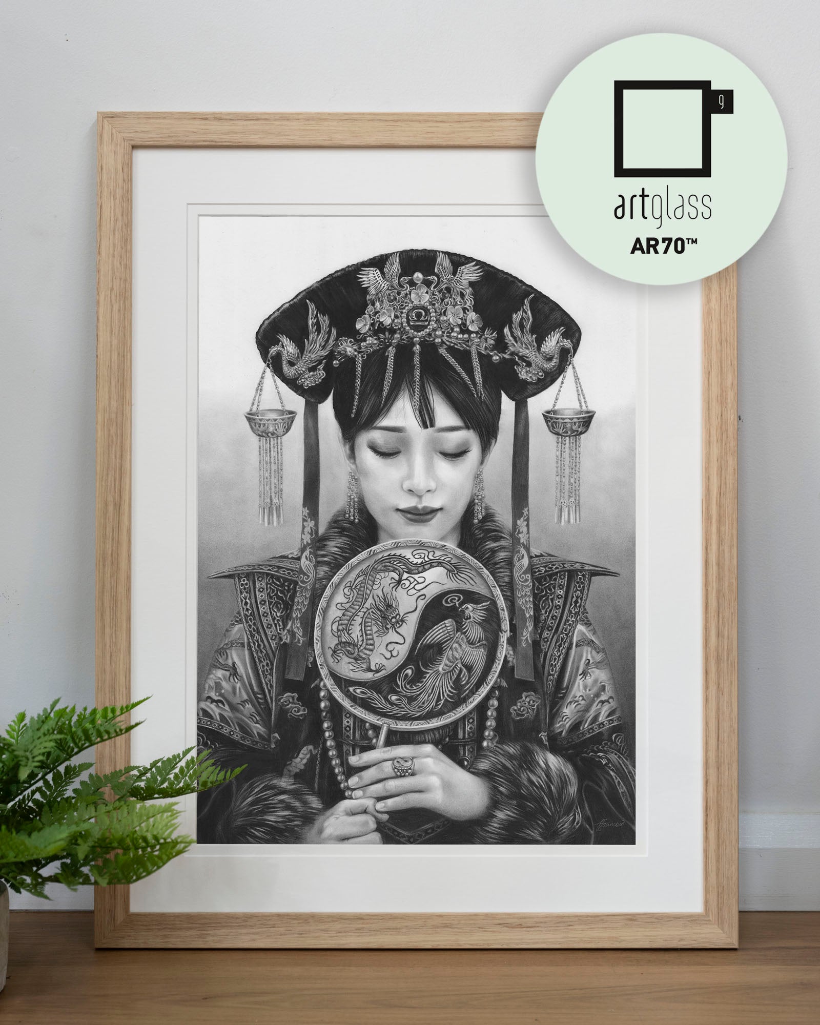 Archival print on cotton art paper. Charcoal and pencil drawing of a woman representing Libra in the signs of the Zodiac.