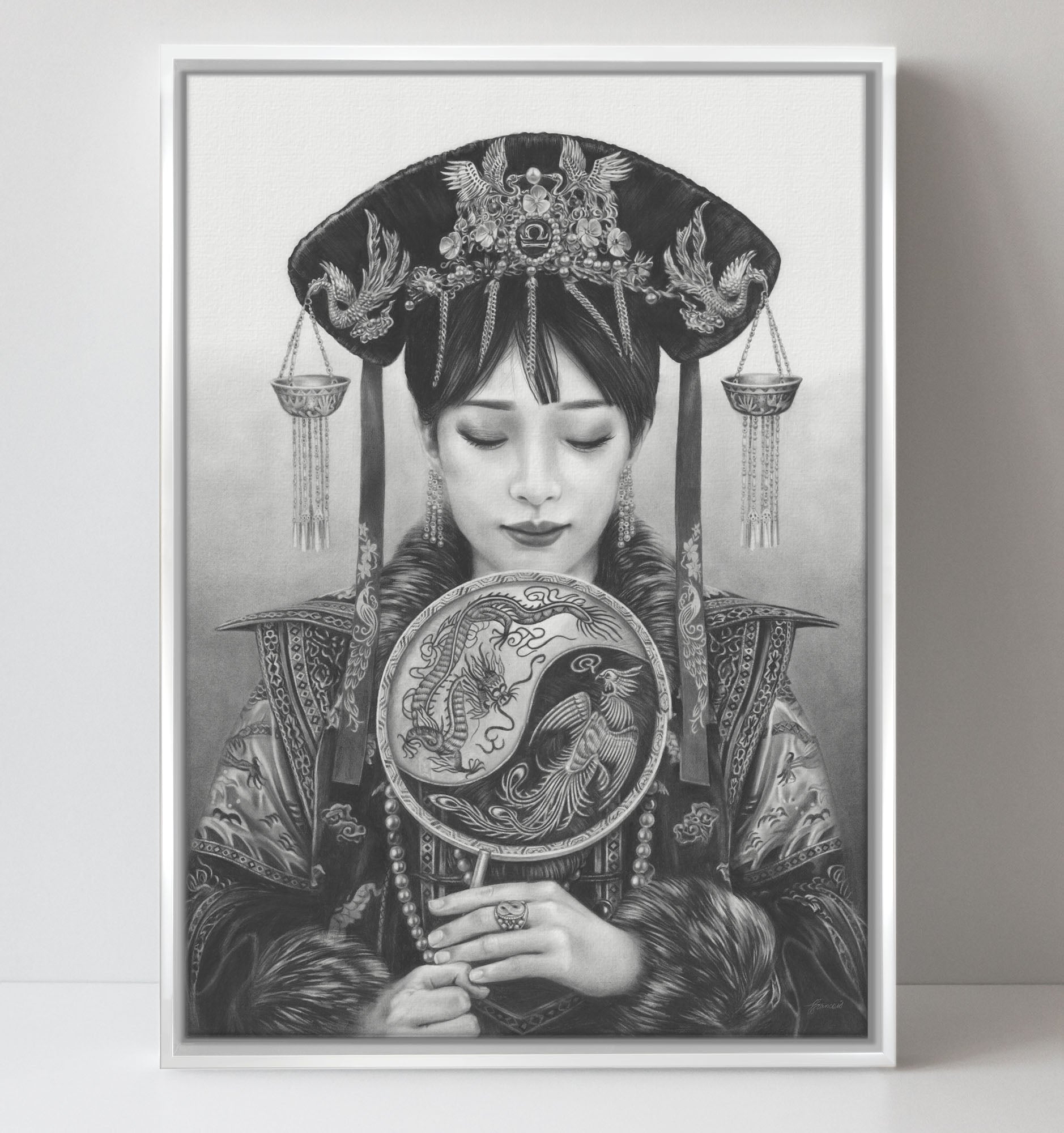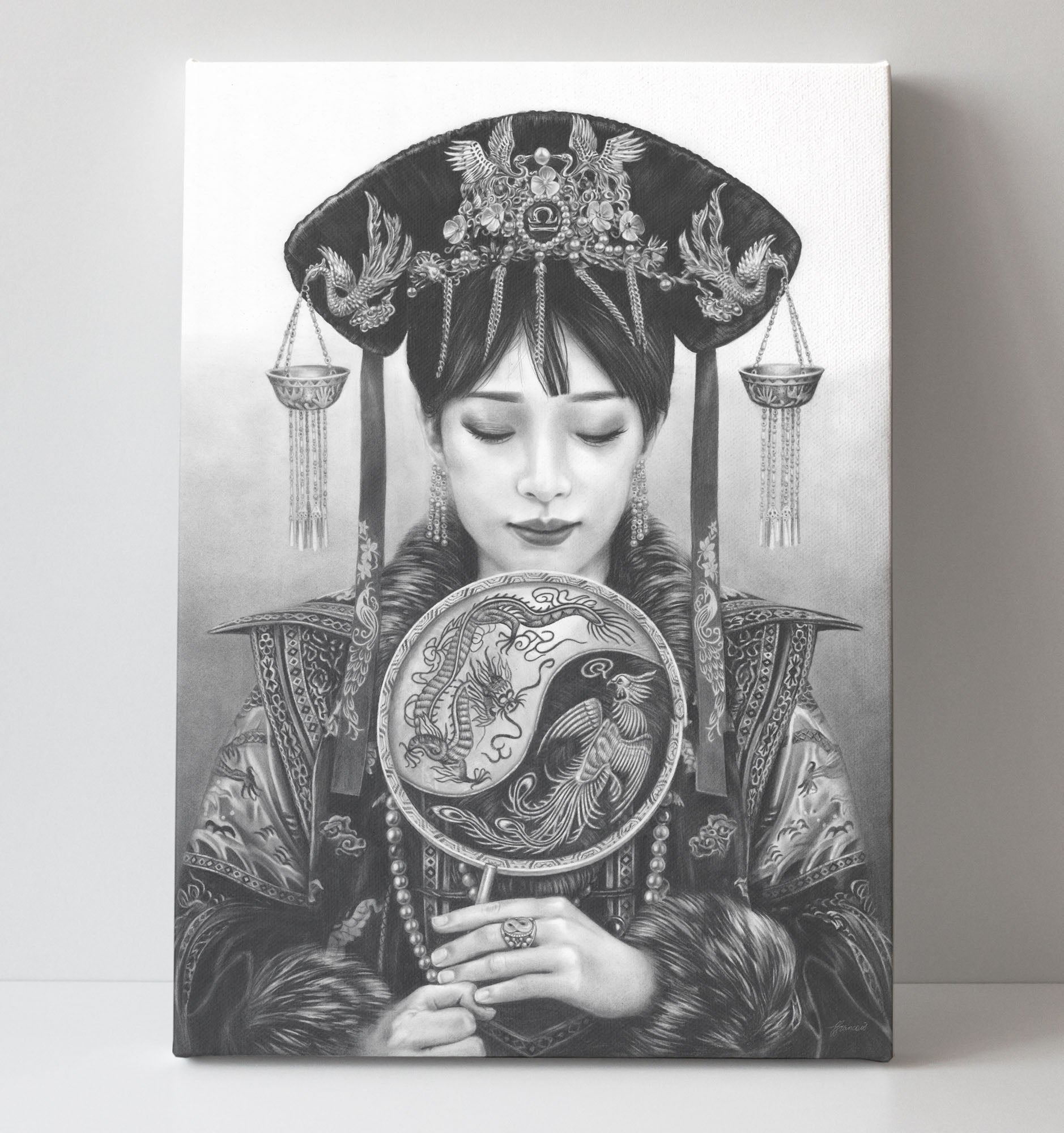 Seventh of the Zodiac series. Charcoal and pencil drawing of a woman personifying the Libra attributes.