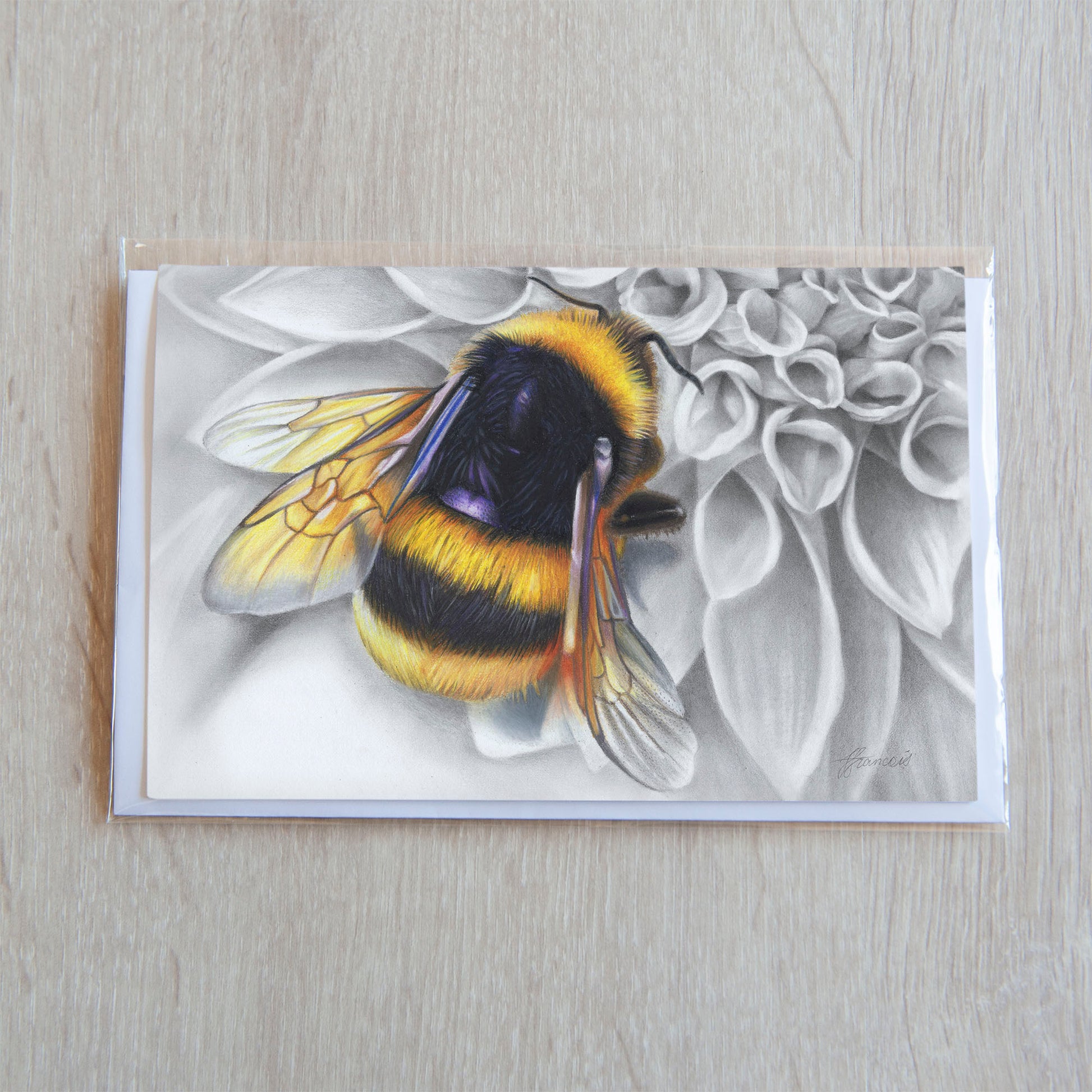 Glossy greeting card featuring 'Mumma Buzz' pencil drawing. Folded card is 11.5 x 18cm, blank inside and comes with envelope sealed in a clear cello bag.