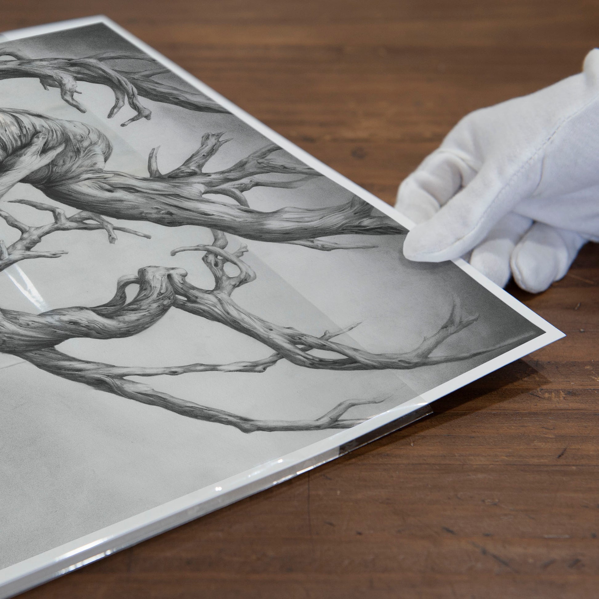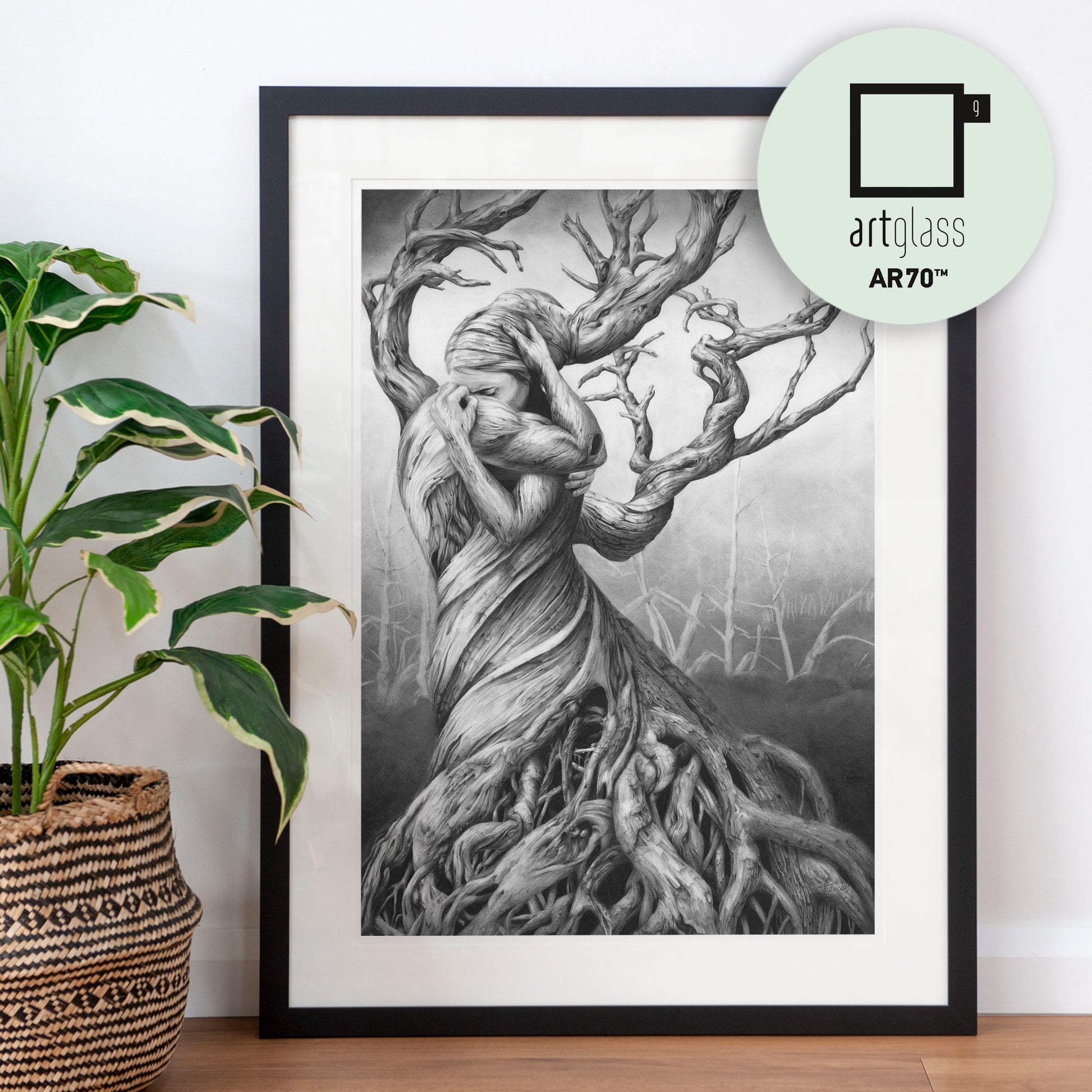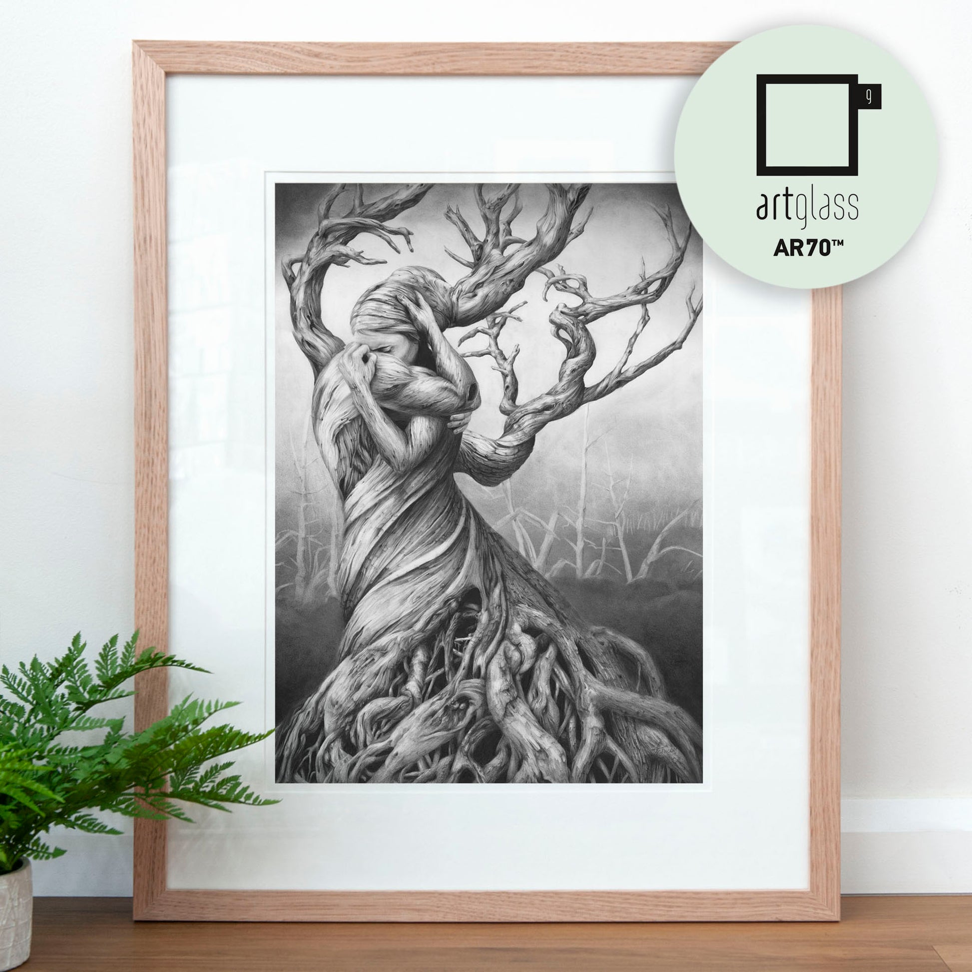 Archival print on cotton art paper. Detailed pencil and charcoal drawing of a couple entwined in a lover's embrace depicted as a tree.