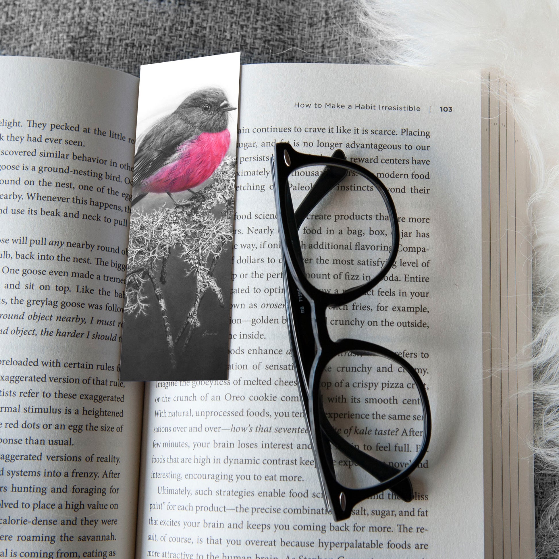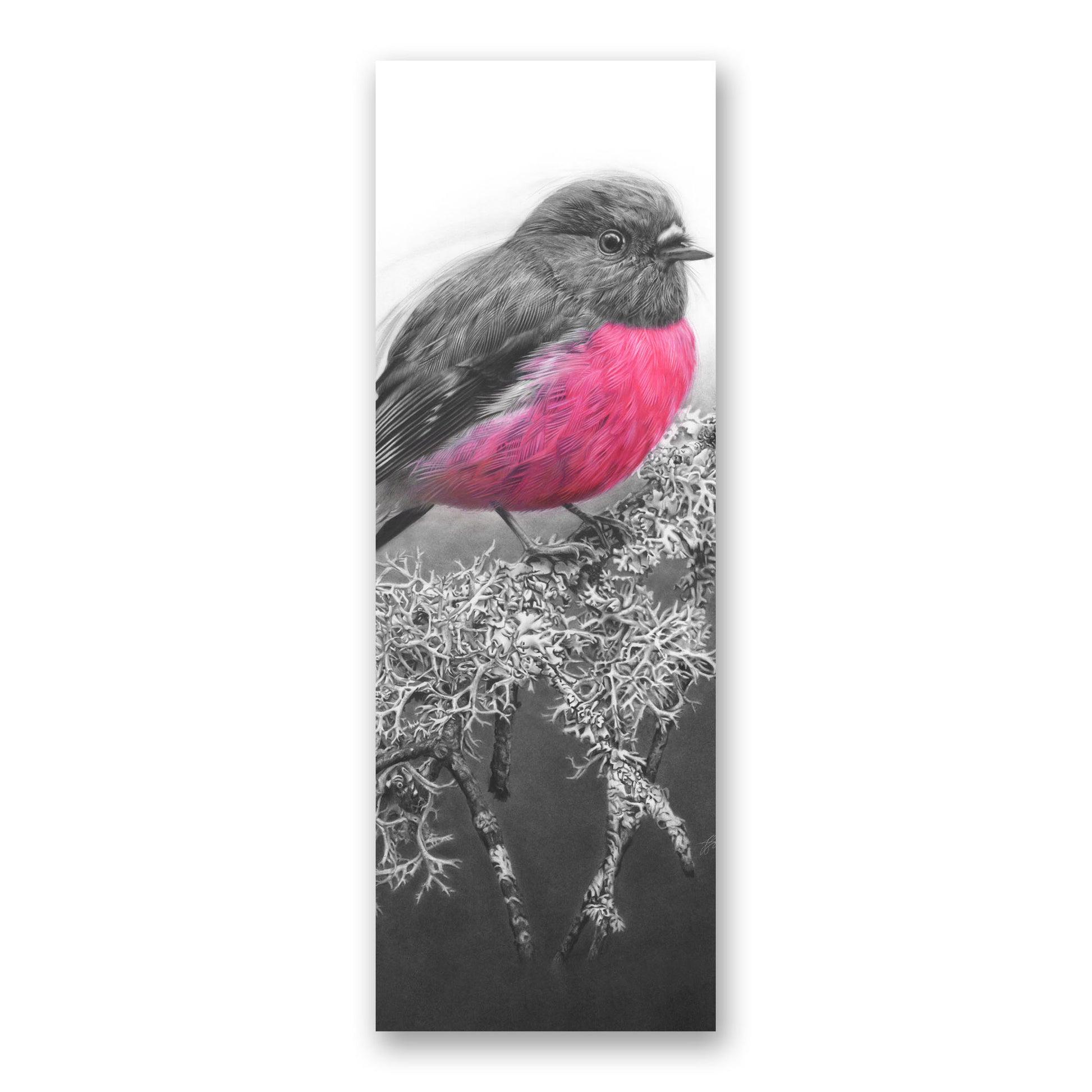 Glossy bookmark featuring charcoal and colour pencil drawing of 'Pink Robin'. 4.5 x 14cm.