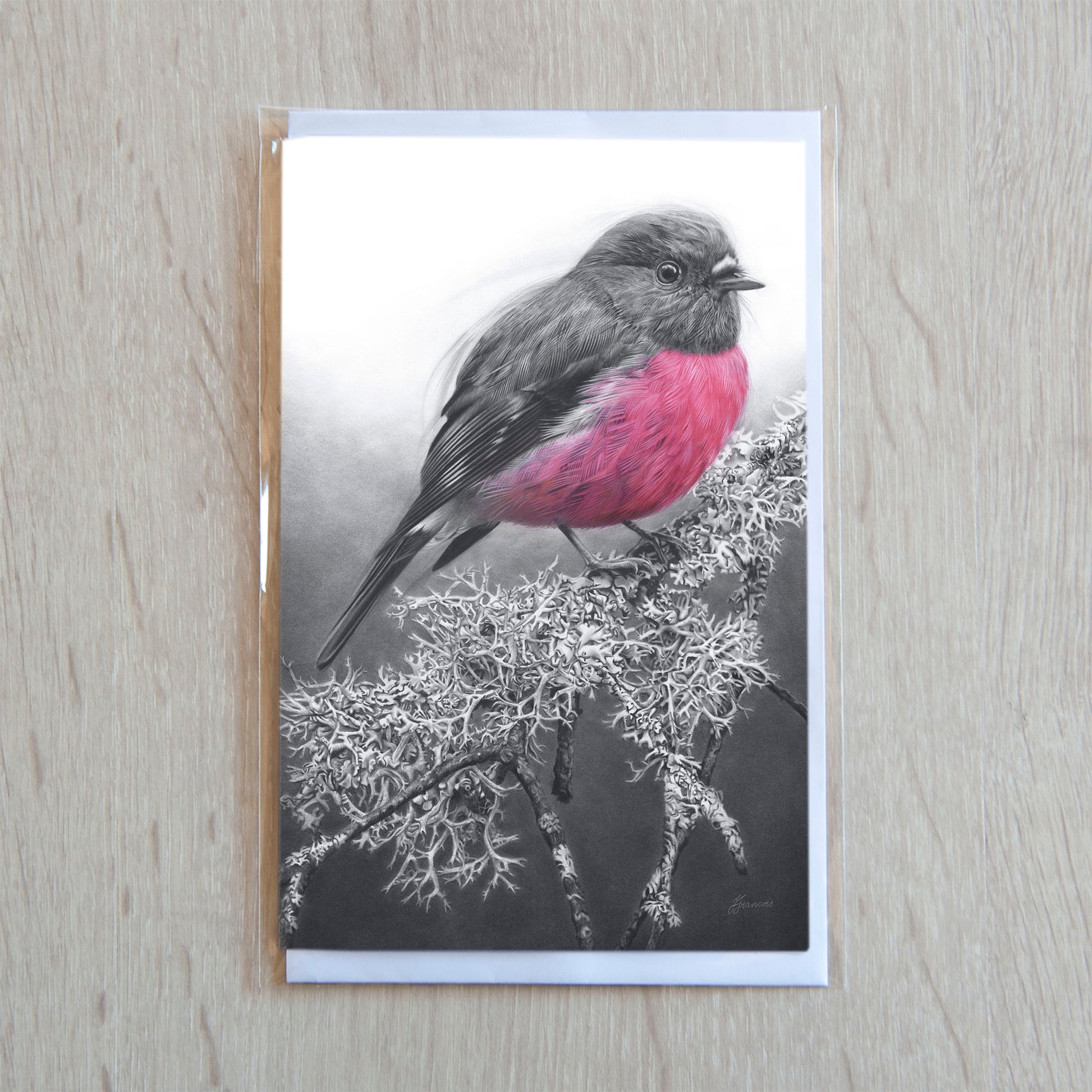 Glossy greeting card featuring 'Pink Robin' pencil drawing. Folded card is 11.5 x 18cm, blank inside and comes with envelope sealed in a clear cello bag.