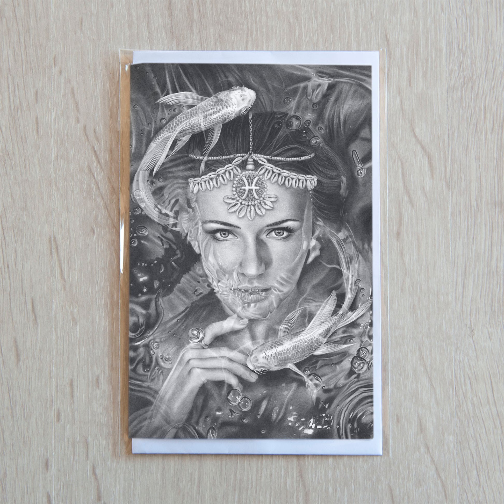 Glossy greeting card featuring 'Pisces' graphite pencil drawing of the Zodiac series. Folded card is 11.5 x 18cm, blank inside and comes with envelope sealed in a clear cello bag.