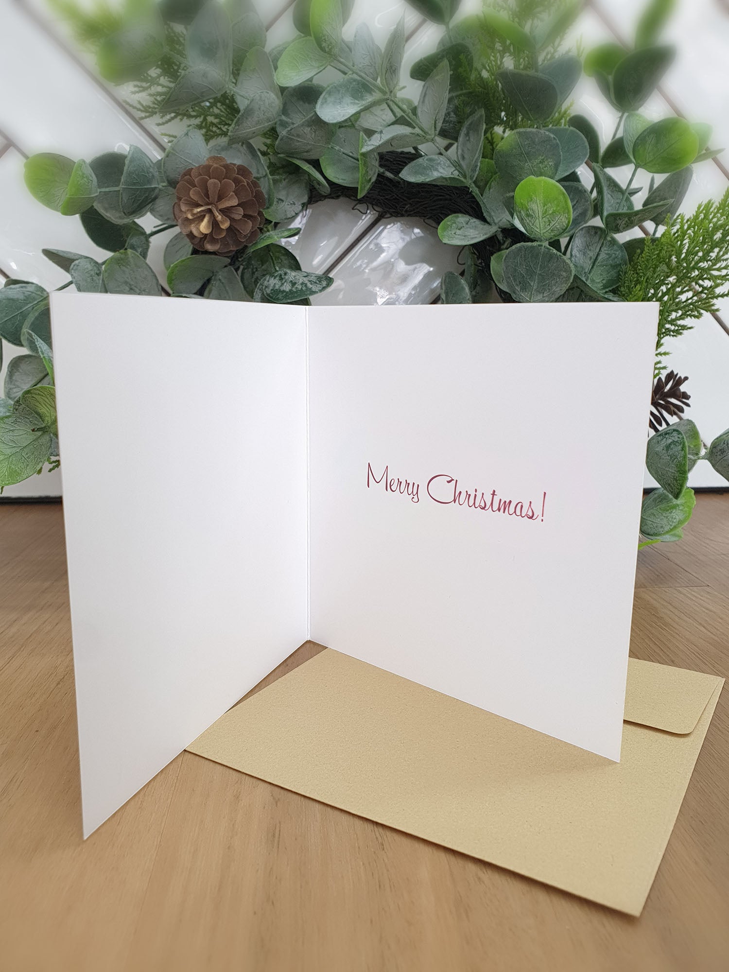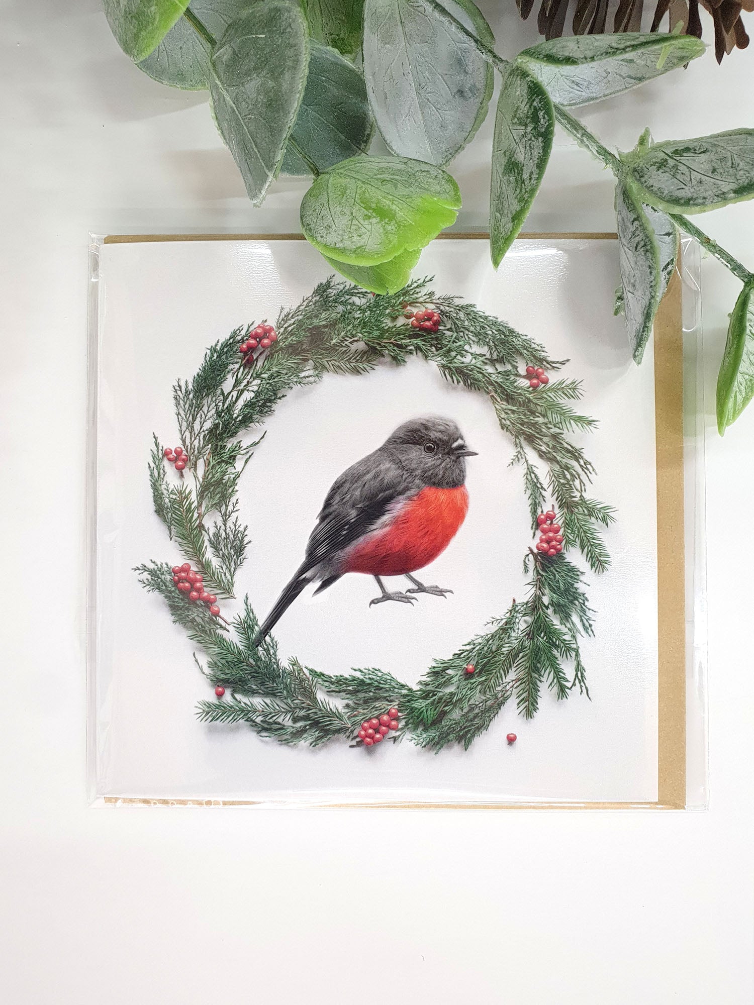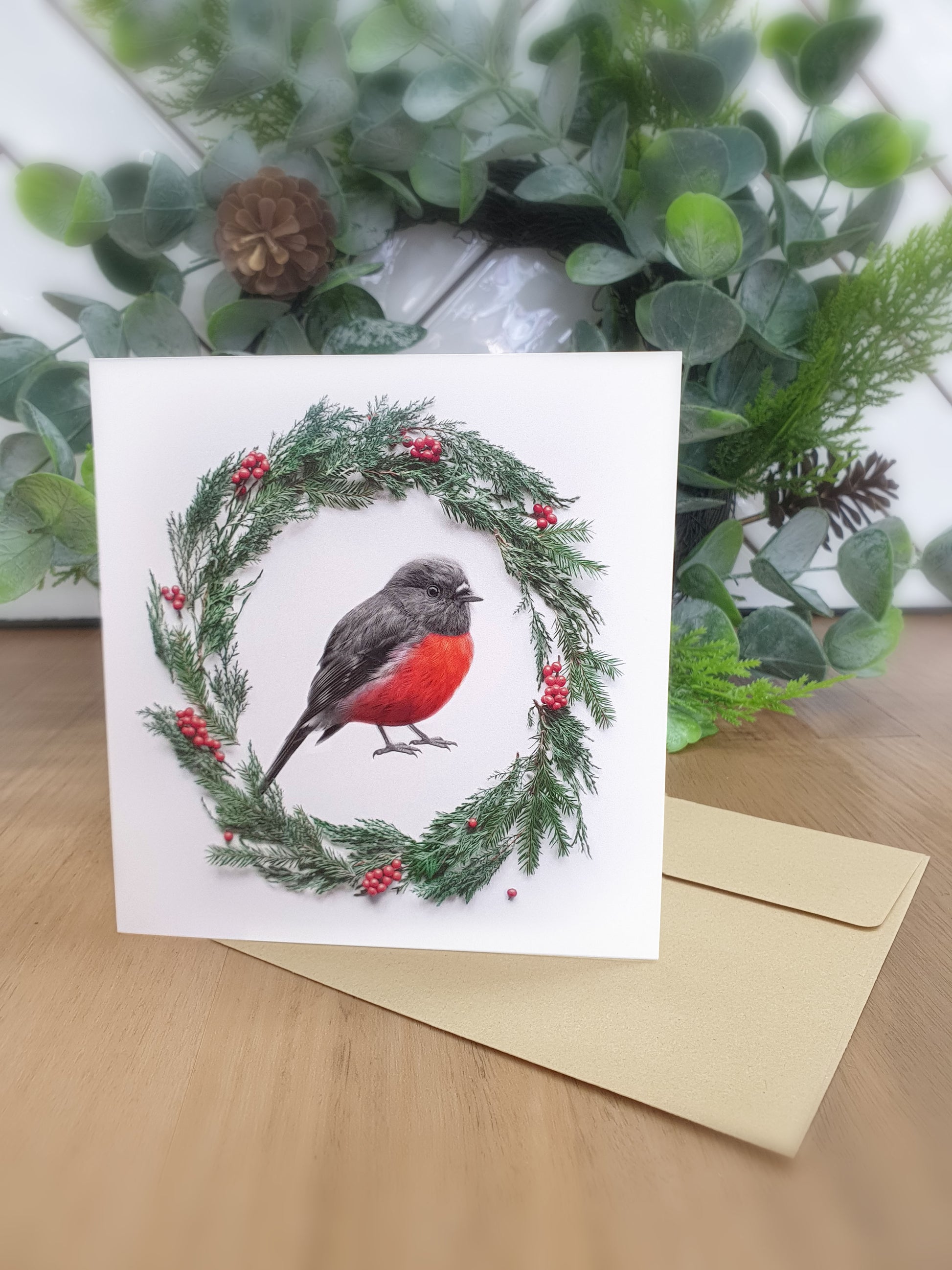 Glossy greeting card featuring 'Scarlet Robin' charcoal and colour pencil drawing. Folded card is 14 x 14cm and comes with envelope sealed in a clear cello bag.