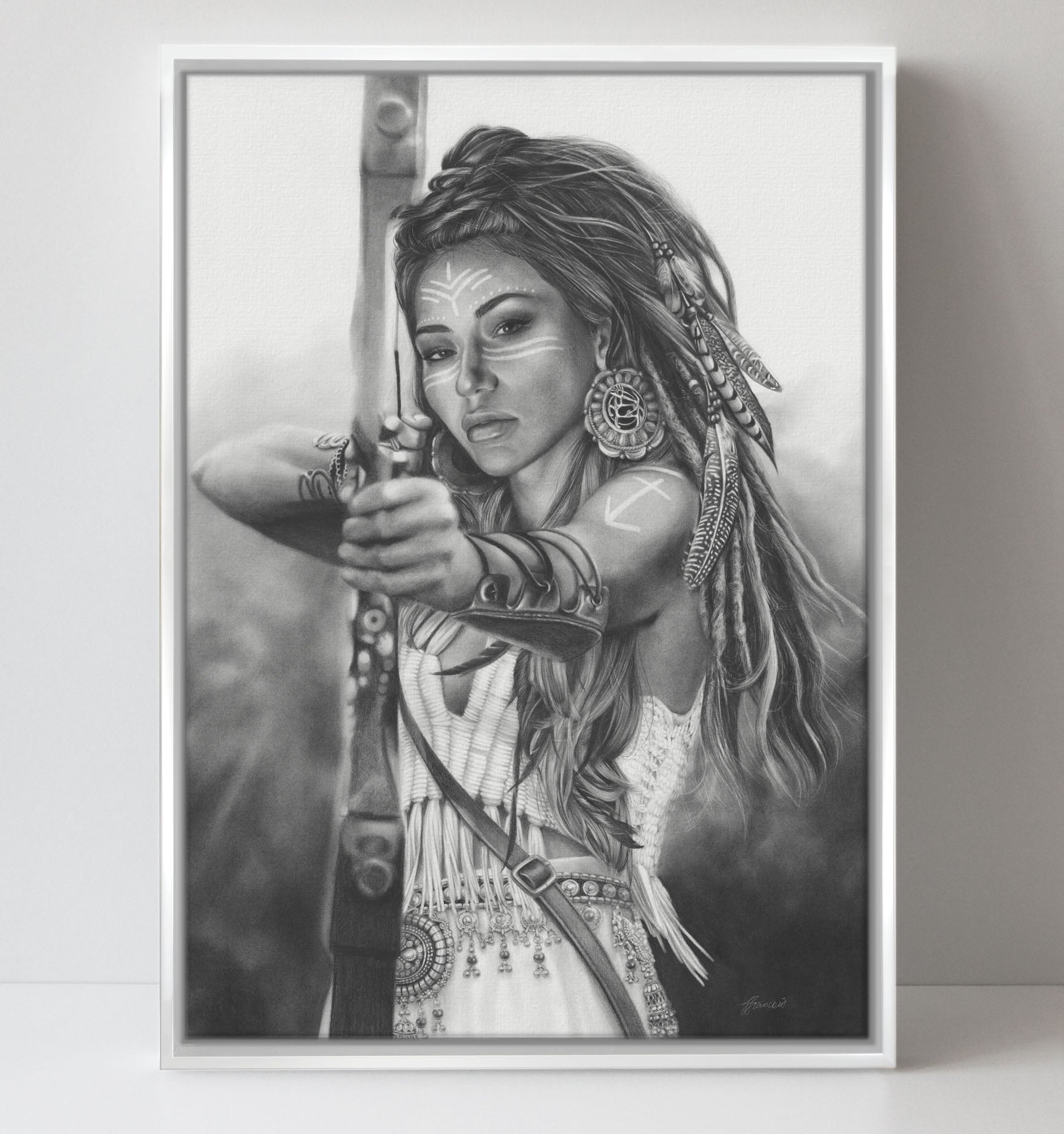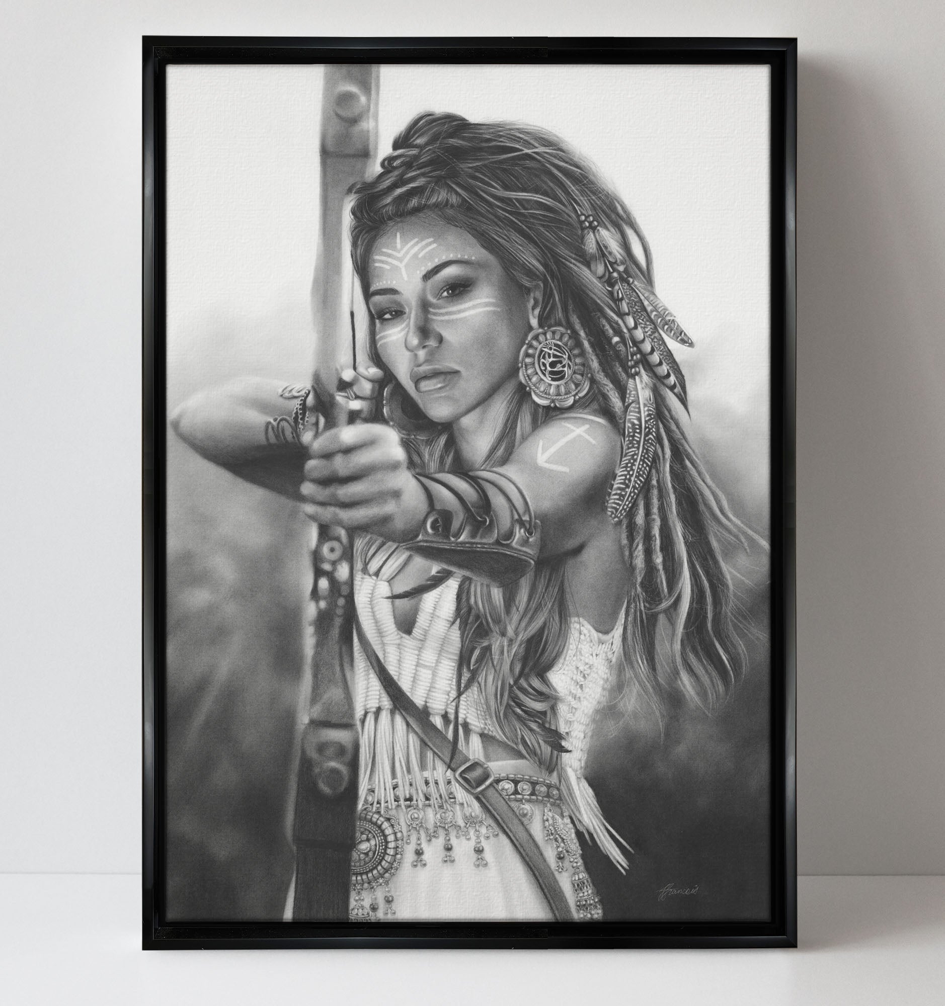 Ninth in the Zodiac series. Charcoal and pencil drawing of a woman personifying the Sagittarius attributes.