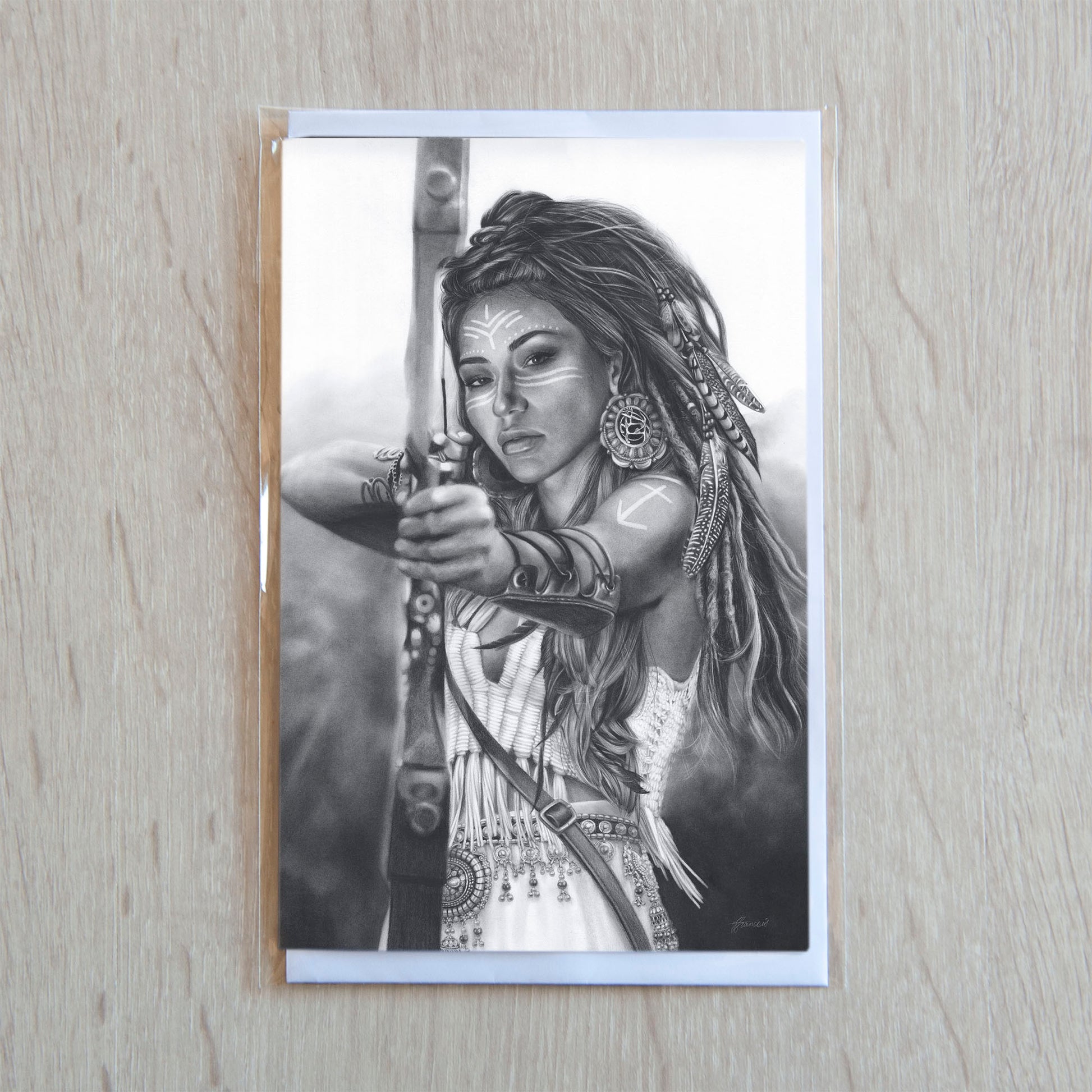 Glossy greeting card featuring 'Sagittarius' charcoal and graphite pencil drawing of the Zodiac series. Folded card is 11.5 x 18cm, blank inside and comes with envelope sealed in a clear cello bag.