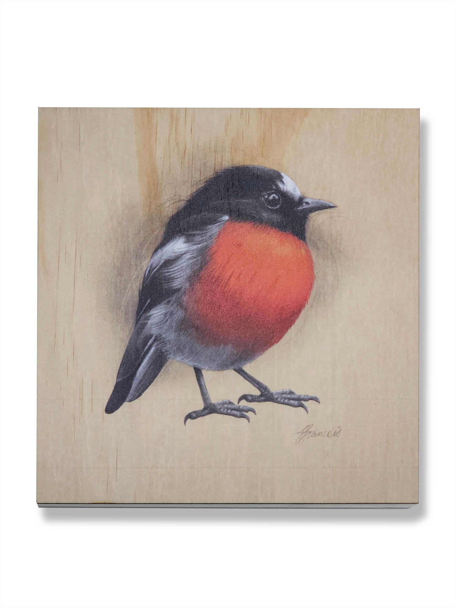 Small wood print featuring 'Scarlet Robin' drawing by Fiona Francois.