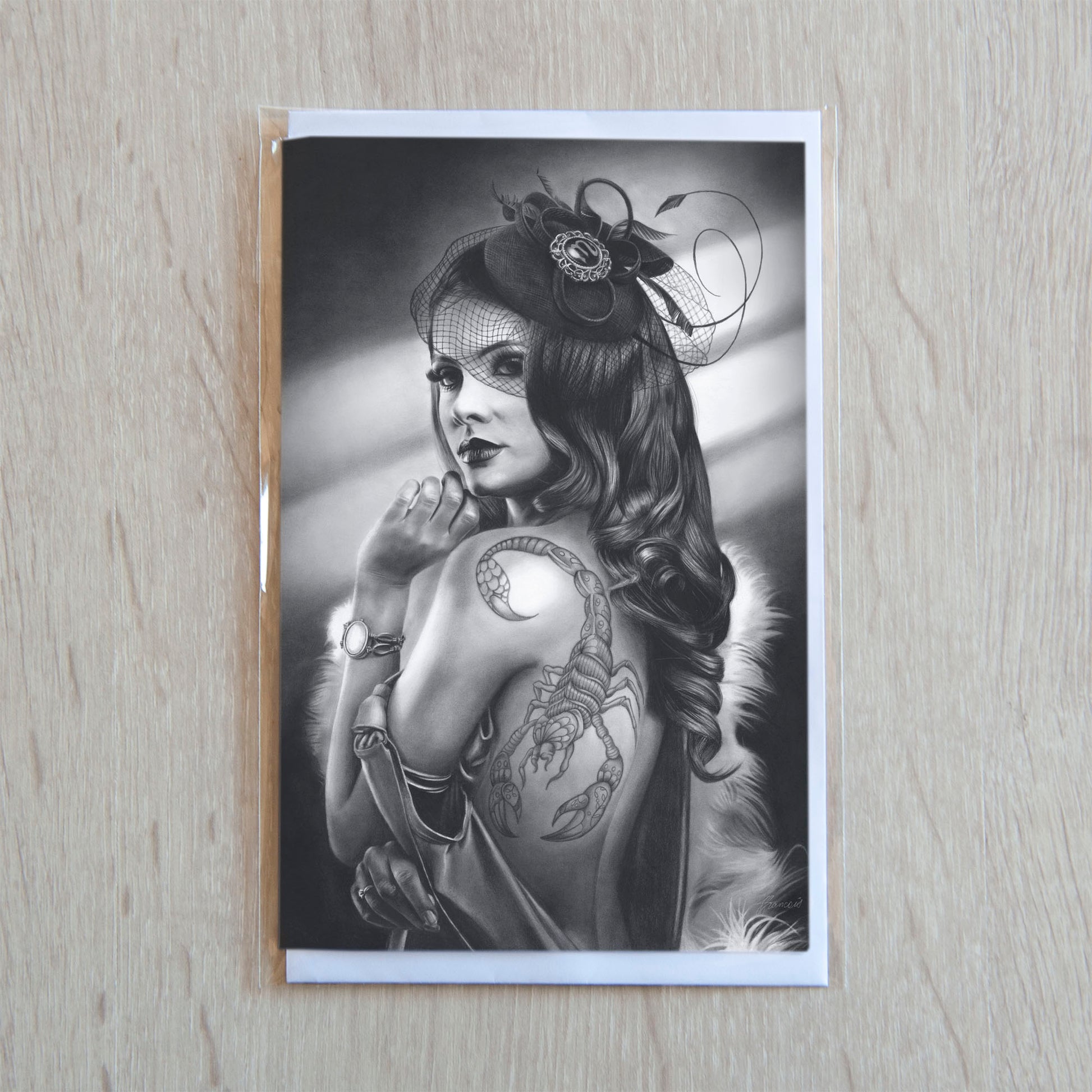 Glossy greeting card featuring 'Scorpio' graphite pencil drawing of the Zodiac series. Folded card is 11.5 x 18cm, blank inside and comes with envelope sealed in a clear cello bag.