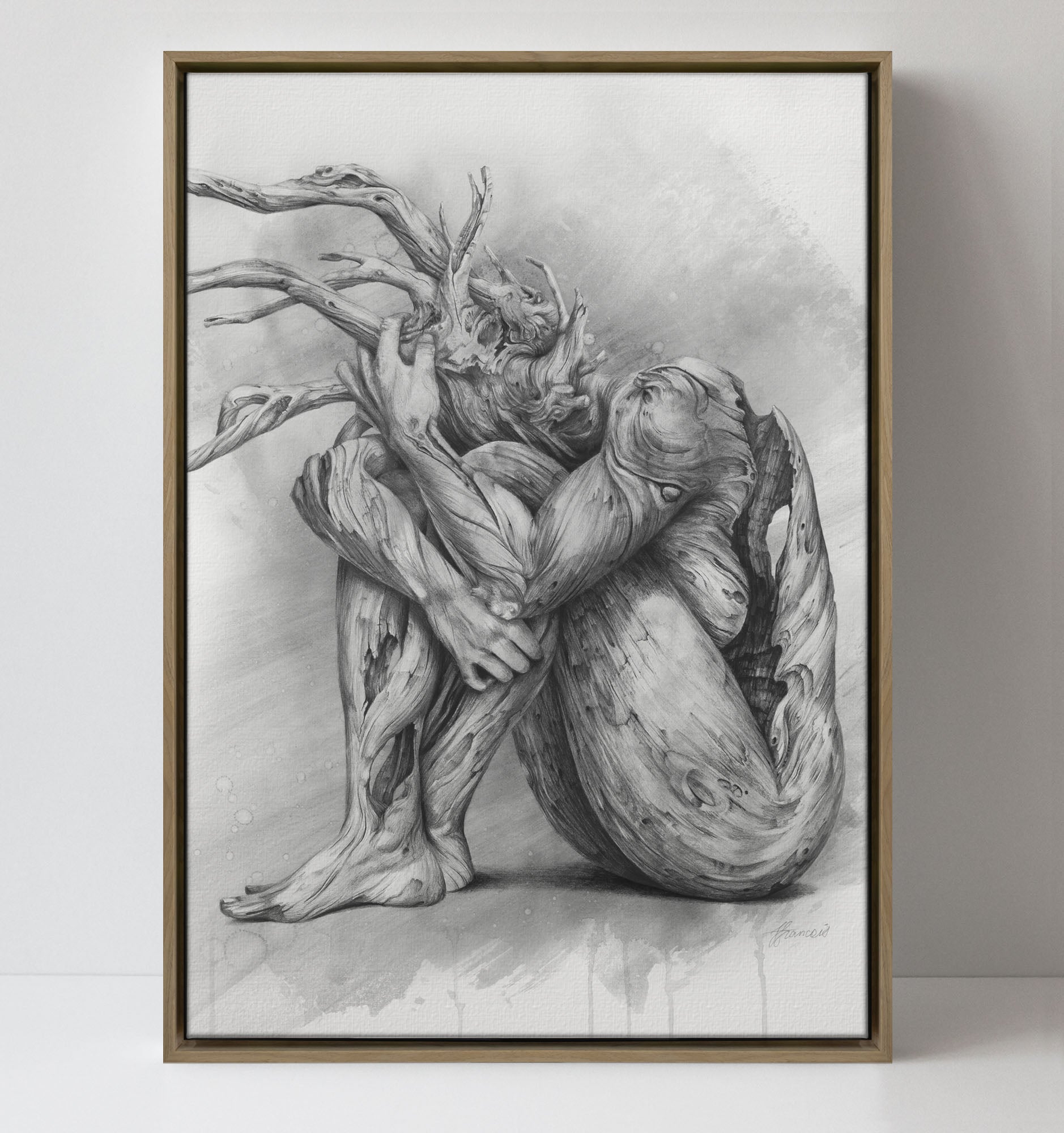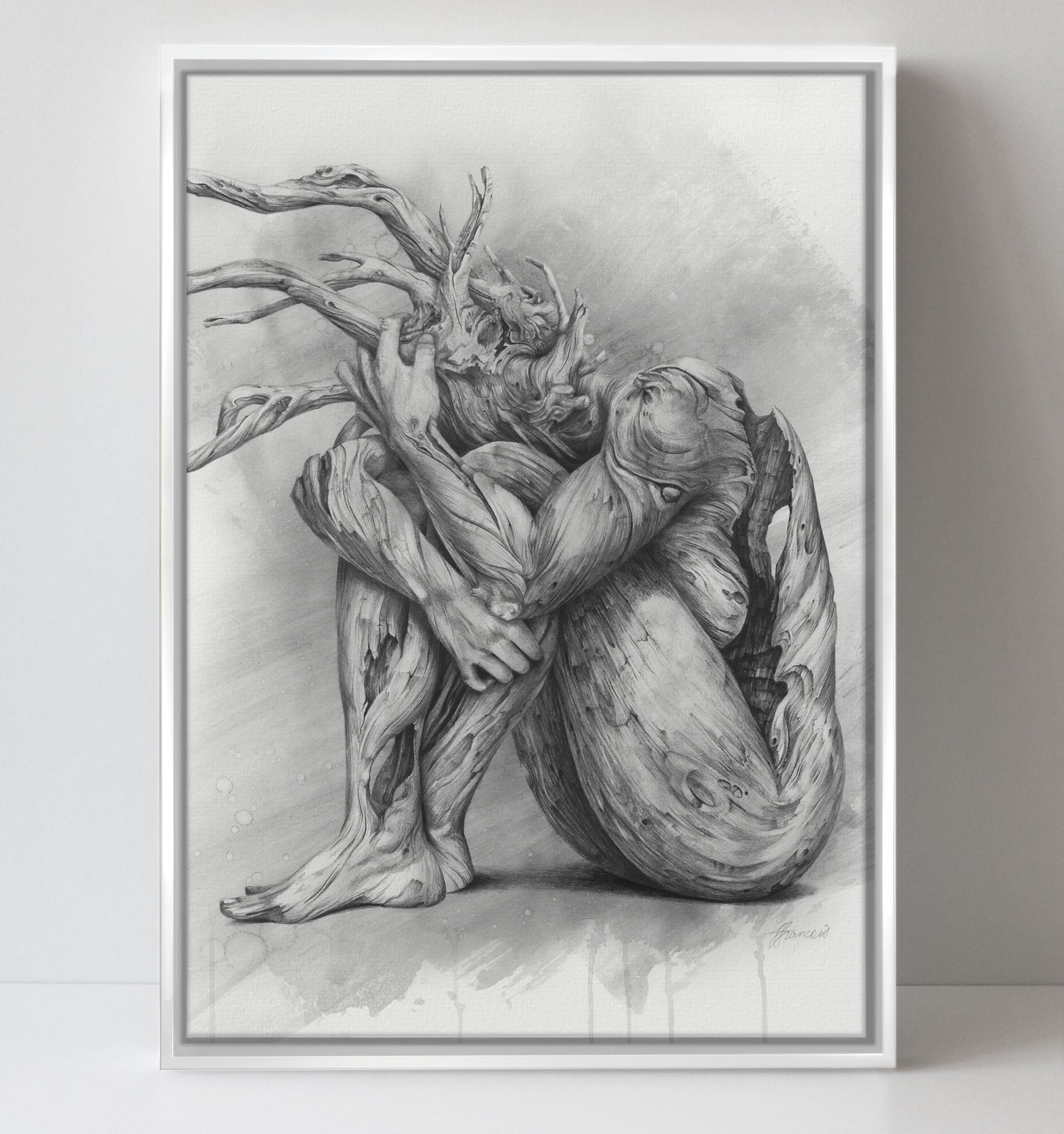Charcoal and watercolour drawing of a weathered, gnarled tree in the likeness of a woman's figure.