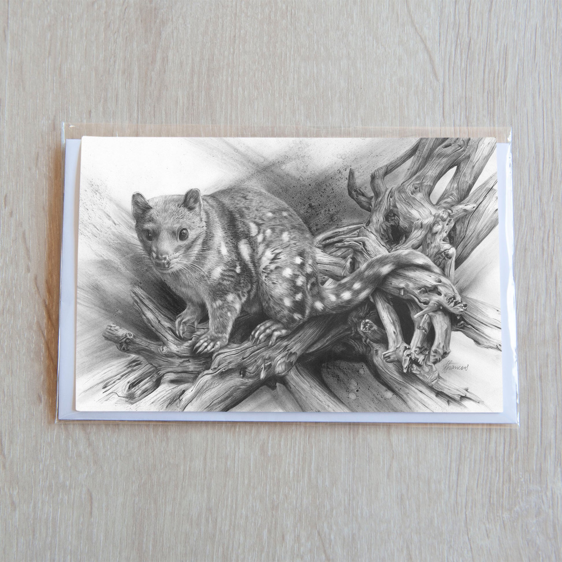 Glossy greeting card featuring 'Spotted Quoll' charcoal and graphite pencil drawing. Folded card is 11.5 x 18cm, blank inside and comes with envelope sealed in a clear cello bag.