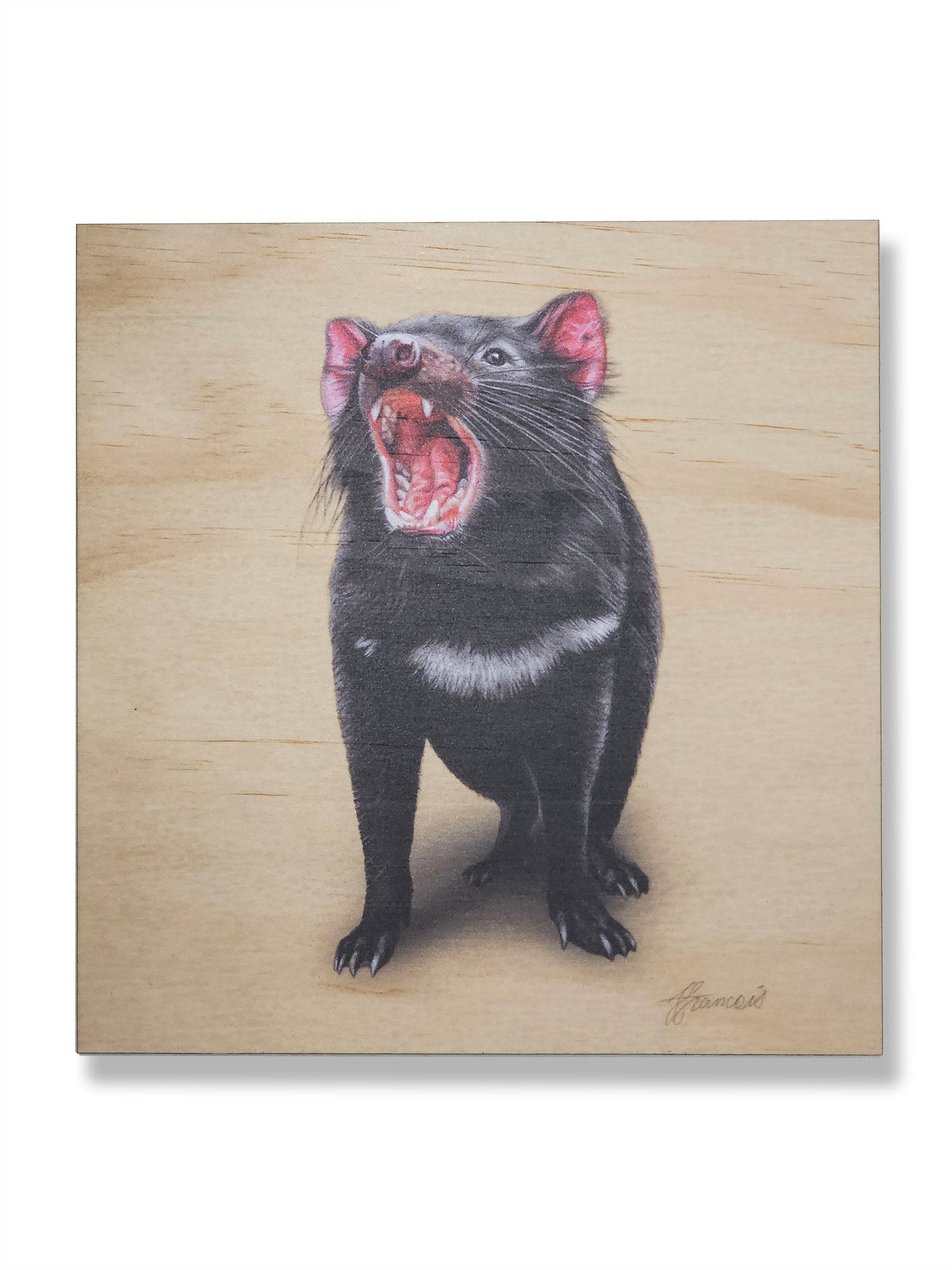 Small wood print featuring 'Devil's Advocate' drawing by Fiona Francois.