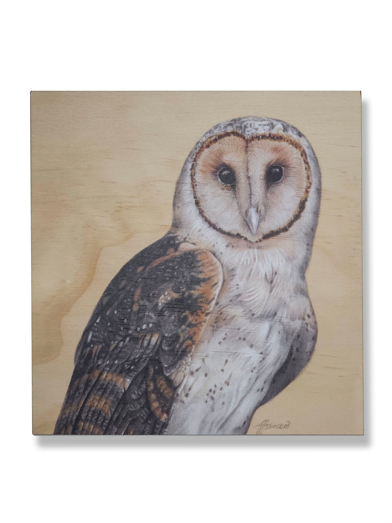 Small wood print featuring 'Tasmanian Masked Owl' drawing by Fiona Francois.
