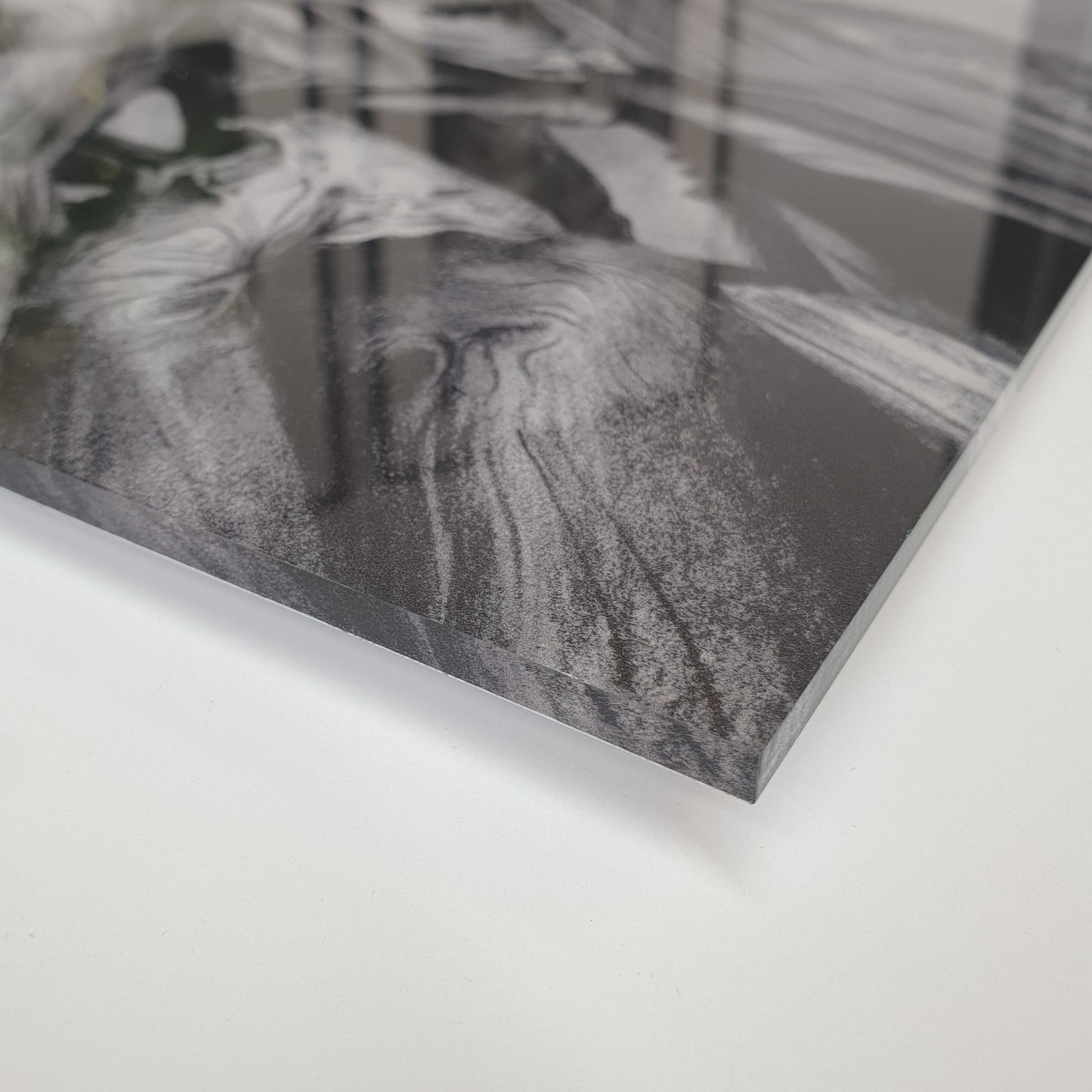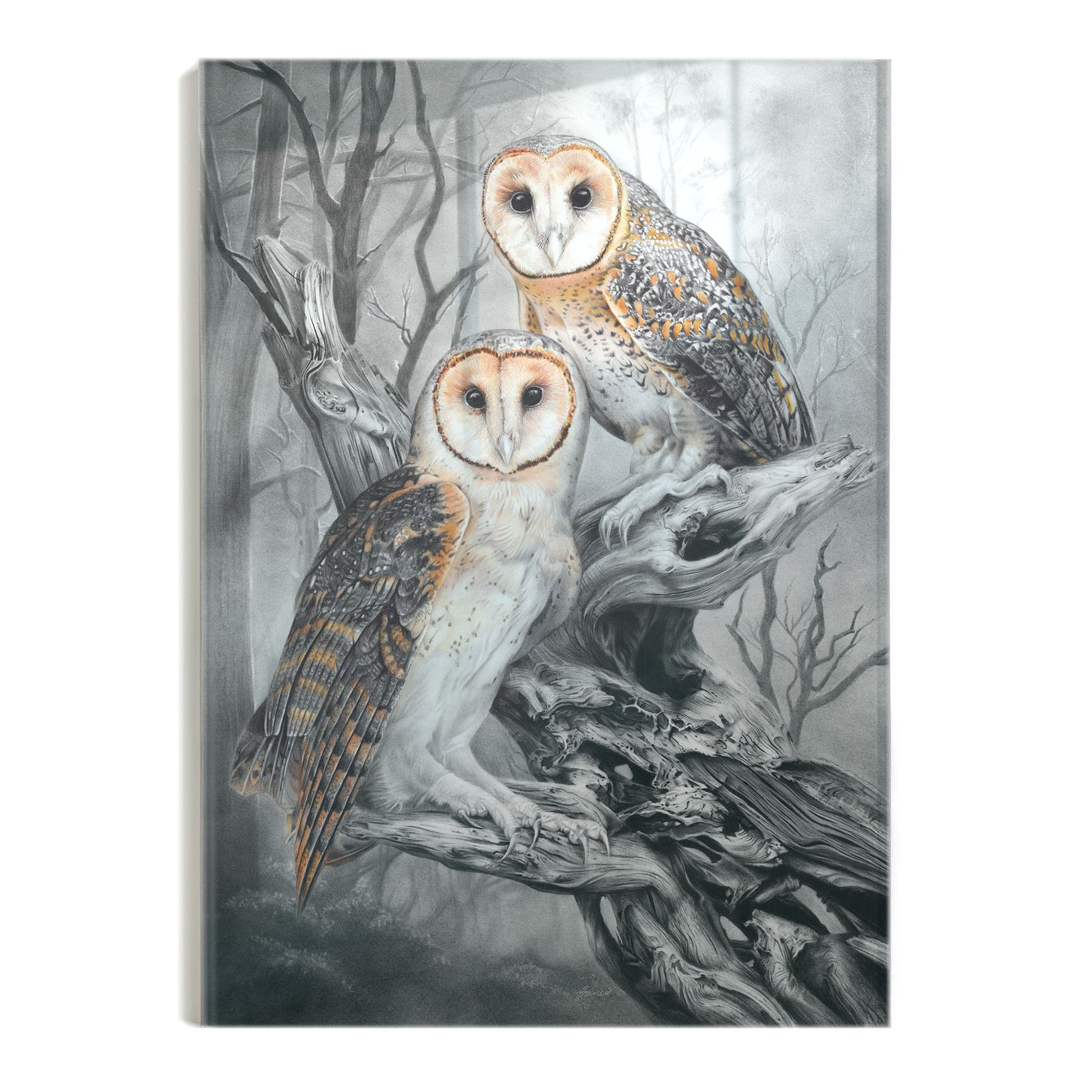 Acrylic print of 'Tasmanian Masked Owls' charcoal and colour pencil drawing. This contemporary frameless art print is perfect for adding a touch of class to your interior. High quality image printed on 6mm acrylic glass panel using the latest technology. Prints are water resistant and are suitable for hanging in bathrooms, kitchens and other wet areas. Quality fittings are mounted on the back of the print to allow for easy hanging from a standard picture hook. Larger prints have 2 fittings.