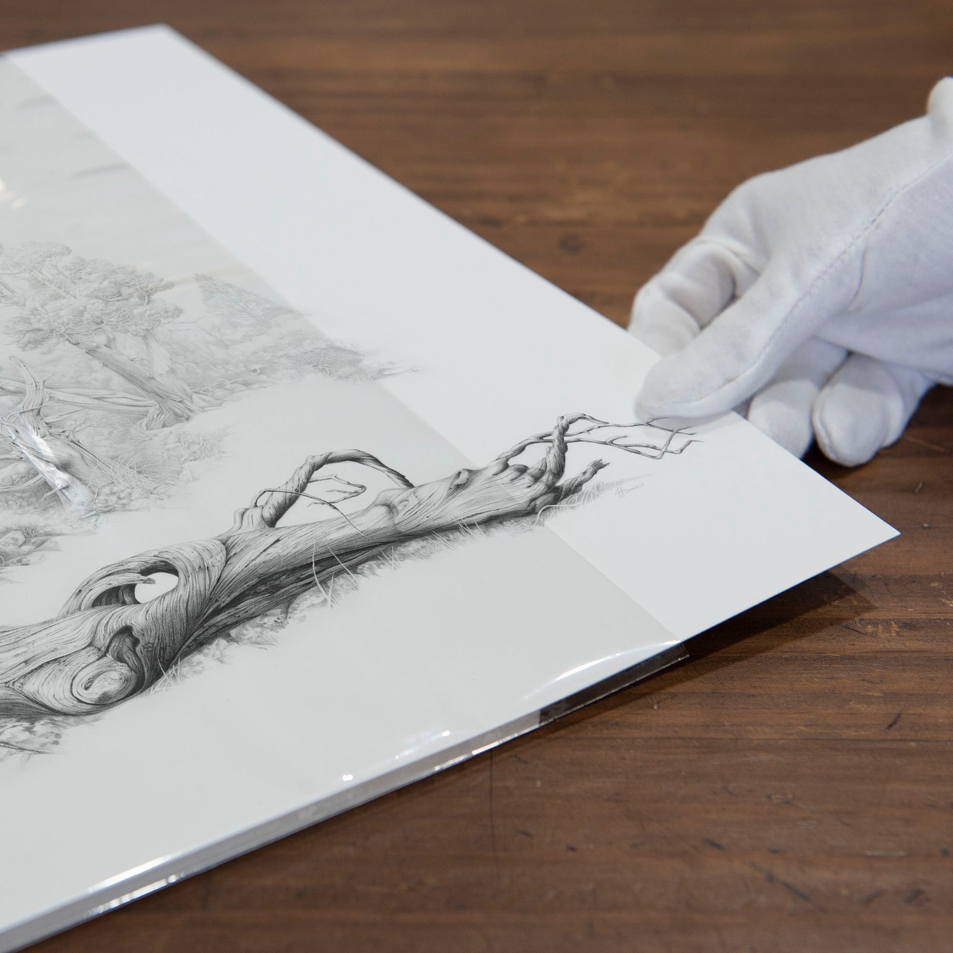 Archival print on cotton art paper. Detailed pencil and charcoal drawing of a weathered fallen tree in the shape of a woman.