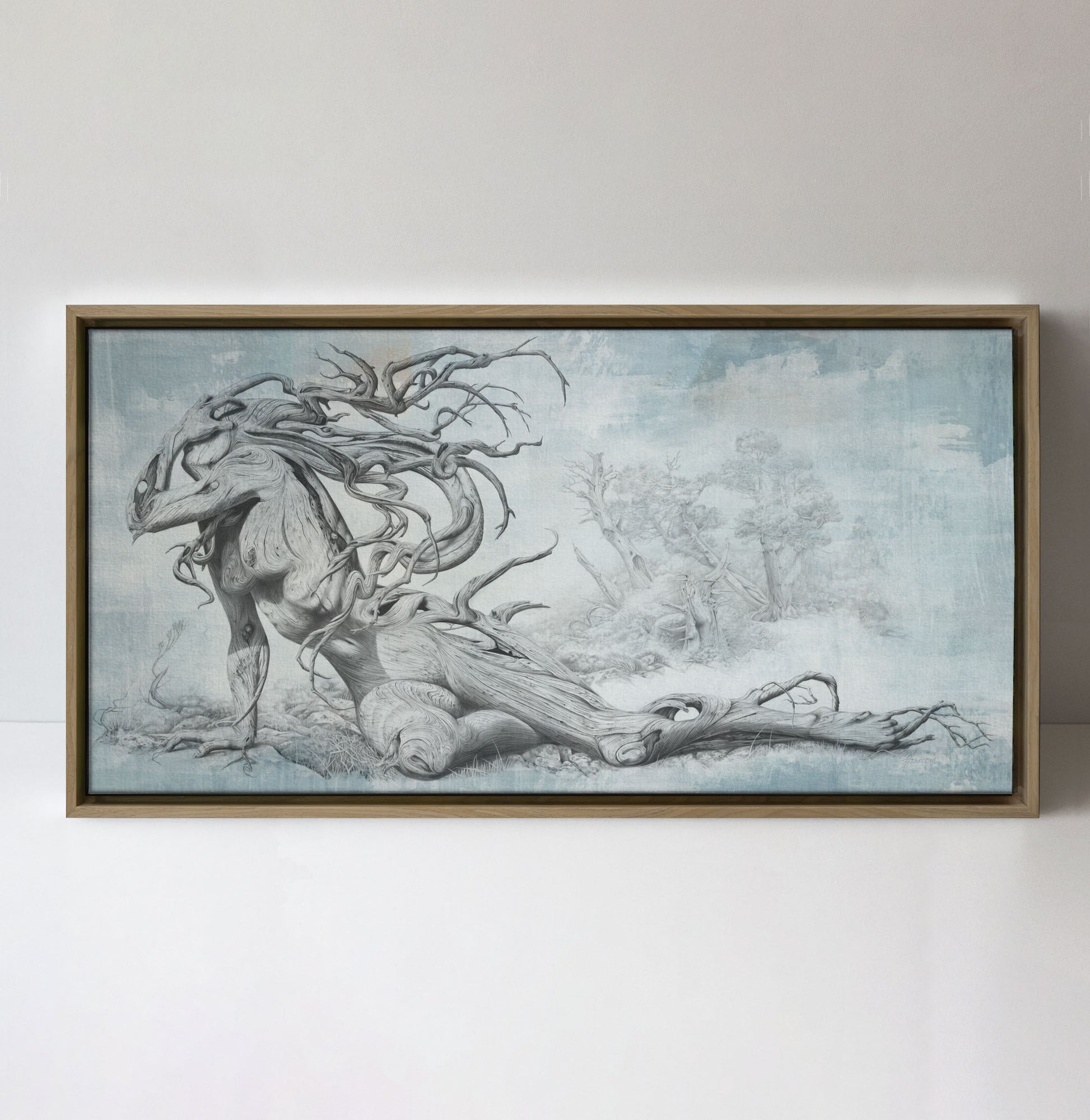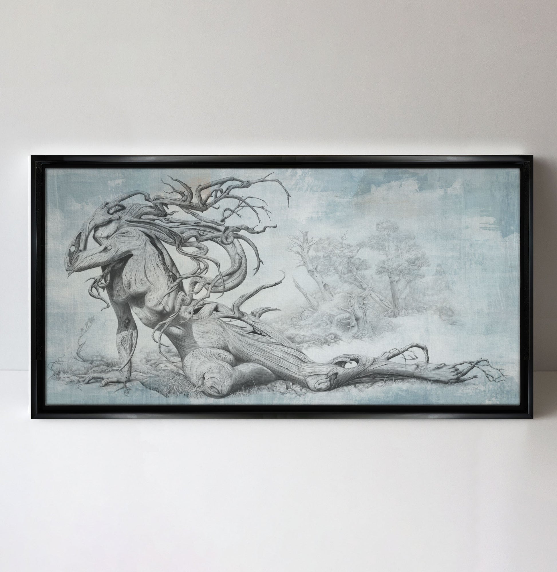 Detailed pencil and charcoal drawing of a weathered fallen tree in the shape of a woman on a blue textured background.