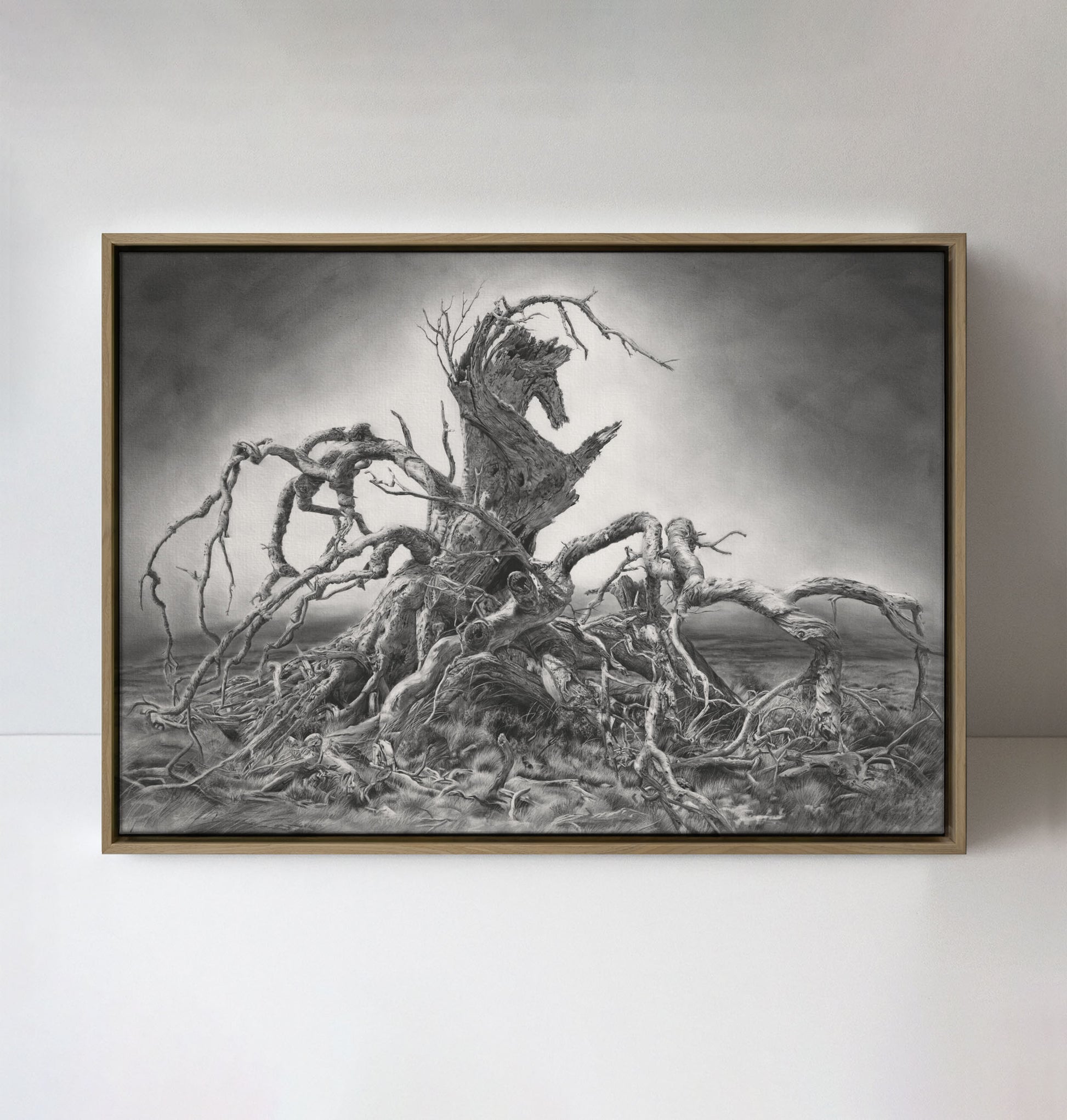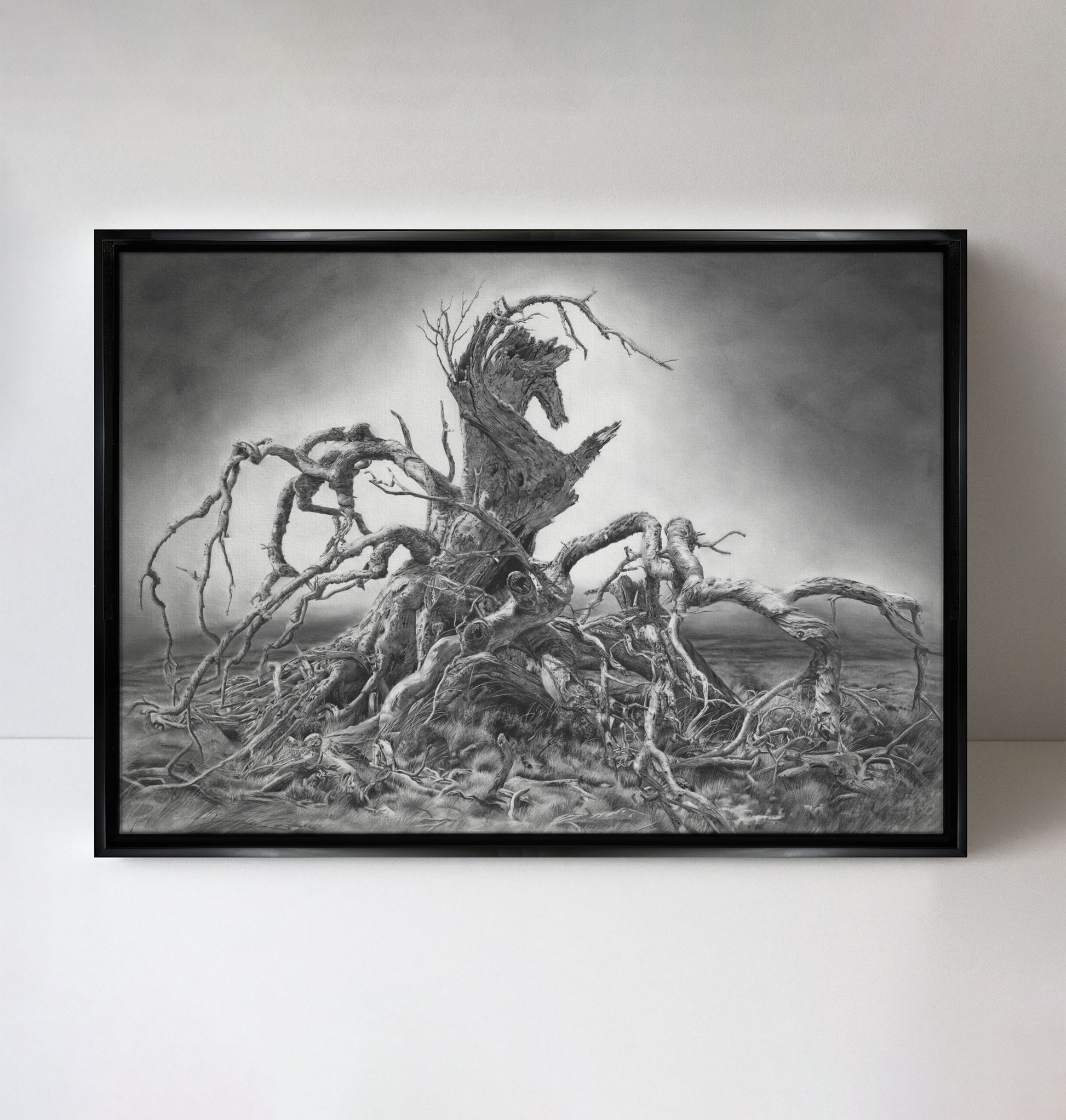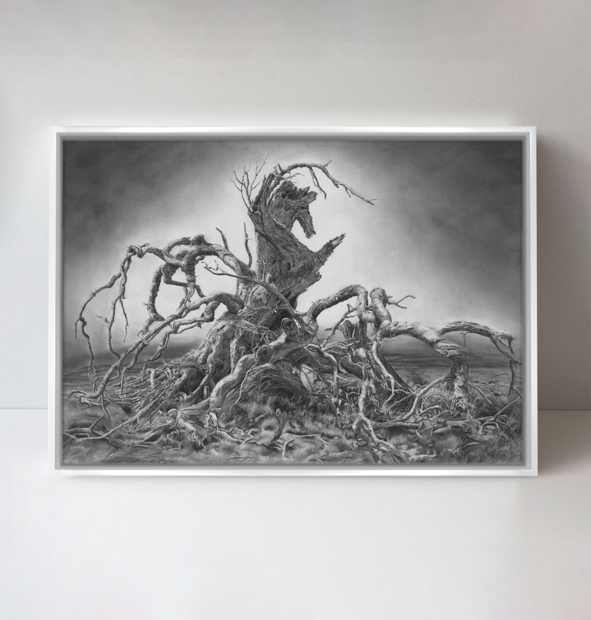 Charcoal and graphite pencil drawing of an old weathered tree in the form of a rearing horse. The art piece is a commentary on an endangered tree species from the central plateau of Tasmania, the Miena Cider Gum. Finalist in the Hadley's Art prize 2024, the richest landscape art prize in Australia, this piece is my second largest drawing to date.