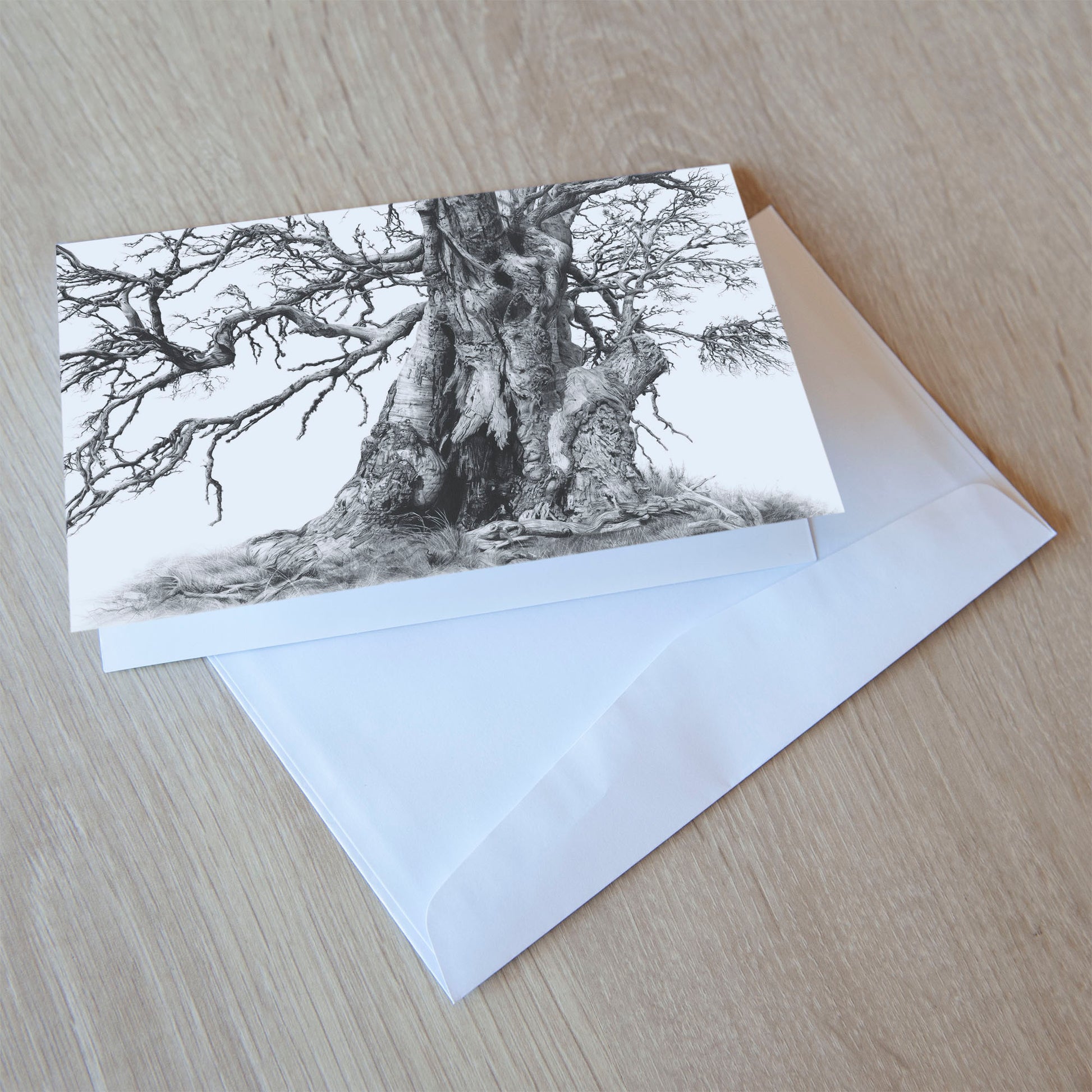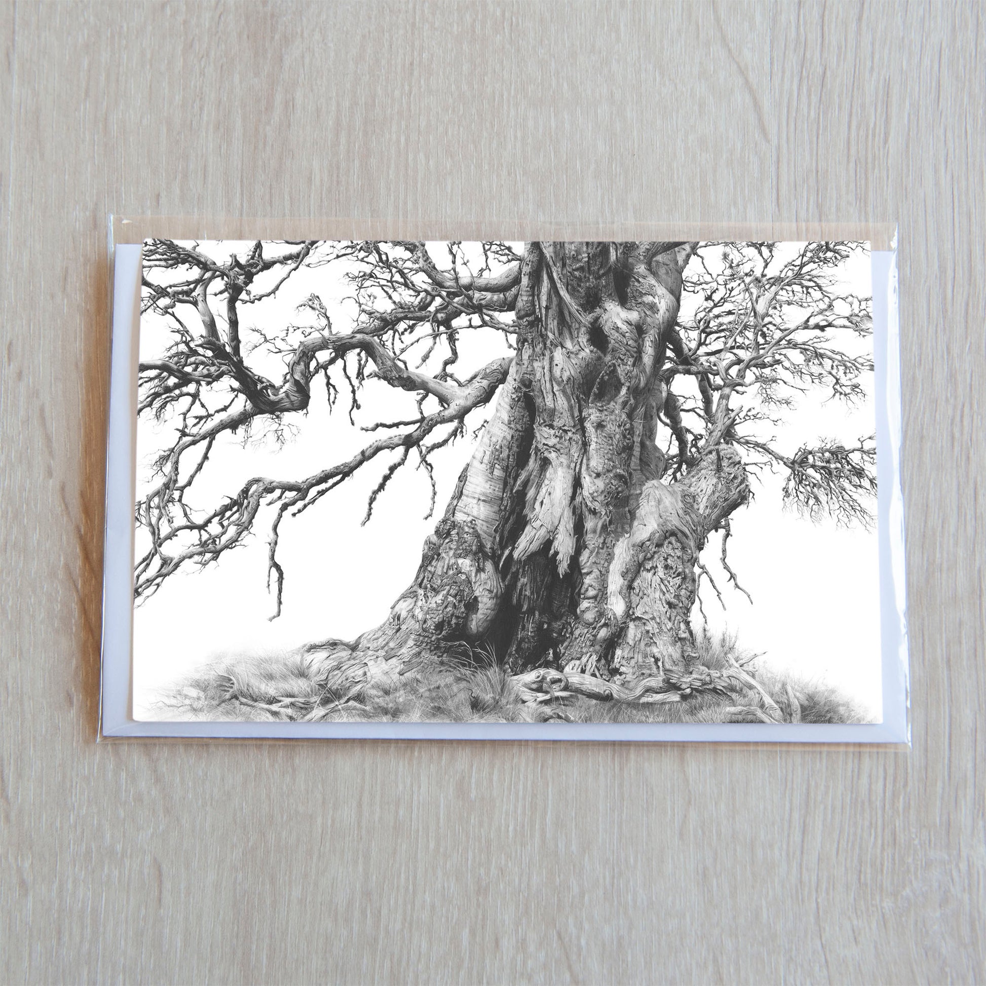 Glossy greeting card featuring 'Tree Elder 1' charcoal and graphite pencil drawing. Folded card is 11.5 x 18cm, blank inside and comes with envelope sealed in a clear cello bag.