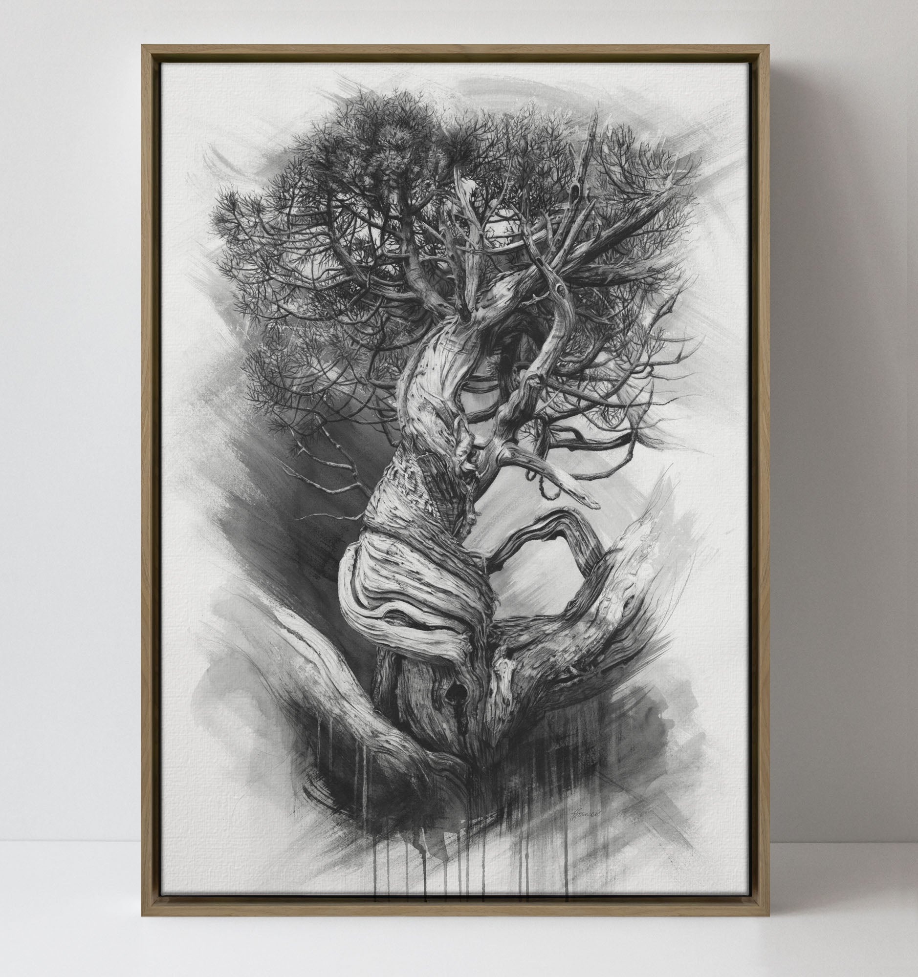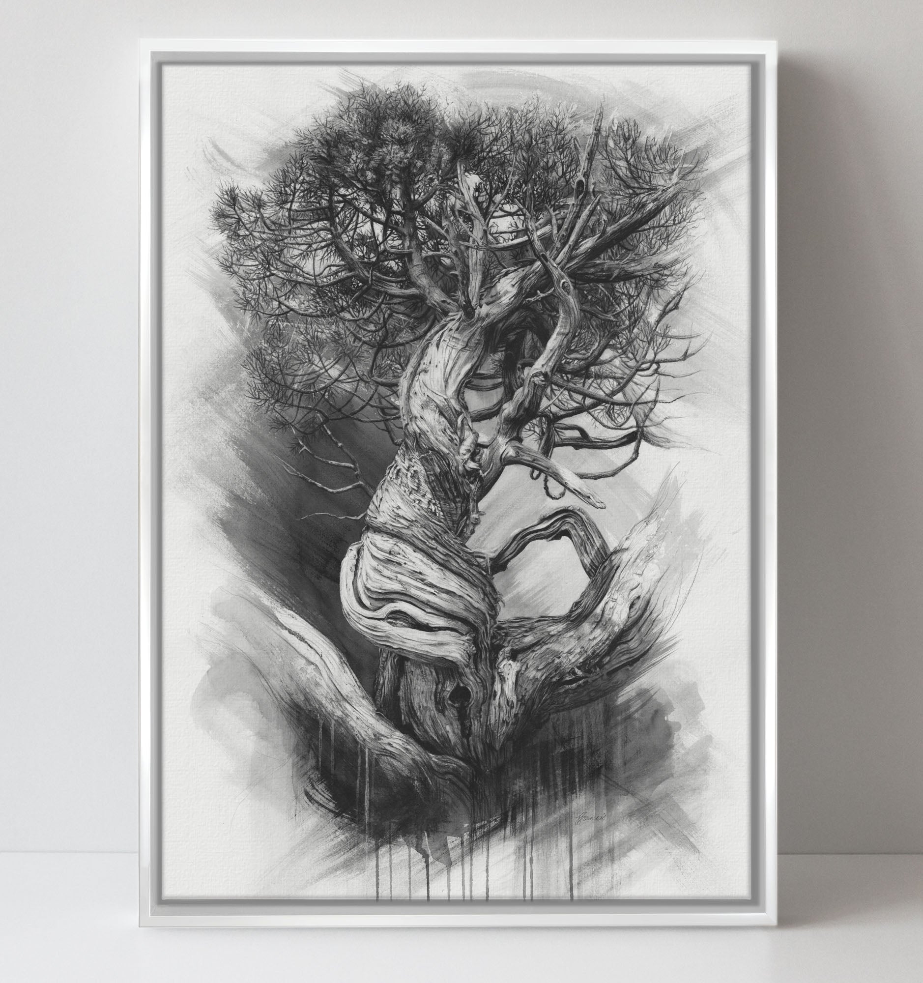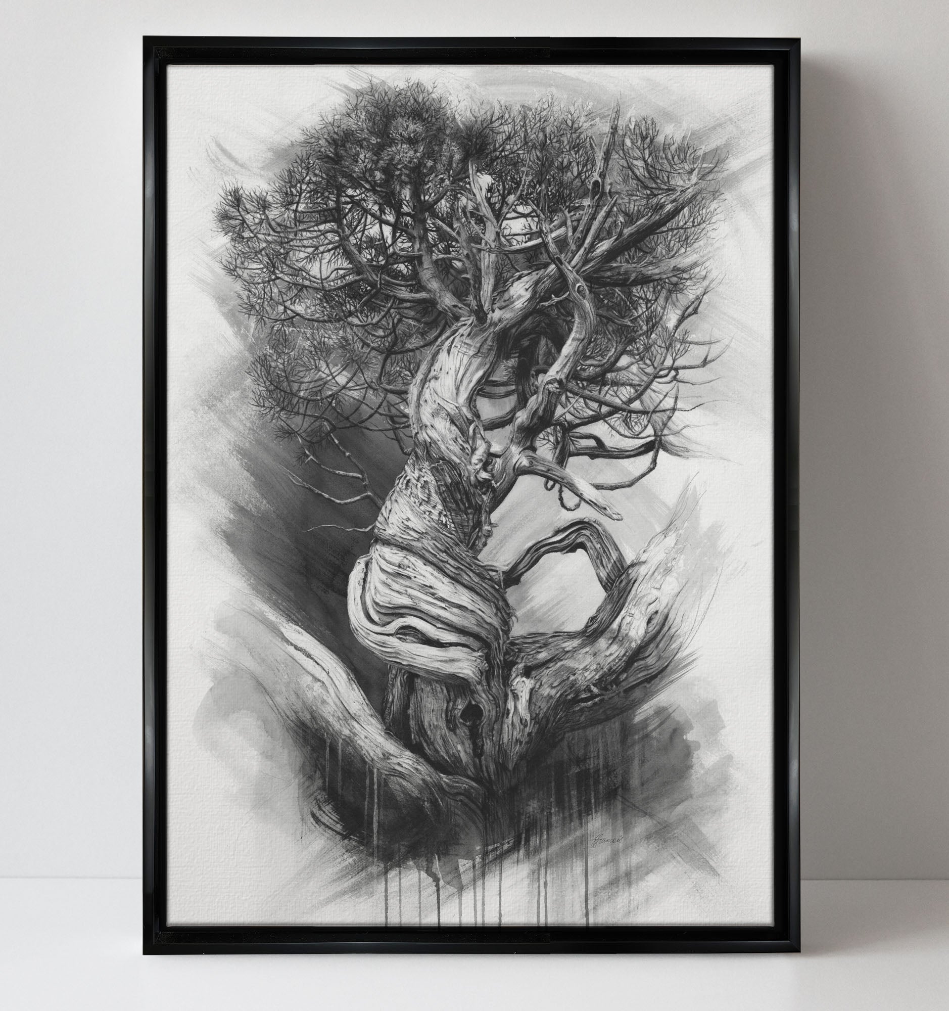 Charcoal and graphite pencil drawing of a twisted Tasmanian Pencil pine from Pine Lake, Tasmania.