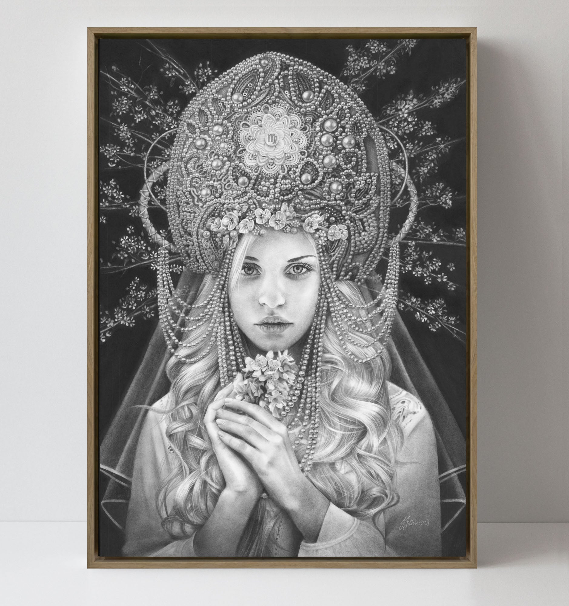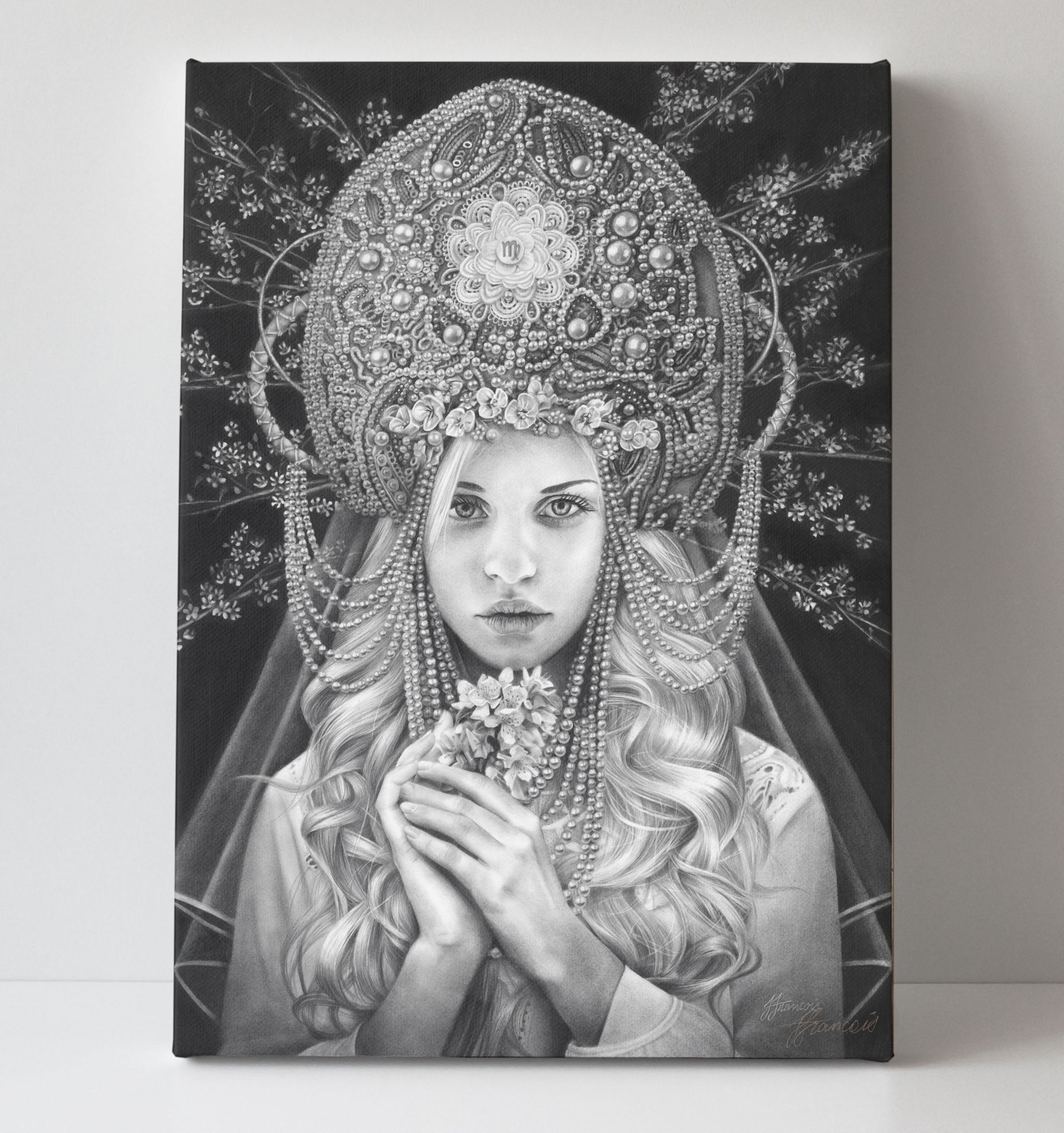Sixth in the Zodiac series. Charcoal and pencil drawing of a woman personifying the Virgo attributes.