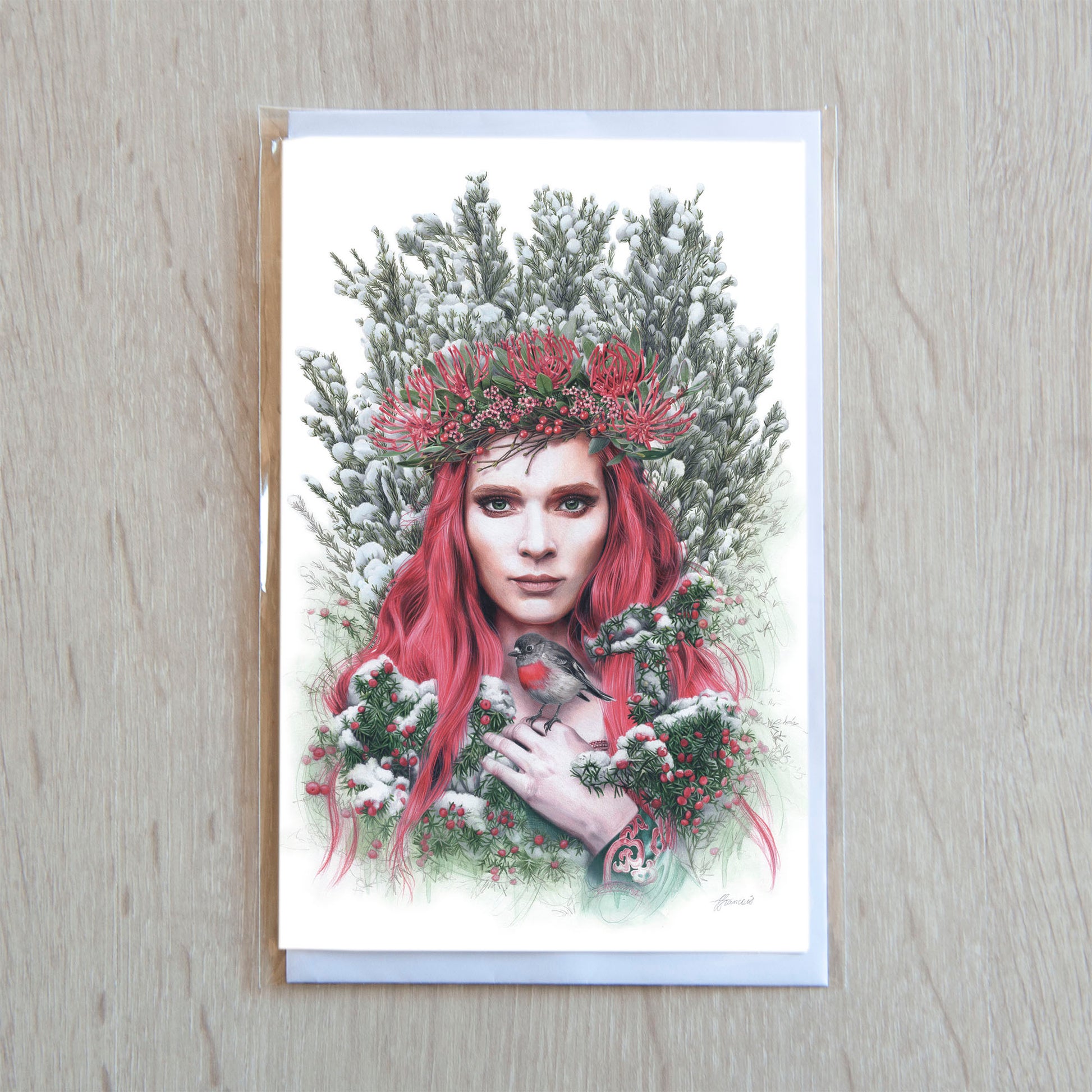 Glossy greeting card featuring 'Waratah Queen' colour pencil drawing. Folded card is 11.5 x 18cm, blank inside and comes with envelope sealed in a clear cello bag.