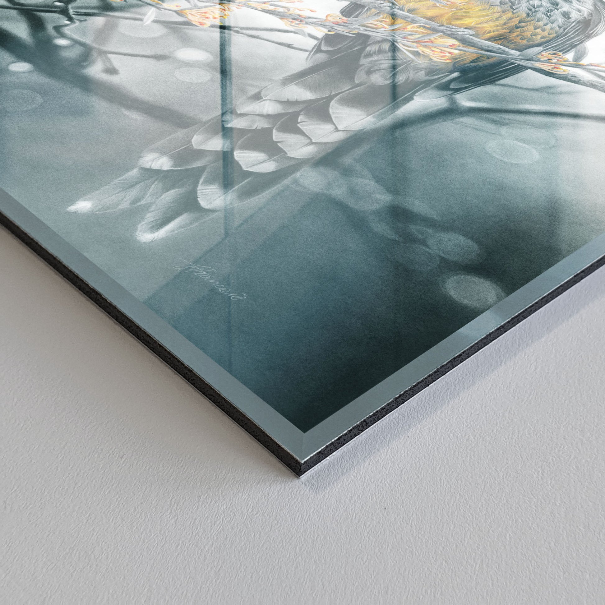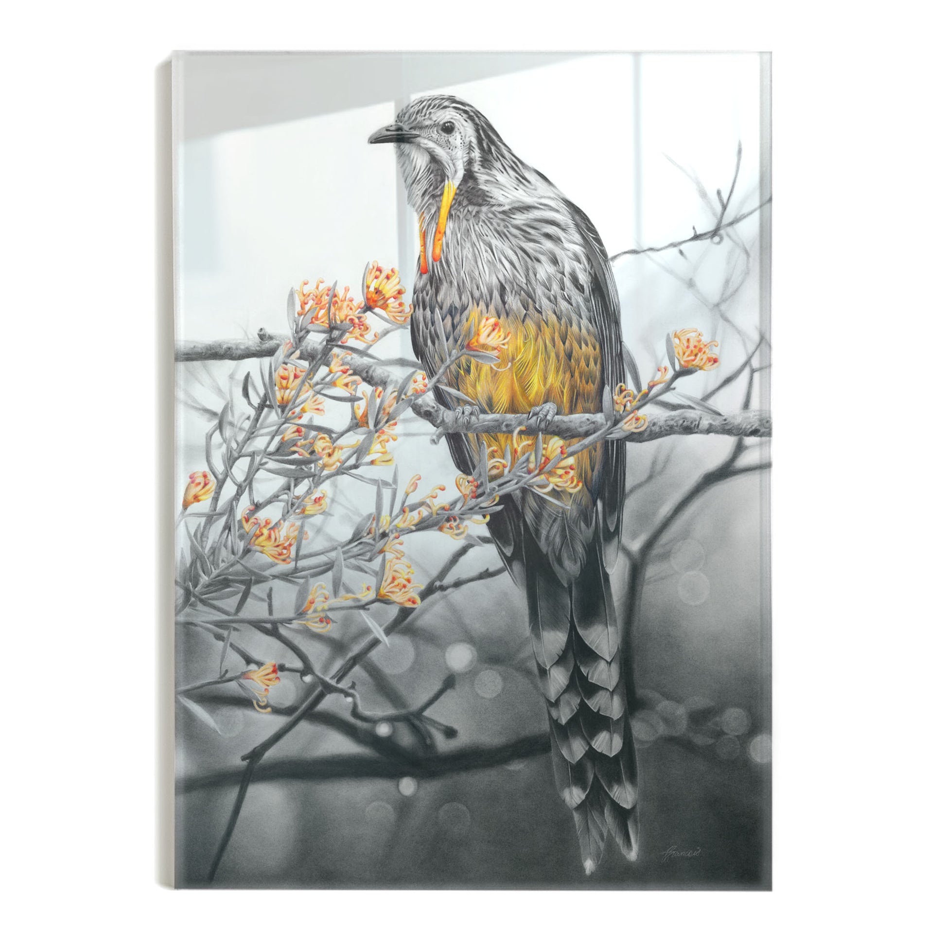 Acrylic print of 'Yellow Wattlebird' charcoal and colour pencil drawing. This contemporary frameless art print is perfect for adding a touch of class to your interior. High quality image printed on 6mm acrylic glass panel using the latest technology. Prints are water resistant and are suitable for hanging in bathrooms, kitchens and other wet areas. Quality fittings are mounted on the back of the print to allow for easy hanging from a standard picture hook. Larger prints have 2 fittings.