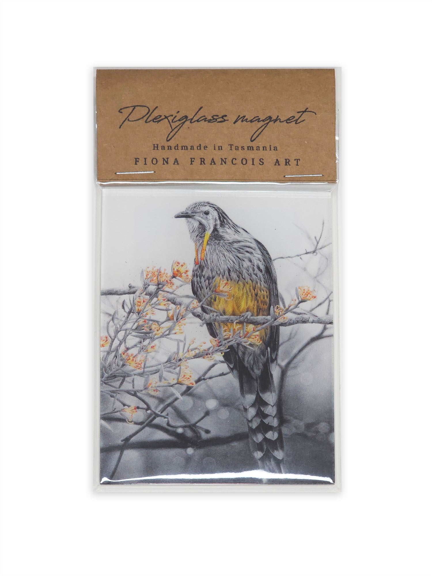 Acrylic glass fridge magnet featuring 'Yellow Wattlebird' drawing by Fiona Francois.